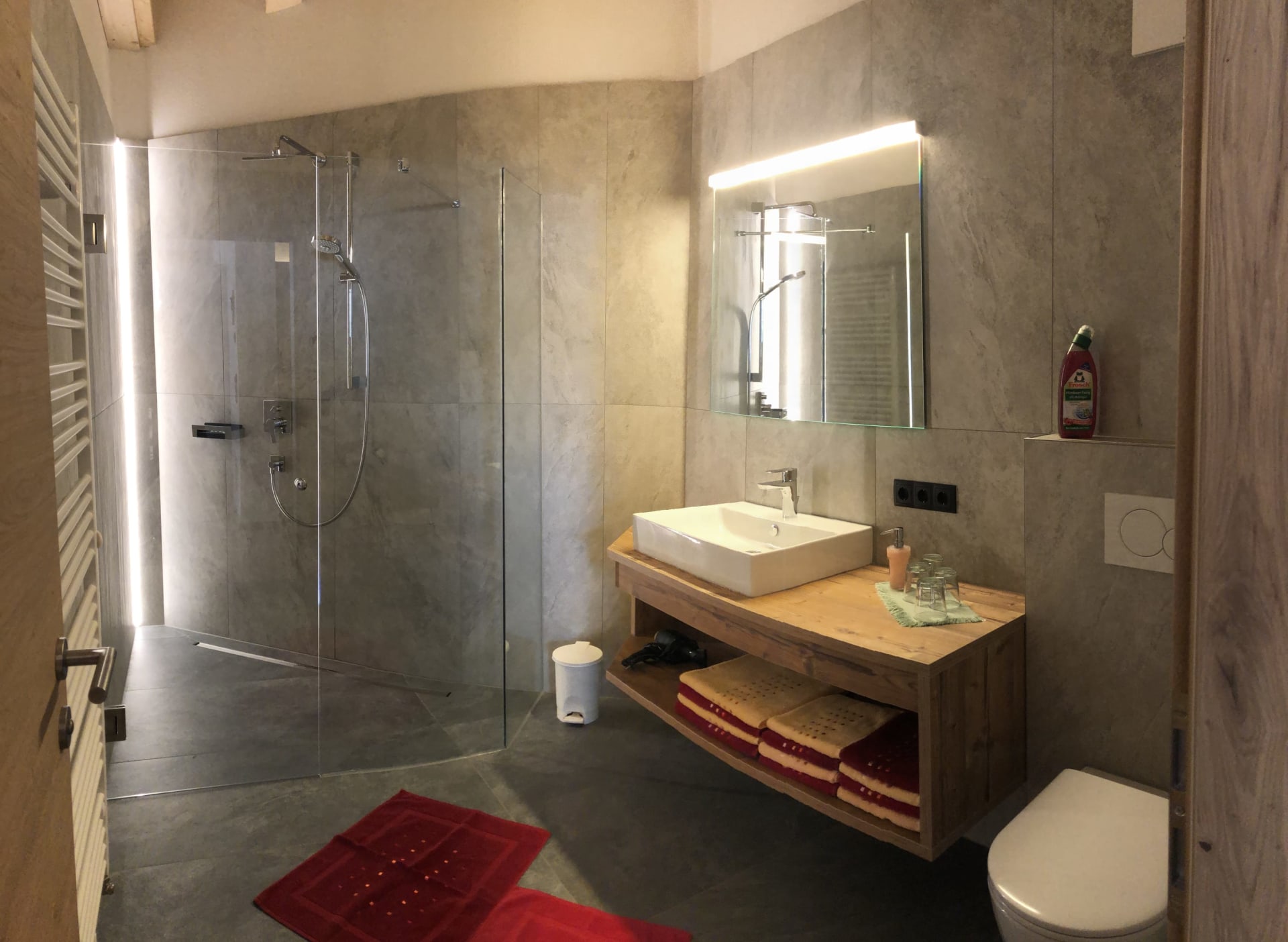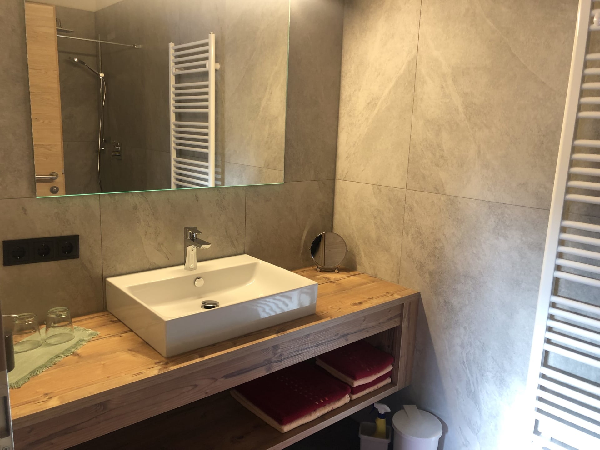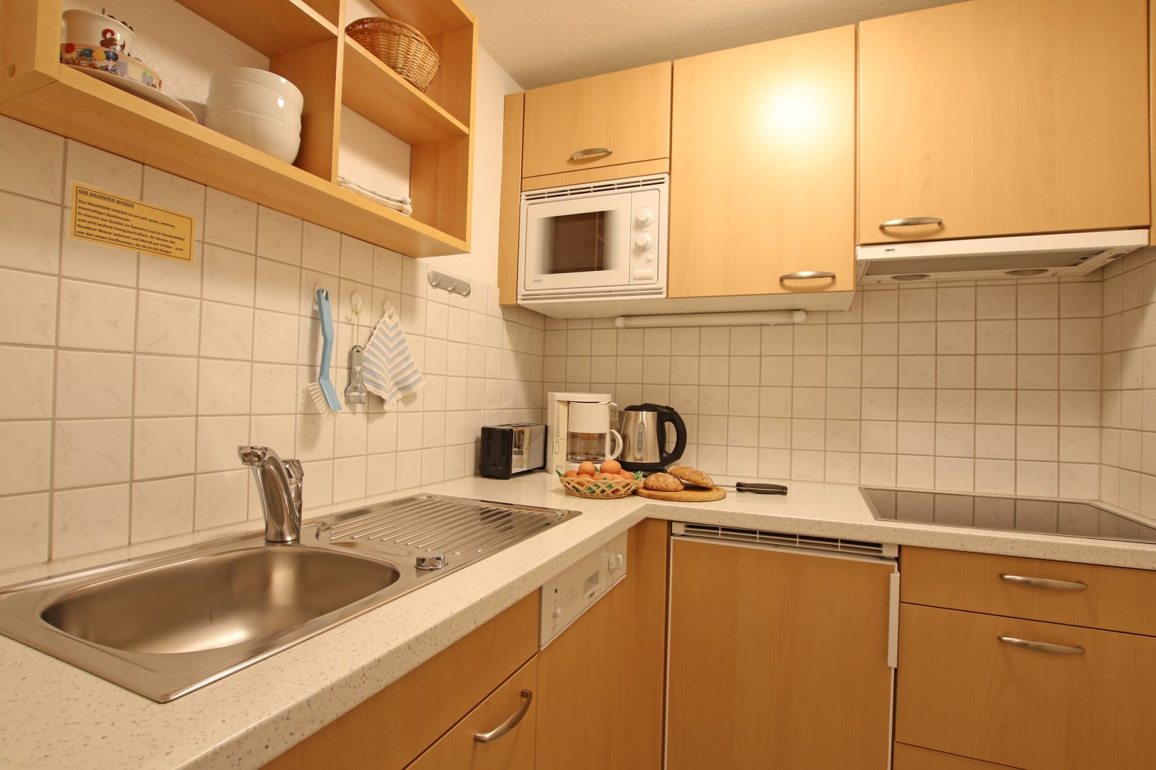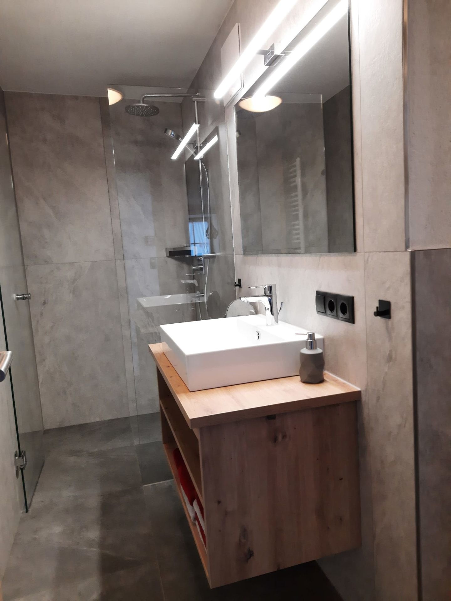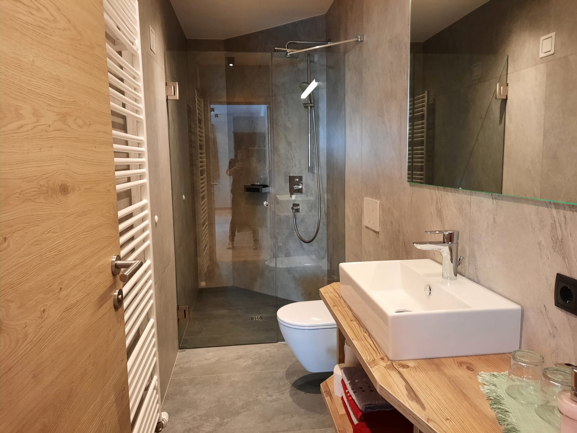 Du wohnst in einer hellen, modernen Küche mit Eichenboden, Essplatz für 4 Personen und TV. Einem neuen Badezimmer mit Walk-In-Dusche, Waschtisch und WC und einem Vorraum mit Garderobe.
