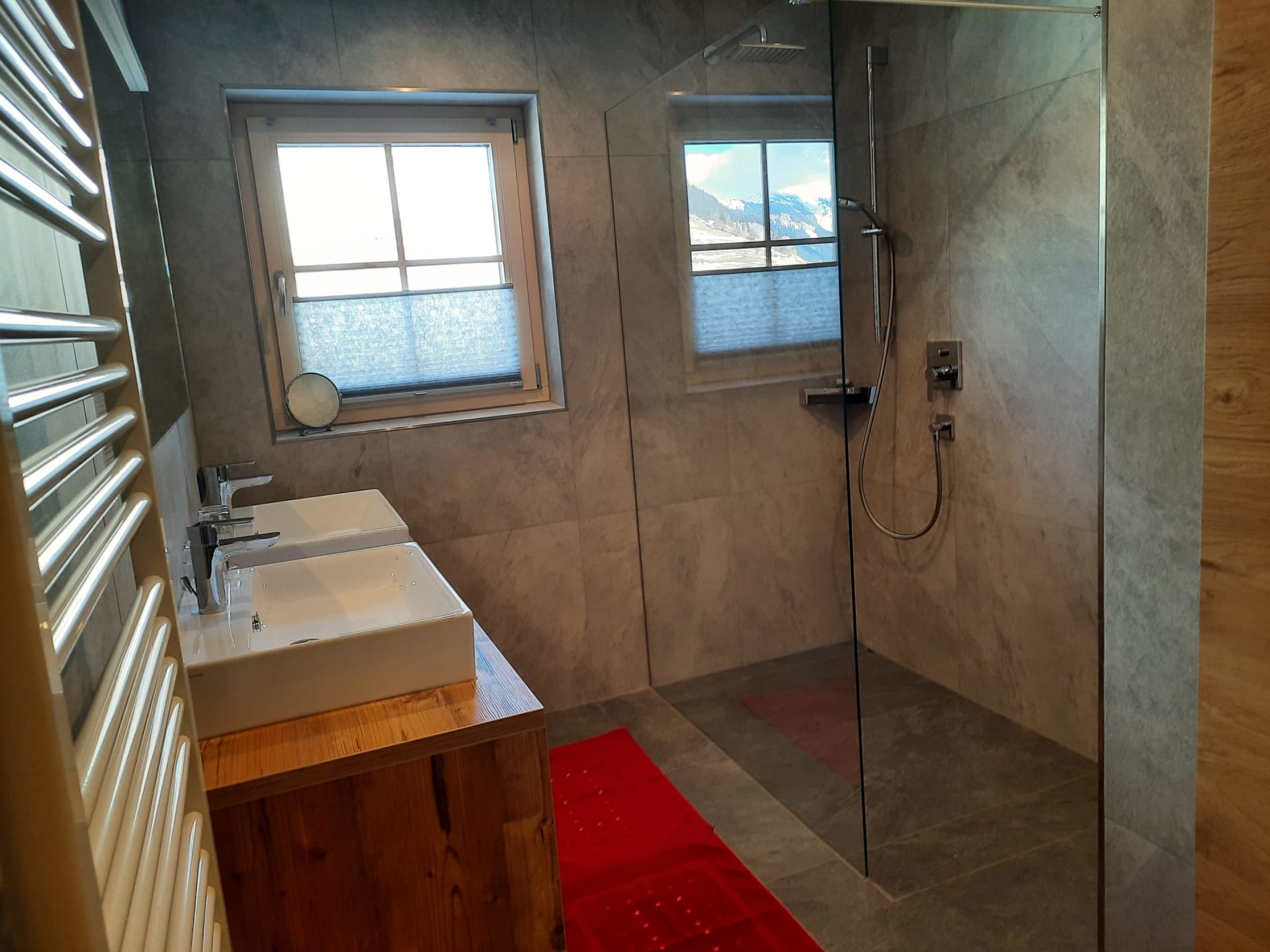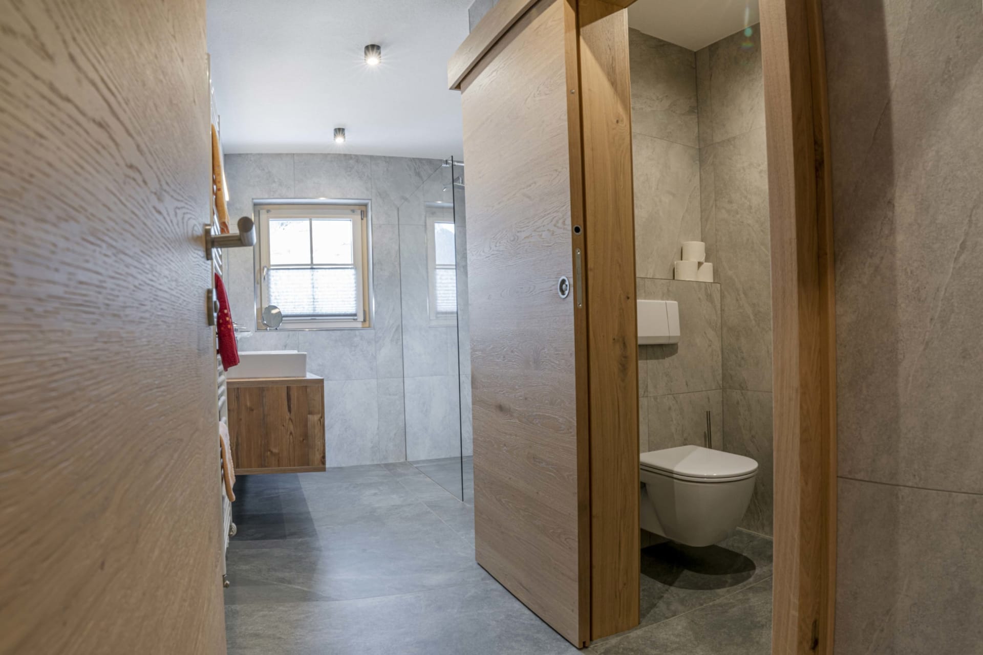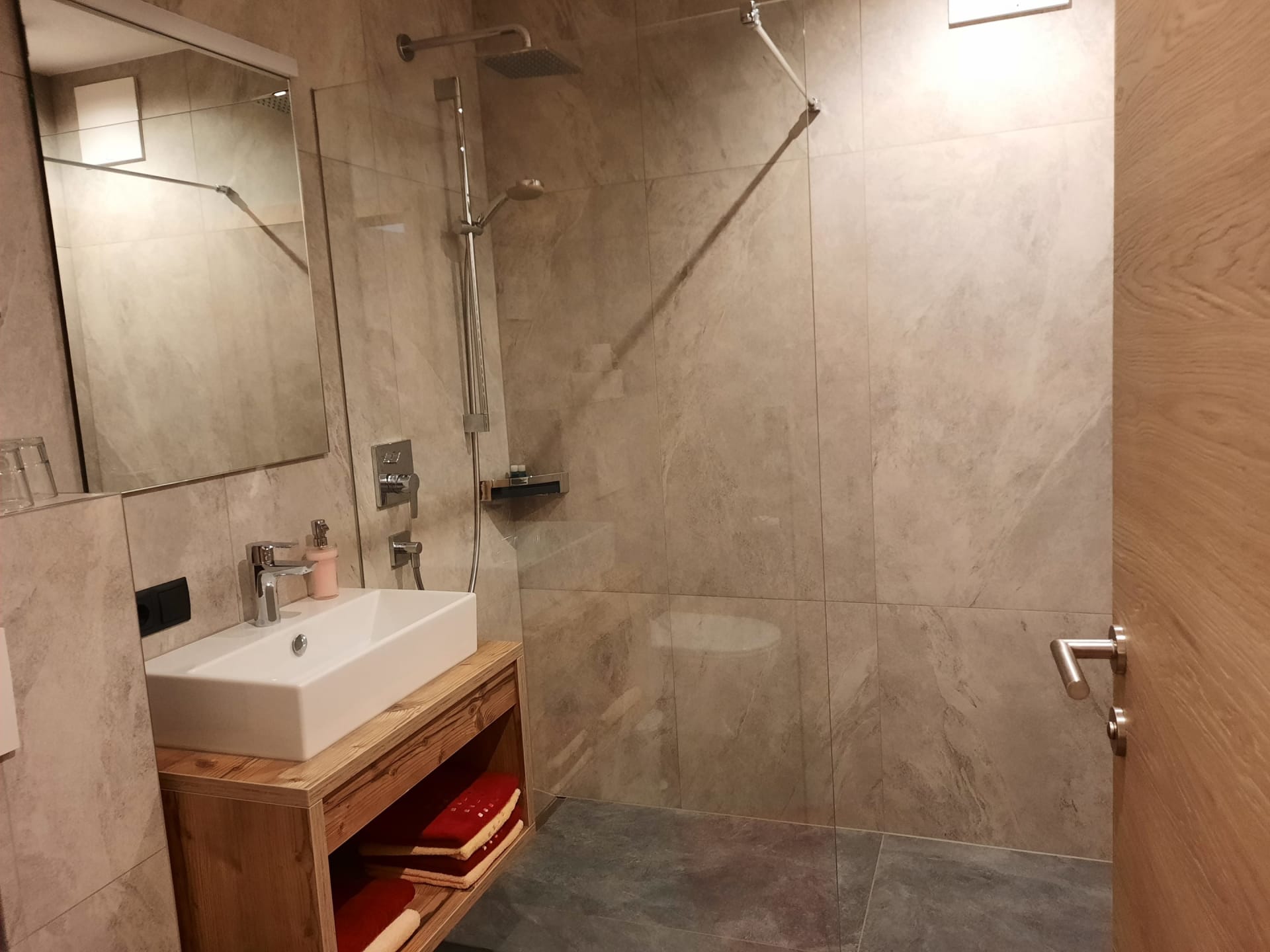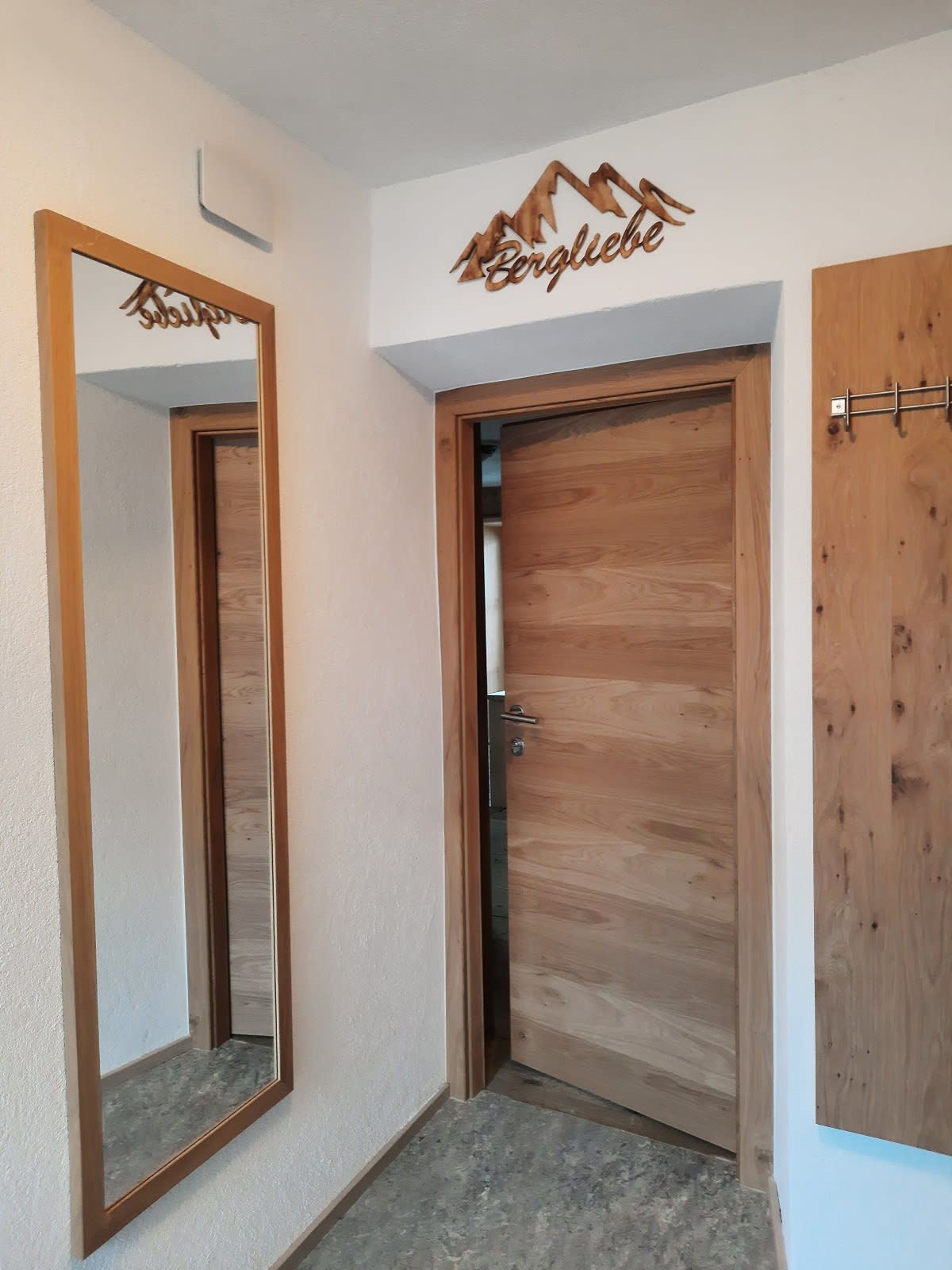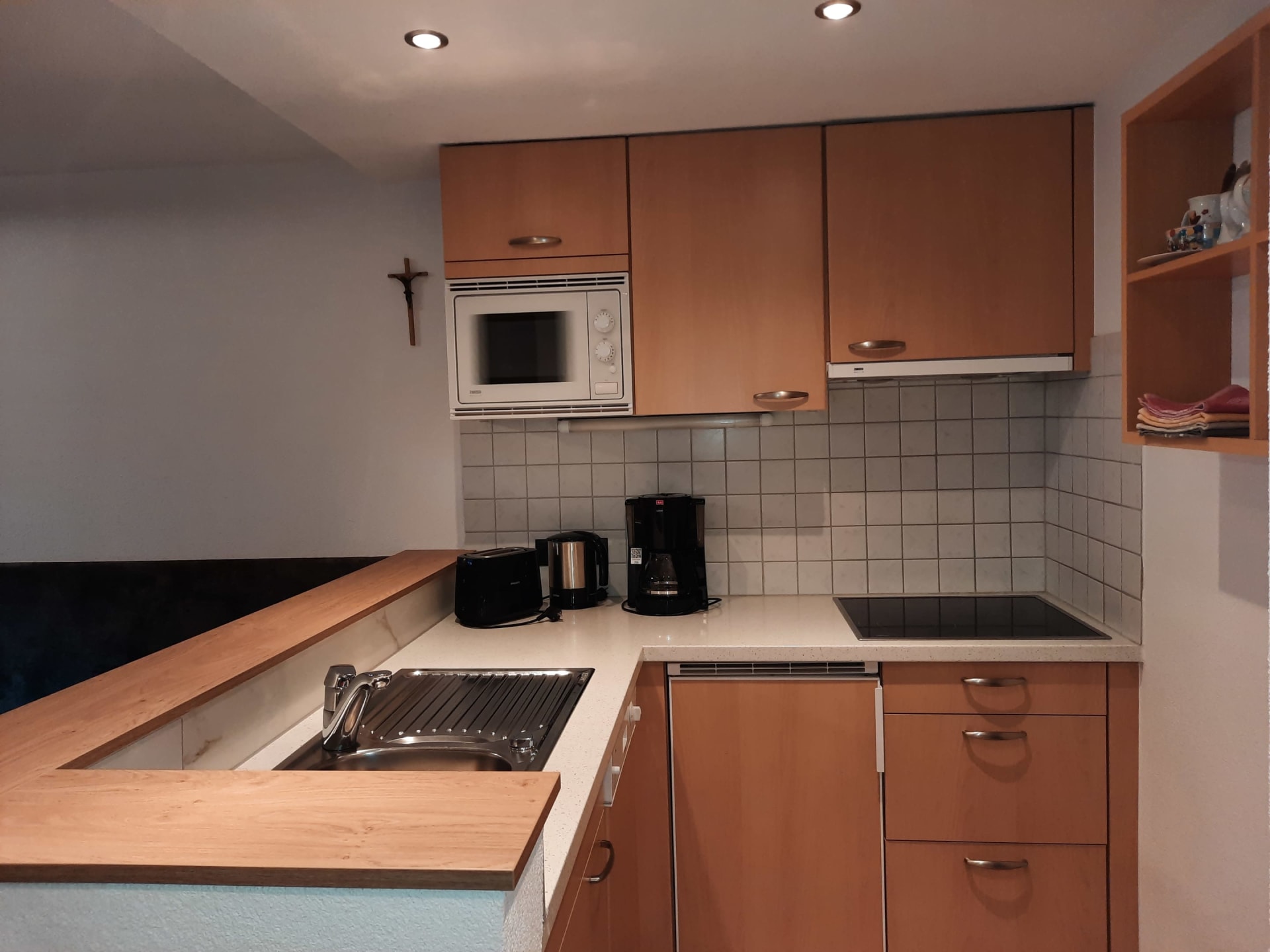 Du wohnst in einer hellen, modernen Küche mit Eichenboden, Essplatz für 4 Personen und TV. Einem neuen Badezimmer mit Walk-In-Dusche, Waschtisch und WC und einem Vorraum mit Garderobe.