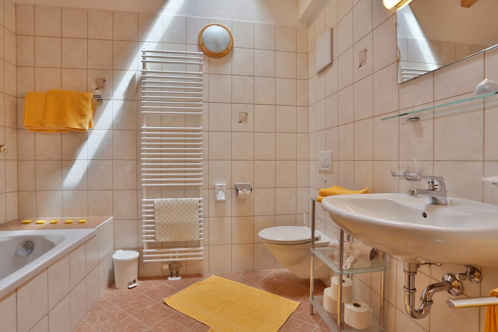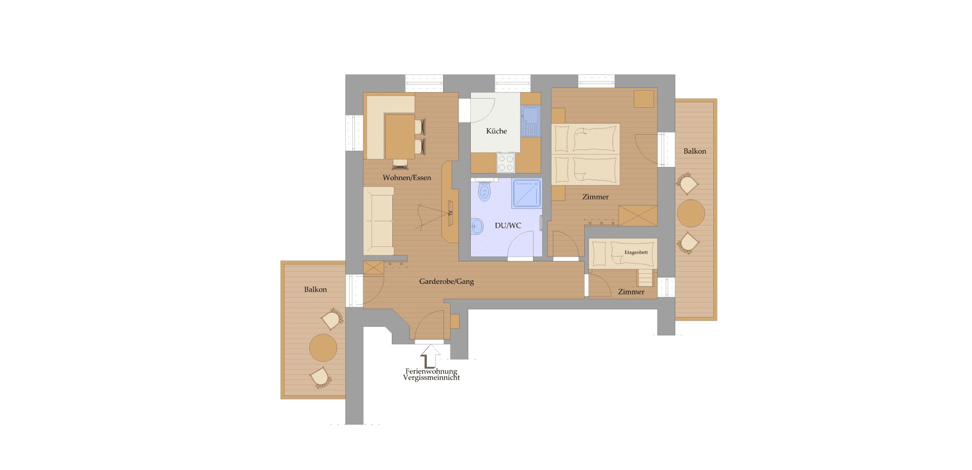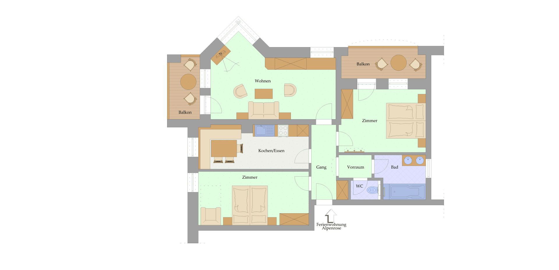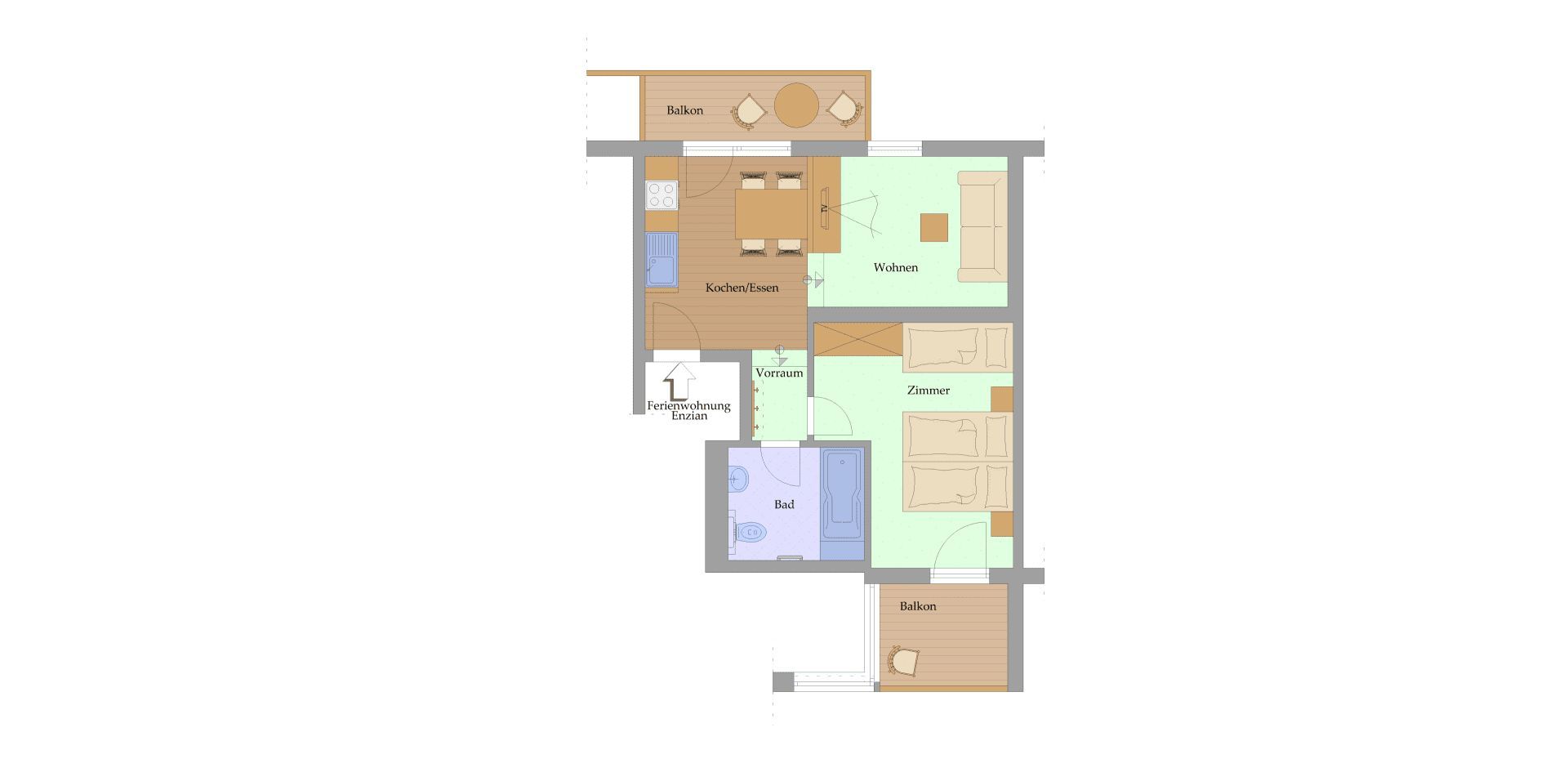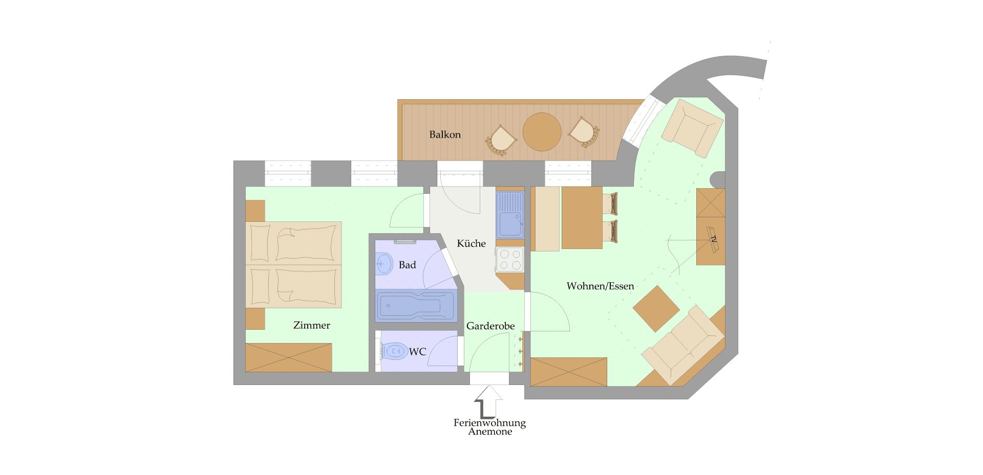 Die Wohnung ist 44 m2 groß, bietet Platz für 2-4 Personen und ist somit ideal für Pärchen und kleine Familien. Du erreichtst die Wohnung ebenerdig über eine eigene Haustüre, der Eingang zum Rosenhof liegt gleich nebenan.