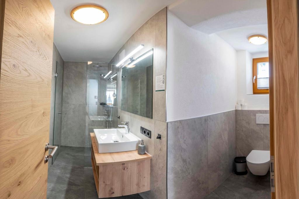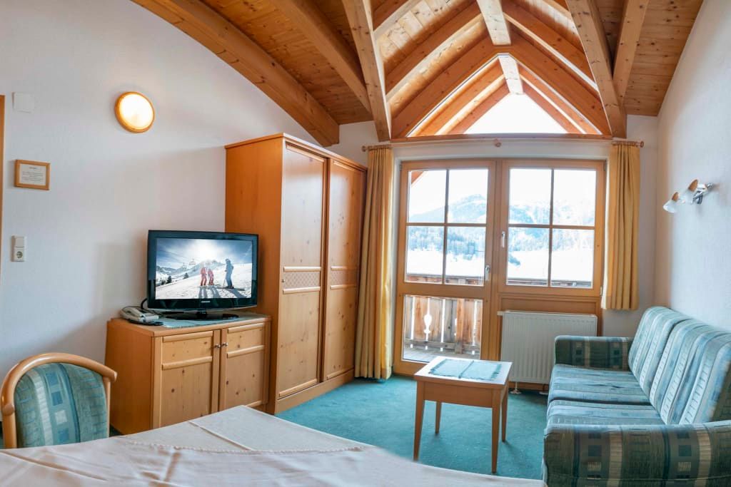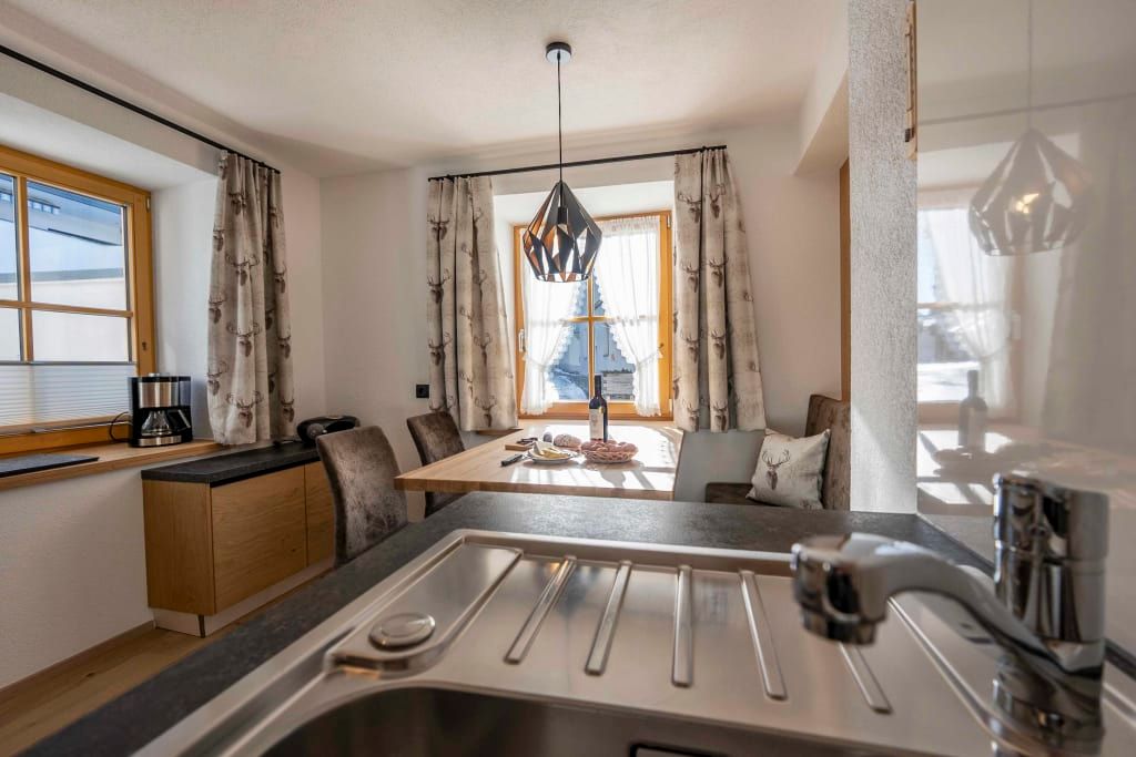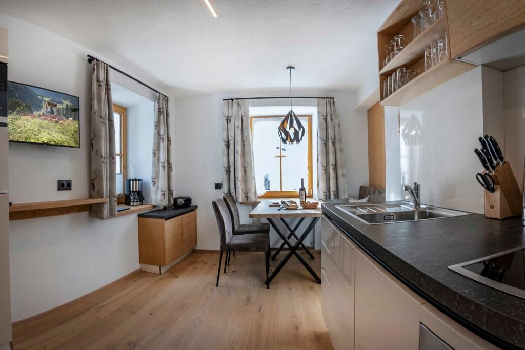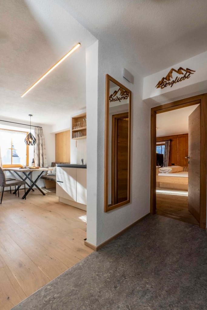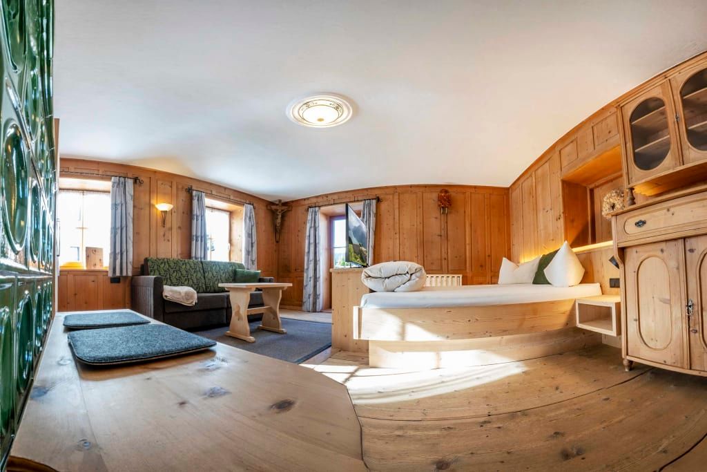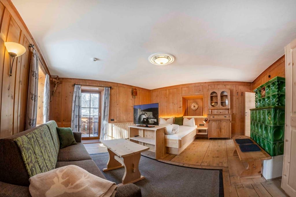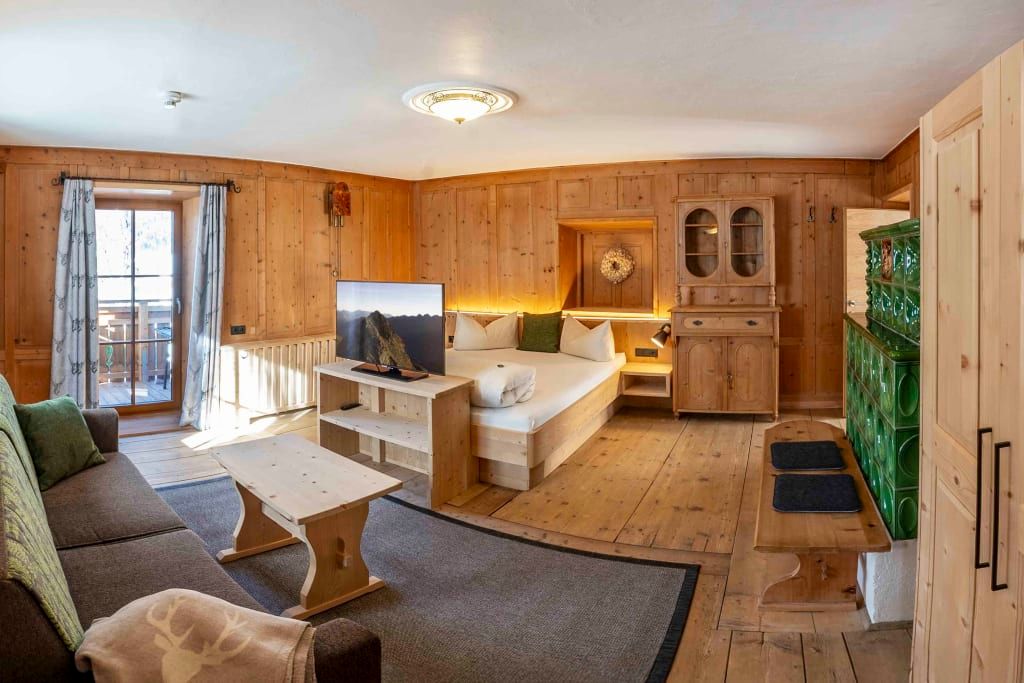 Sie beeindruckt mit ihrer historischen Tiroler Stube aus wohltuendem Fichten- und Zirbenholz und urigem Holzboden. Dort findest du ein Doppelbett und ein hochwertiges Schlafsofa für 2 weitere Personen, eine großzügige Schrankecke und einen TV. Von der Tiroler Stube aus kommst du auf den Westbalkon, wo du die Mittag- und Nachmittagssonne genießen kannst und den Blick auf die Berge.