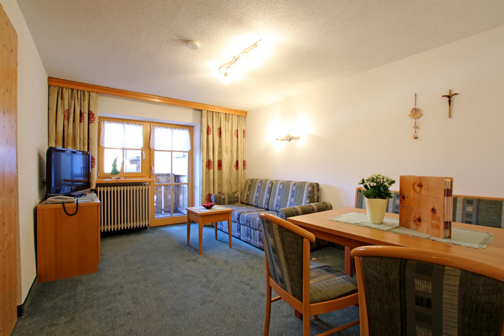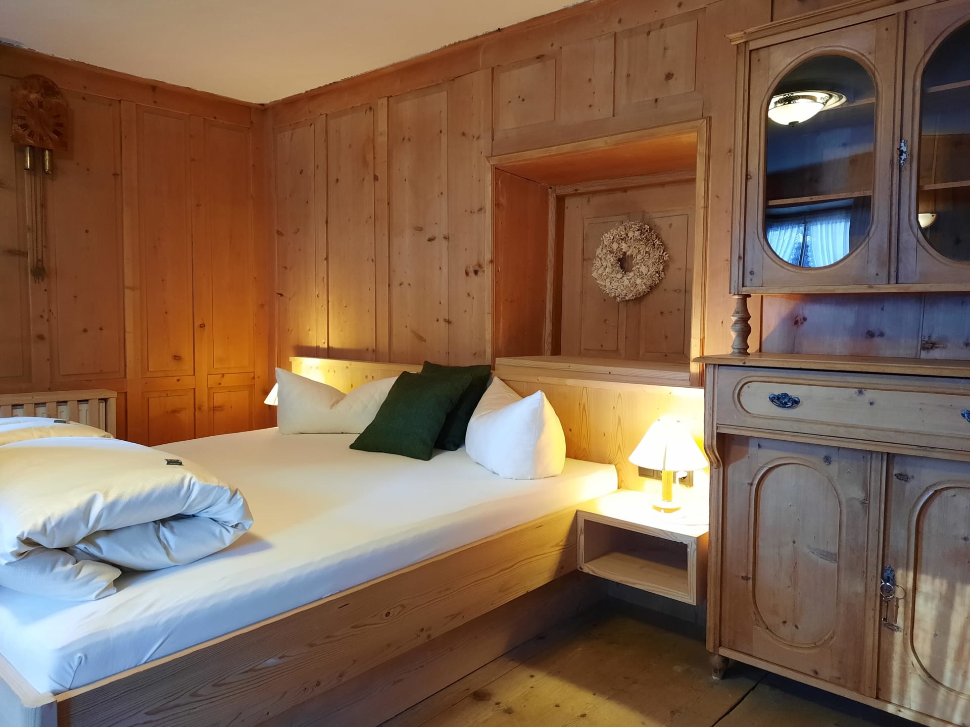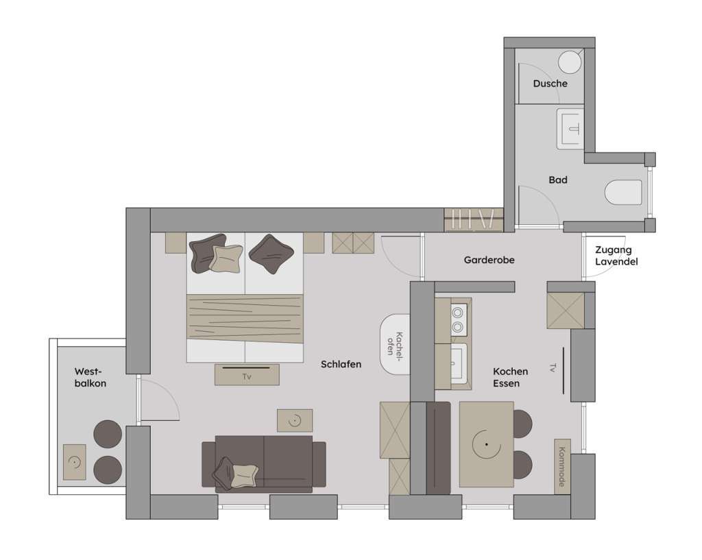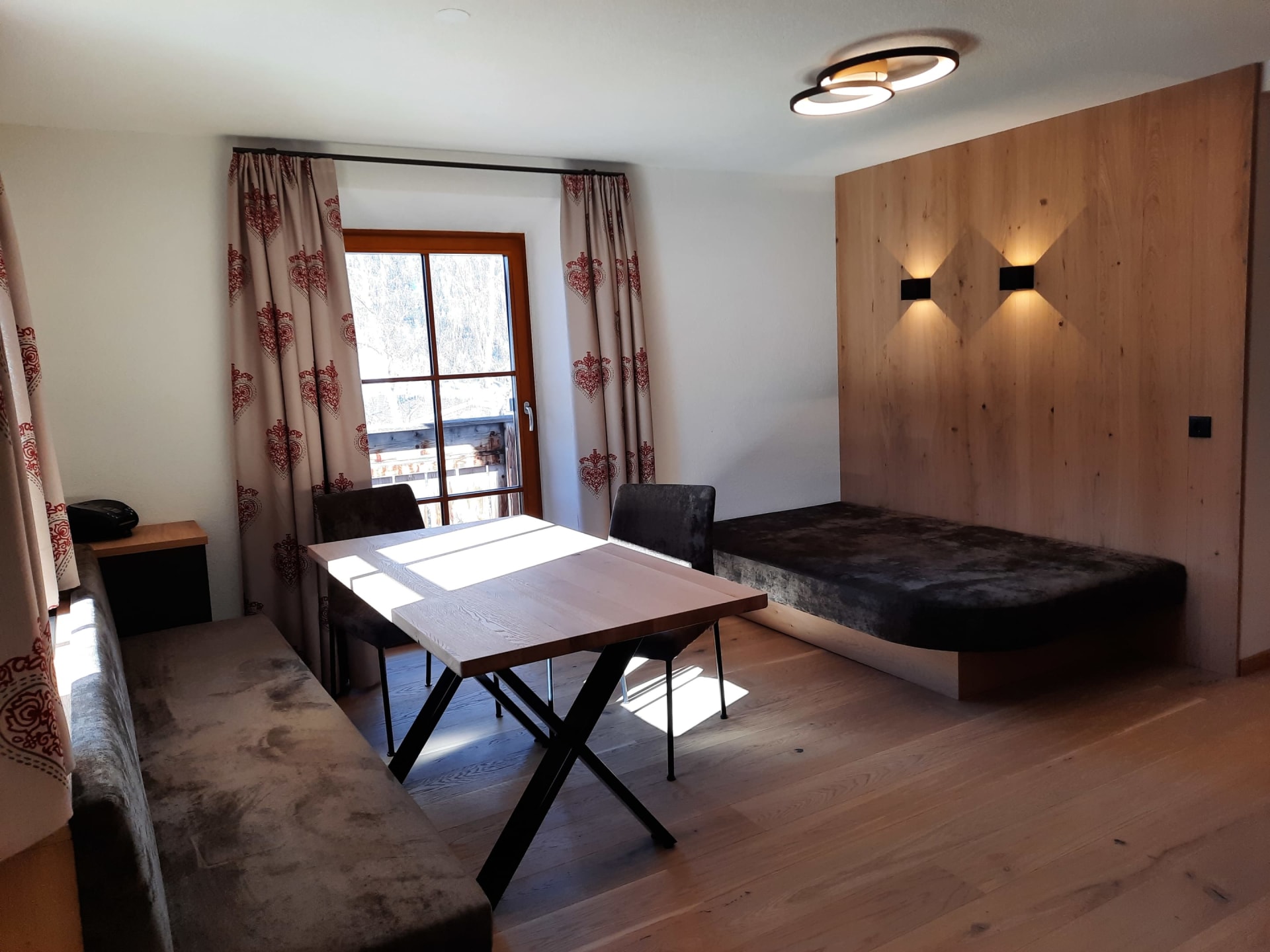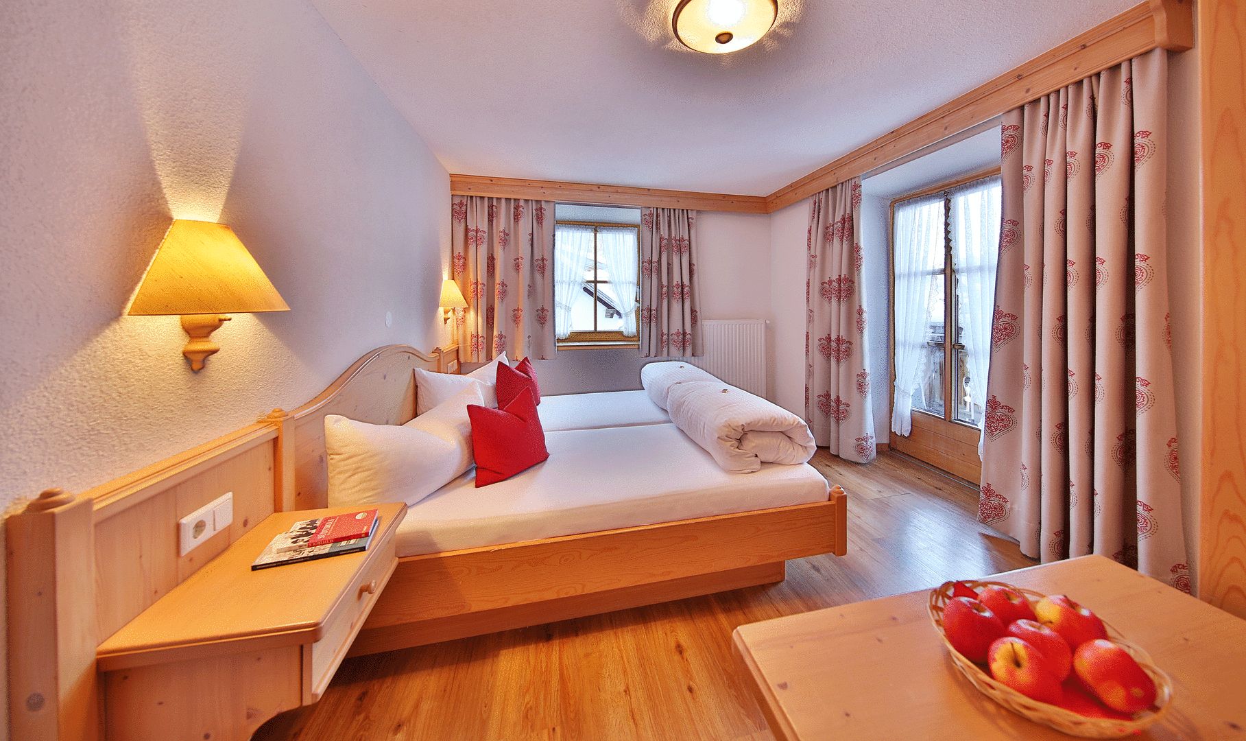 Sie beeindruckt mit ihrer historischen Tiroler Stube aus wohltuendem Fichten- und Zirbenholz und urigem Holzboden. Dort findest du ein Doppelbett und ein hochwertiges Schlafsofa für 2 weitere Personen, eine großzügige Schrankecke und einen TV. Von der Tiroler Stube aus kommst du auf den Westbalkon, wo du die Mittag- und Nachmittagssonne genießen kannst und den Blick auf die Berge.
