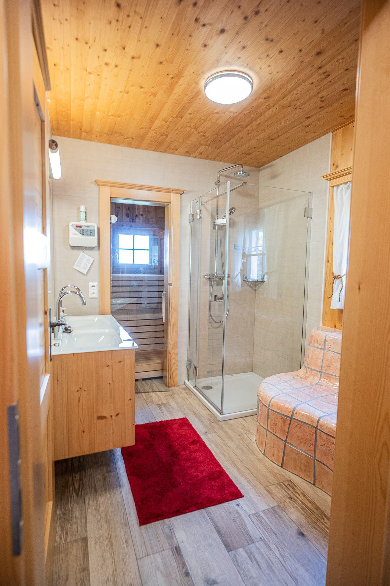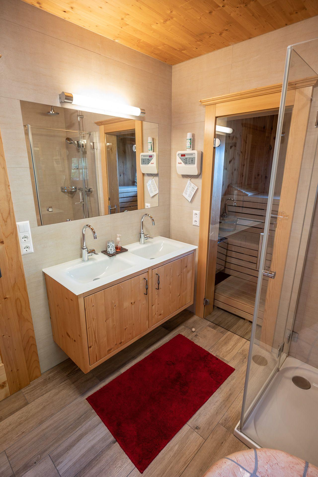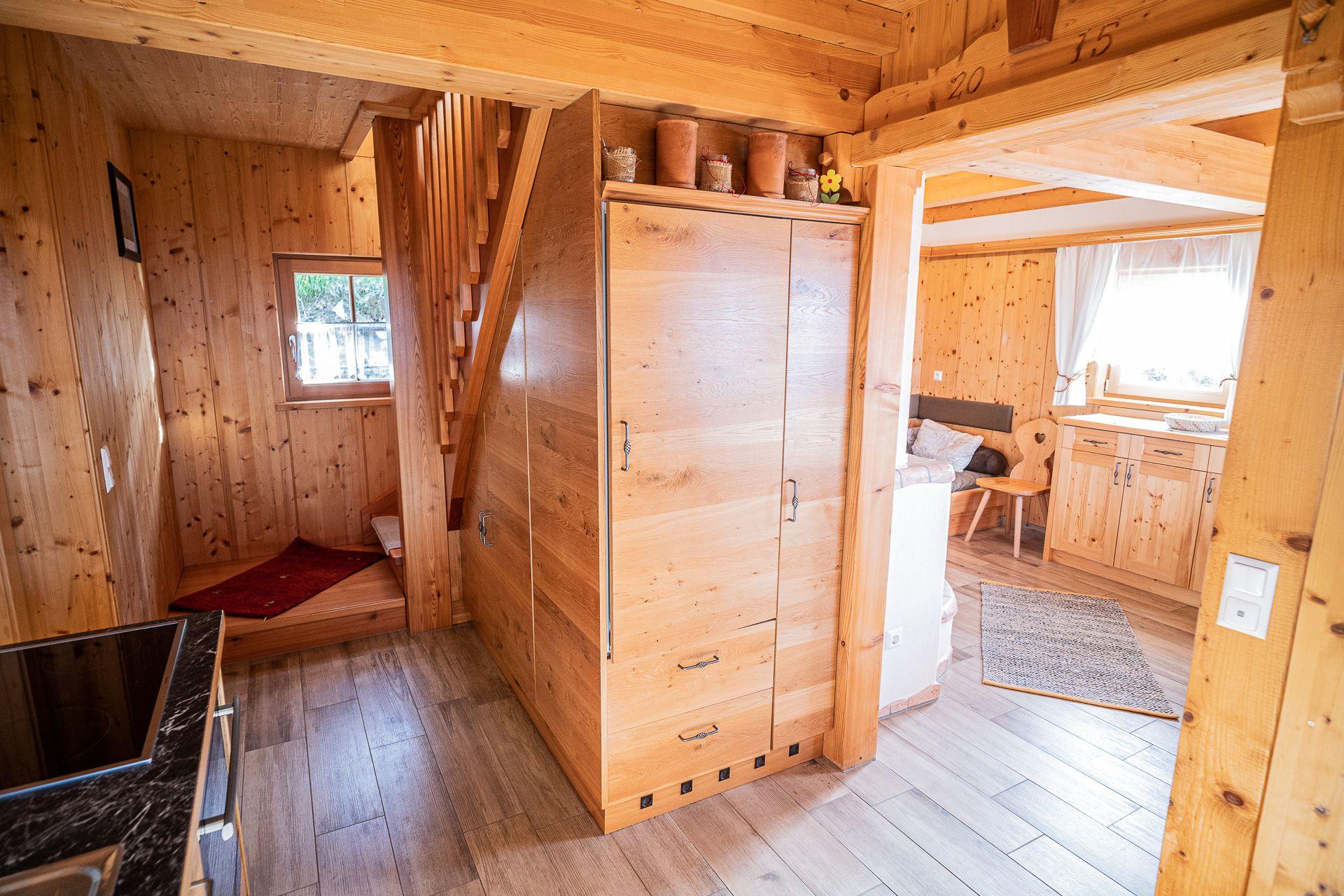 Der Außenbereich des Ferienhauses ist ebenso beeindruckend und lädt mit einer großzügigen Terrasse, ausgestattet mit bequemen Holzliegen und einem Sonnenschirm, zum Verweilen im Freien ein. Der Balkon bietet eine zusätzliche Möglichkeit, die ruhige Umgebung und die schöne Aussicht ins Tal zu genießen. Ein großer Garten zur alleinigen Nutzung und ausreichende Parkmöglichkeiten runden das Bild ab und machen das Haus zu einem wahren Juwel inmitten der Natur.