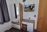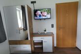 Dopplebettanlage mit Sat-TV (32'' HD TV) und weiterem Einzelbett, Kleiderschrank, Kommode, Tisch und Stuhl sowie Balkon.