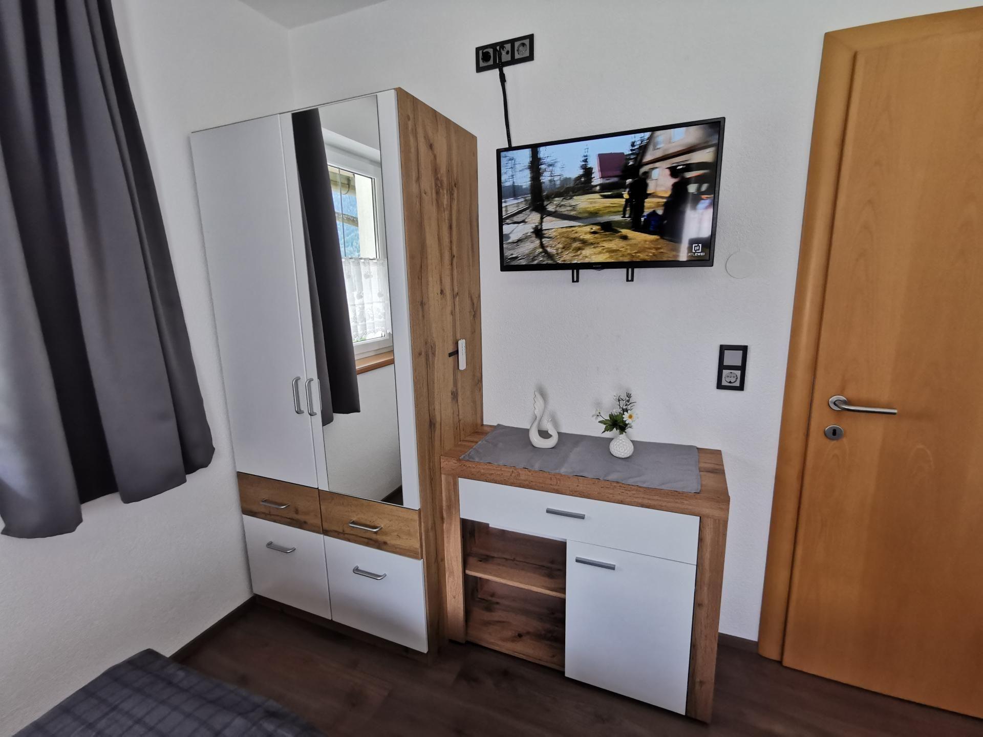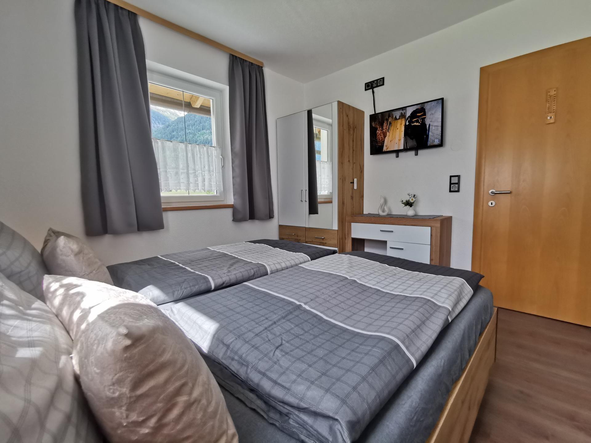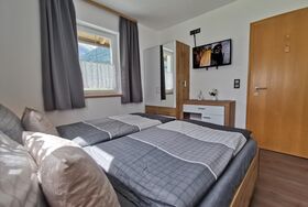 Doppelbett mit Sat-TV (32'' HD TV), Kleiderschrank, Kommode und zwei Fenster mit herrlichem Panoramablick auf die umliegenden Berge.