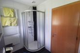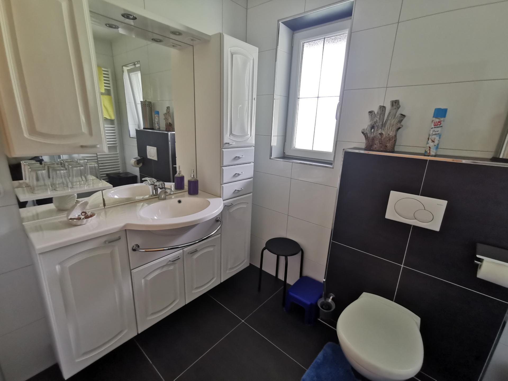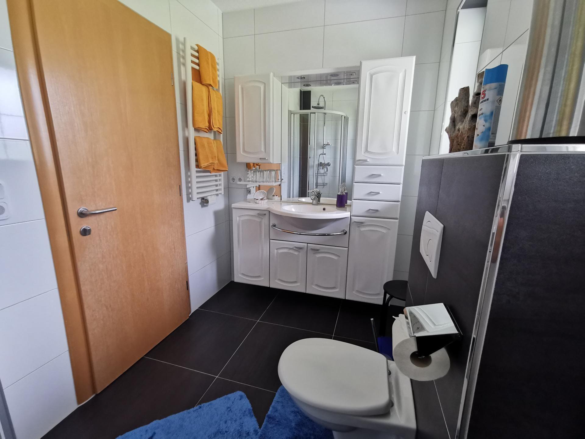 Das Badezimmer der Ferienwohnung ist ausgestattet mit Dusche, WC sowie einem Waschtisch und Fön.