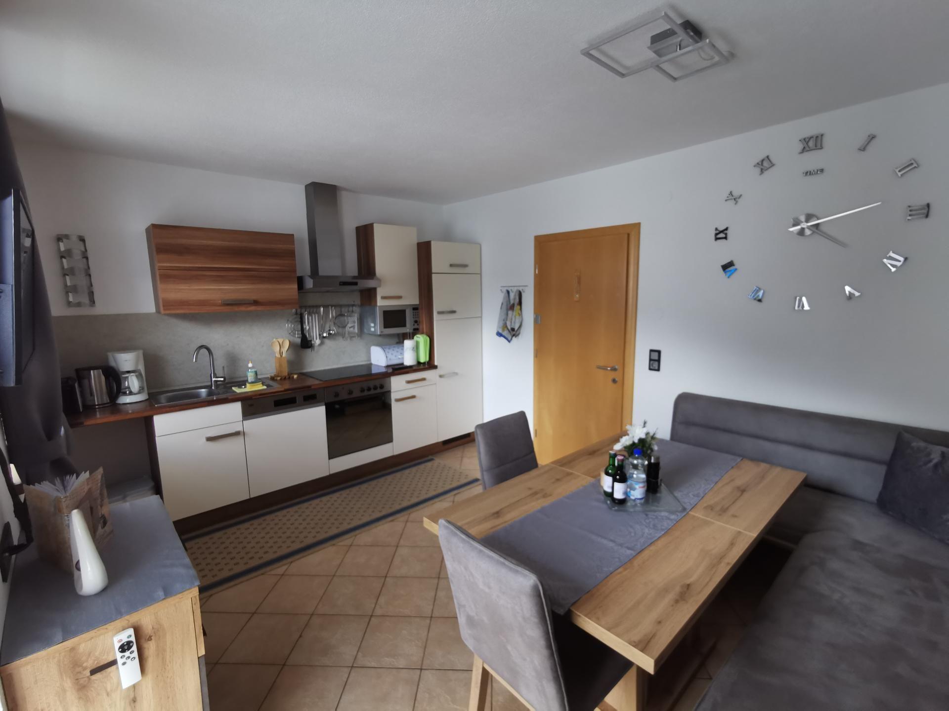 Die Wohnküche bietet eine Komplettausstattung mit Geschirr und Besteck für 12 Personen sowie Geschirrspüler, Mikrowellenherd, 4 Platten Ceran-Kochfeld, Backrohr, Kühl- und Gefrierkombination, Kaffeemaschine, Wasserkocher, Sat TV, Essecke mit großem Tisch, Stühle und Eckbank sowie einen Balkon.