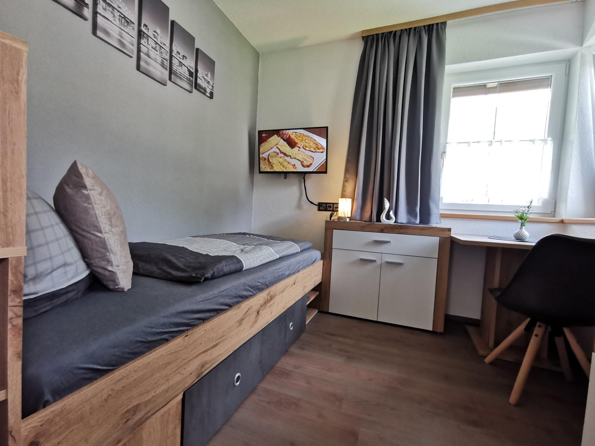 Zimmer mit einem Einzelbett, Sat-TV (32'' HD TV), Tisch und Stuhl, Kleiderschrank, Kommode sowie 2 Fenster mit herrlichem Ausblick auf das Bergpanorama.