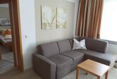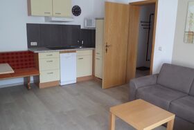Sie besteht aus Vorraum, Wohnküche, Dusche/WC und einem Schlafzimmer. Die Wohnküche ist mit einer Küchenzeile mit Induktionkochfeld, Geschirrspüler, Geschirr, Filterkaffeemaschine, Brottoaster, Wasserkocher und Mikrowelle ausgestattet. Ein großer Esstisch und eine gemütliche Sitzgarnitur vervollständigen den Wohnraum. Gratis Wifi, Sat-TV und Radio sind selbstverständlich. Die Terrasse ist mit Stühlen und Tisch ausgestattet.