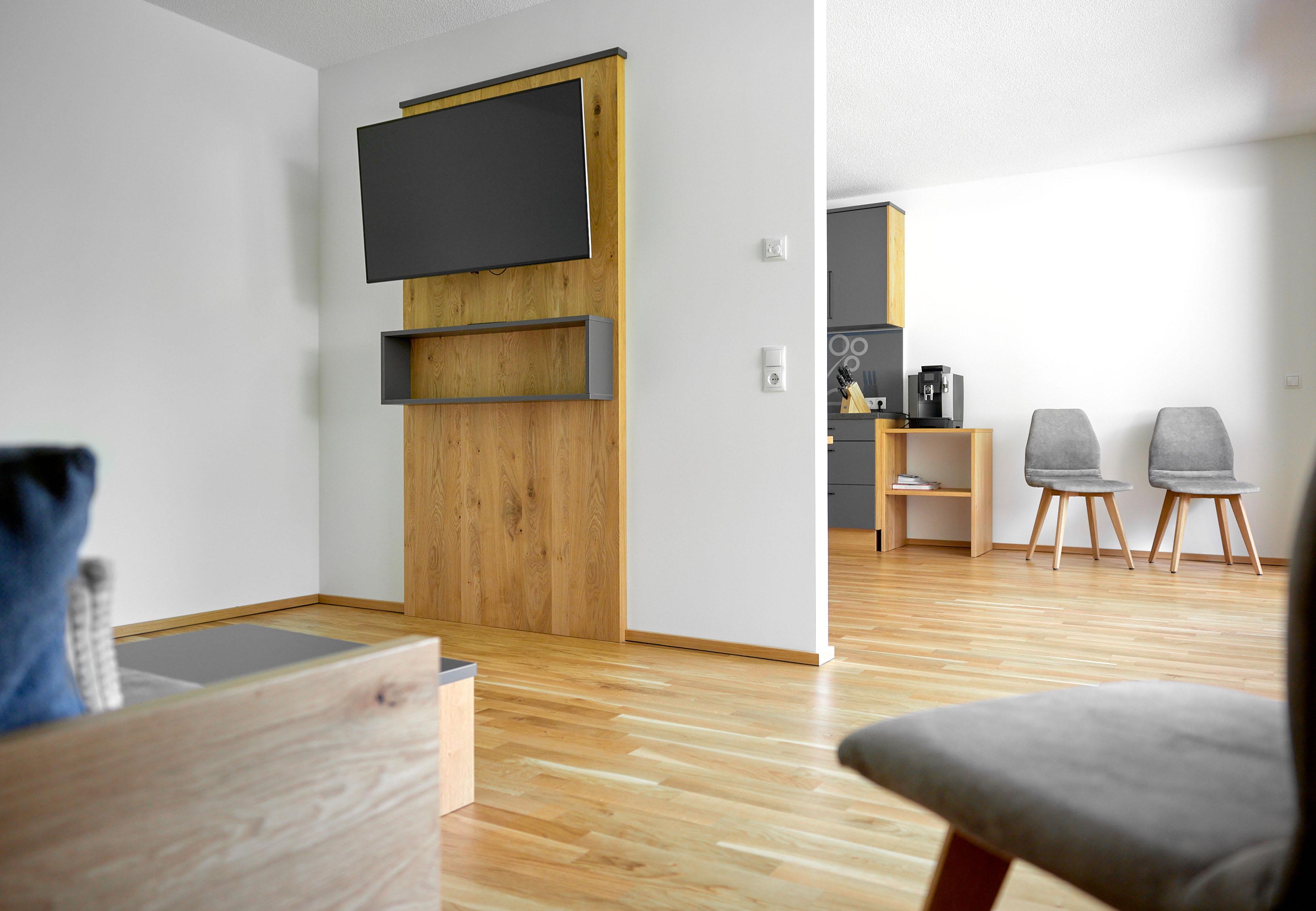 Willkommen im Zapfig Living Apartment 12, Deinem perfekten Rückzugsort für einen erholsamen Aufenthalt. Die 80 m² Unterkunft im 1.Stock bietet ein gemütliches Wohnzimmer inkl. ausziehbaren Kingsizebett mit Smart-TV, 2 Schlafzimmer (Kingsizebett+ausziehbares Einzelbett+Smart-TV) sowie eine voll ausgestattete Küche. Die 2 Badezimmer verfügen über Dusche und WC. Genieße den Komfort einer eigenen Unterkunft+entspanne in alpiner Umgebung. Vom Balkon mit Liegenstühlen besteht Bergblick.