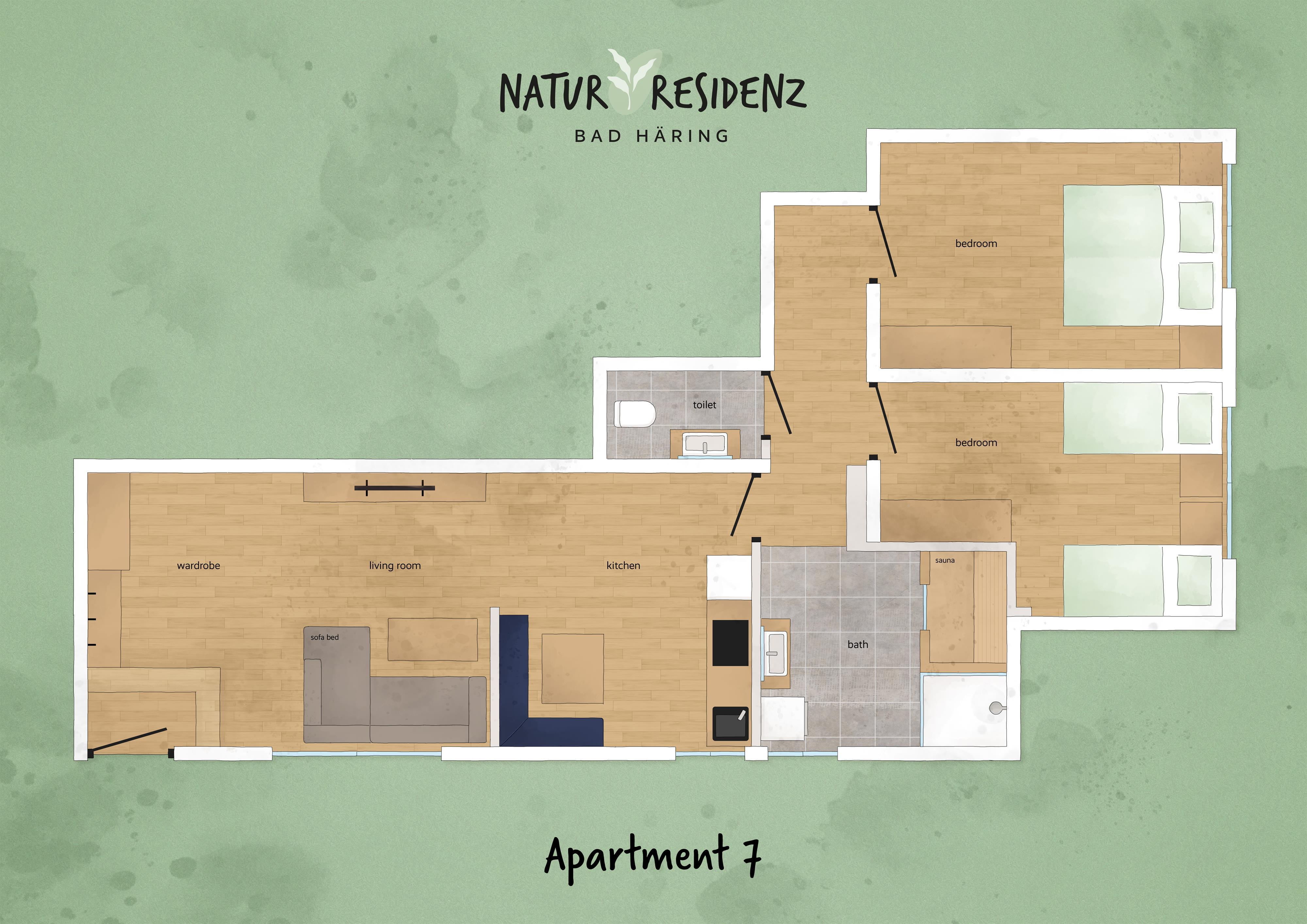 Alles neu, alles modern und alles geschmackvoll eingerichtet - oder einfach: deine Natur Residenz Bad Häring. Die Apartments der Natur Residenz Bad Häring sind sowohl funktional als auch gemütlich und stilvoll eingerichtet. Alle Wohnungen sind mit einer vollausgestatten Küche, einem Geschirrspüler und einem Backrohr ausgestattet. Die liebevoll eingerichteten Ferienwohnungen der Natur Residenz Bad Häring verfügen zudem über Bettwäsche, Handtücher und einen Fön. Des weiteren stellt die Natur Residenz Bad Häring jedem Apartment einen kostenfreien Parkplatz zur Verfügung. Da sich die Natur Residenz wunderbar in Bad Häring gelegen befindet, kann somit auch ihr Auto Urlaub machen, da die wesentlichen Highlights des Urlaubsortes entweder zu Fuß oder via Bus erreicht werden können. Unsere Apartments 1-5 und 9 befinden sich in den oberen Stockwerken, Apartment 6-8 liegen durch eine Souterrain Lage etwa 0,5m unter Bodenniveau. Trotzdem bieteten die Wohnungen genügend Tageslicht.