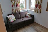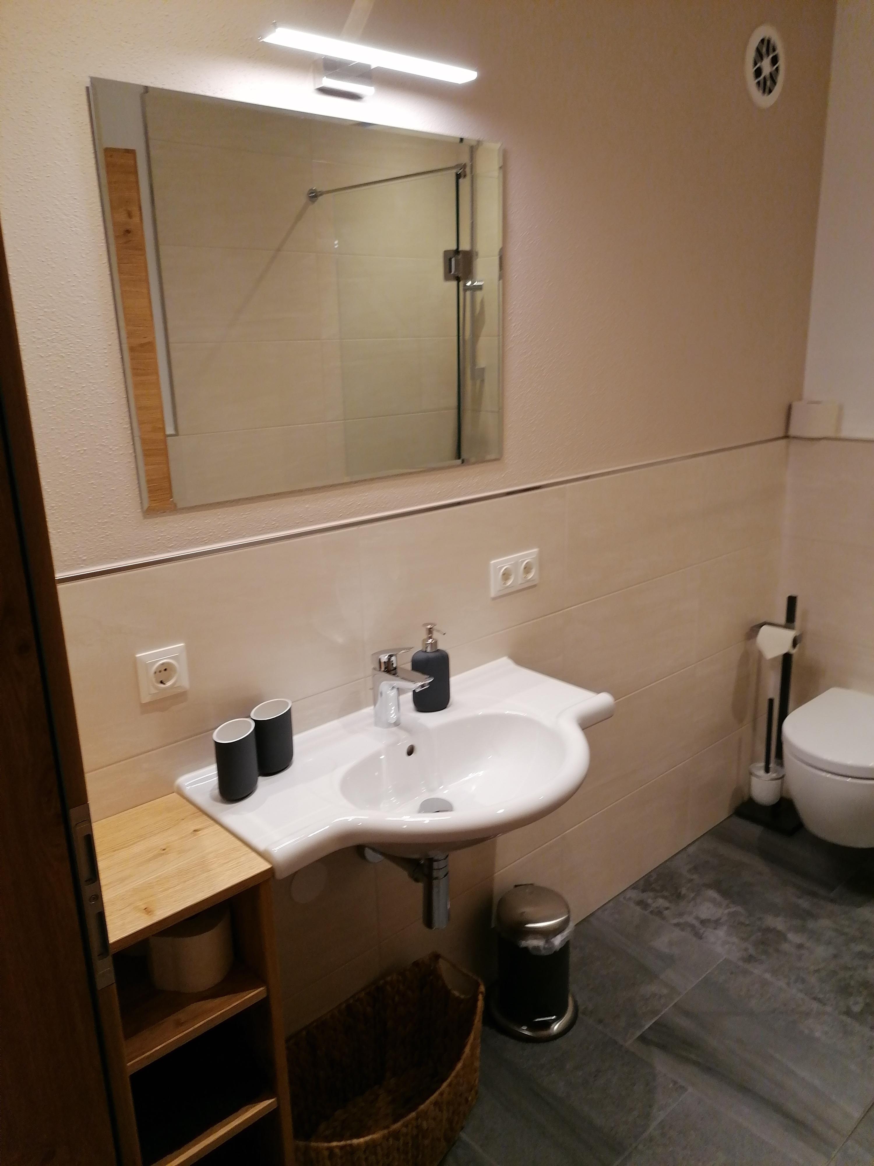 Für 4 Personen, 45 m², neuwertig, Schlafzimmer mit Doppelbett, Wohnzimmer mit Schlafcouch für 2 Personen, Küche, Wohnraum, Badezimmer mit Dusche, Waschbecken, WC, Sitzecke, Couch, TV im Wohnzimmer, gut ausgestattete Küche, Wohnung im Parterre.