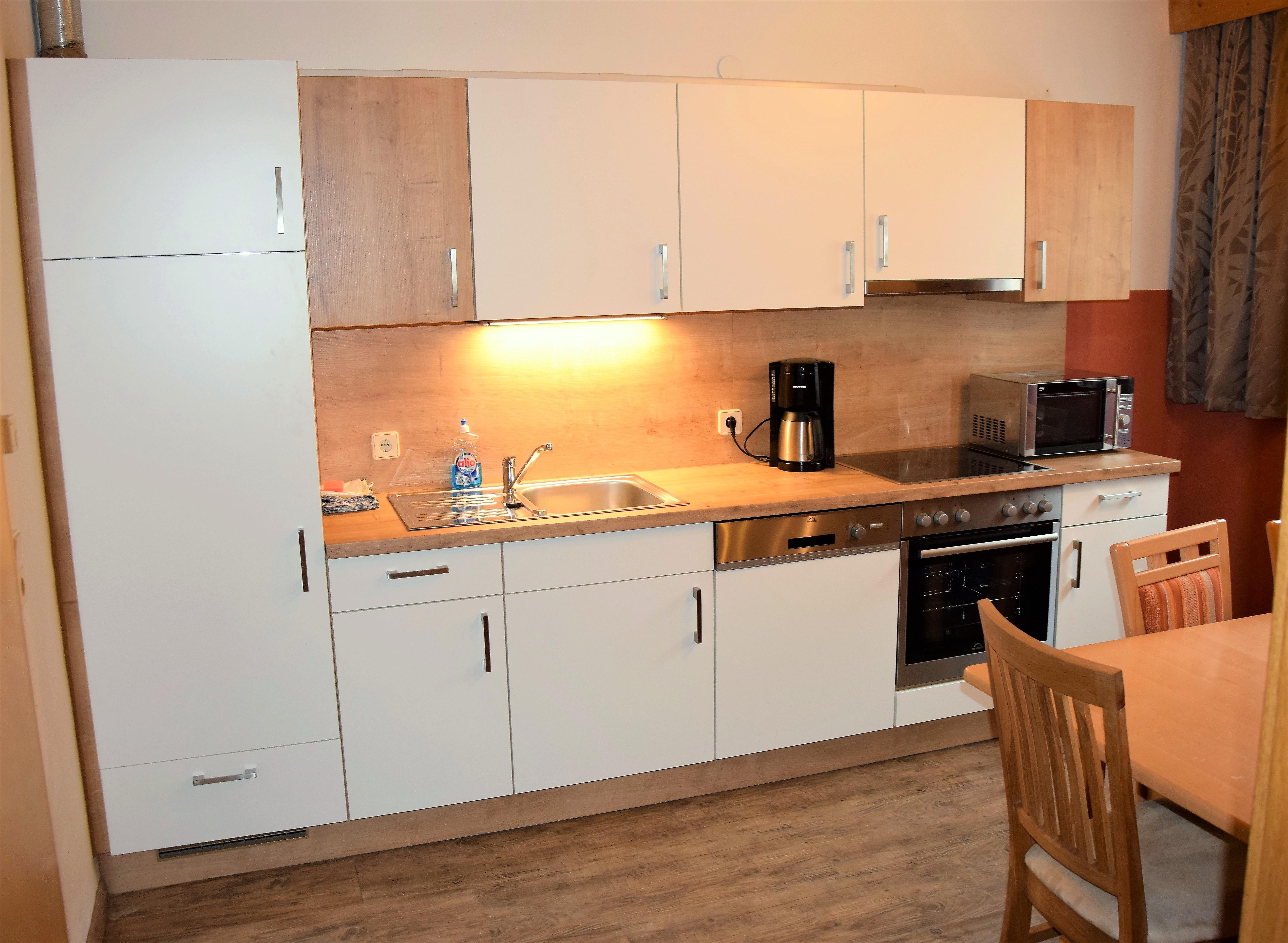 1 x voll eingerichtete Küche (Elektroherd,Toaster, Mikrowelle, Backrohr, Kaffeemaschine, Kühlschrank mit Gefrierfach) mit Sitzecke