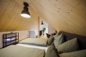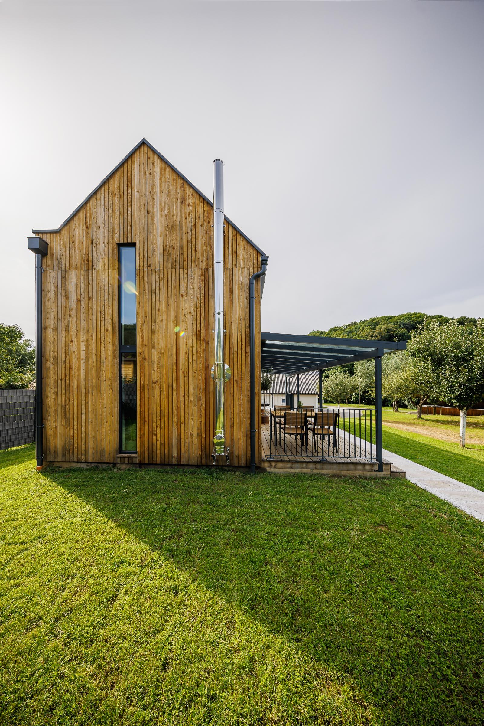 Das Ferienhaus bietet mit 70m² Wohnfläche bis zu vier Personen Platz. Im EG befindet sich eine gut ausgestattete Küche, Esstisch, Wohnbereich mit Flat-TV und Kaminofen, Badezimmer mit Dusche und WC, Schlafzimmer mit Boxspringbett, und großer Terasse. Im OG befindet sich ein offener Schlafraum (Loft) mit Boxspringbett.
