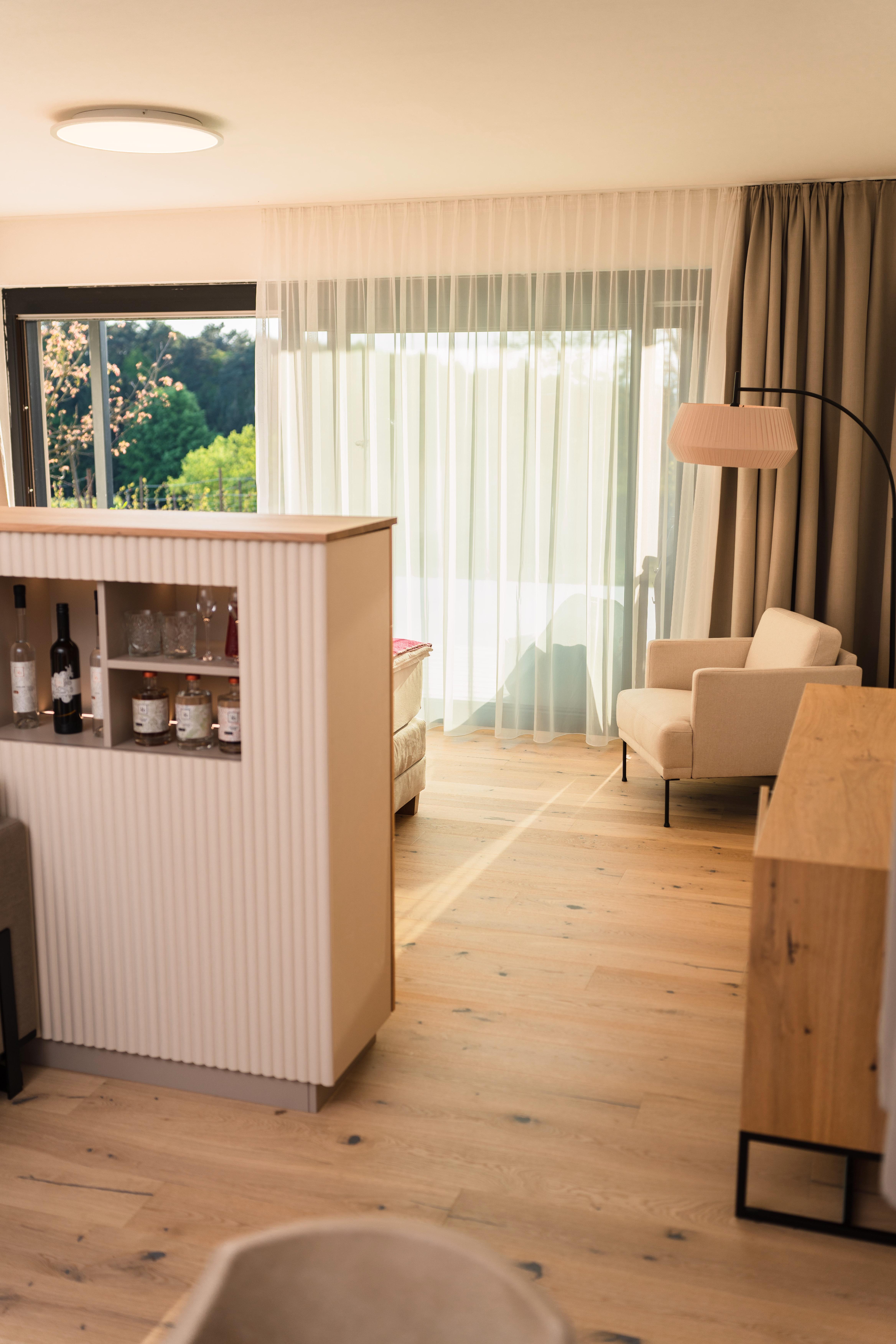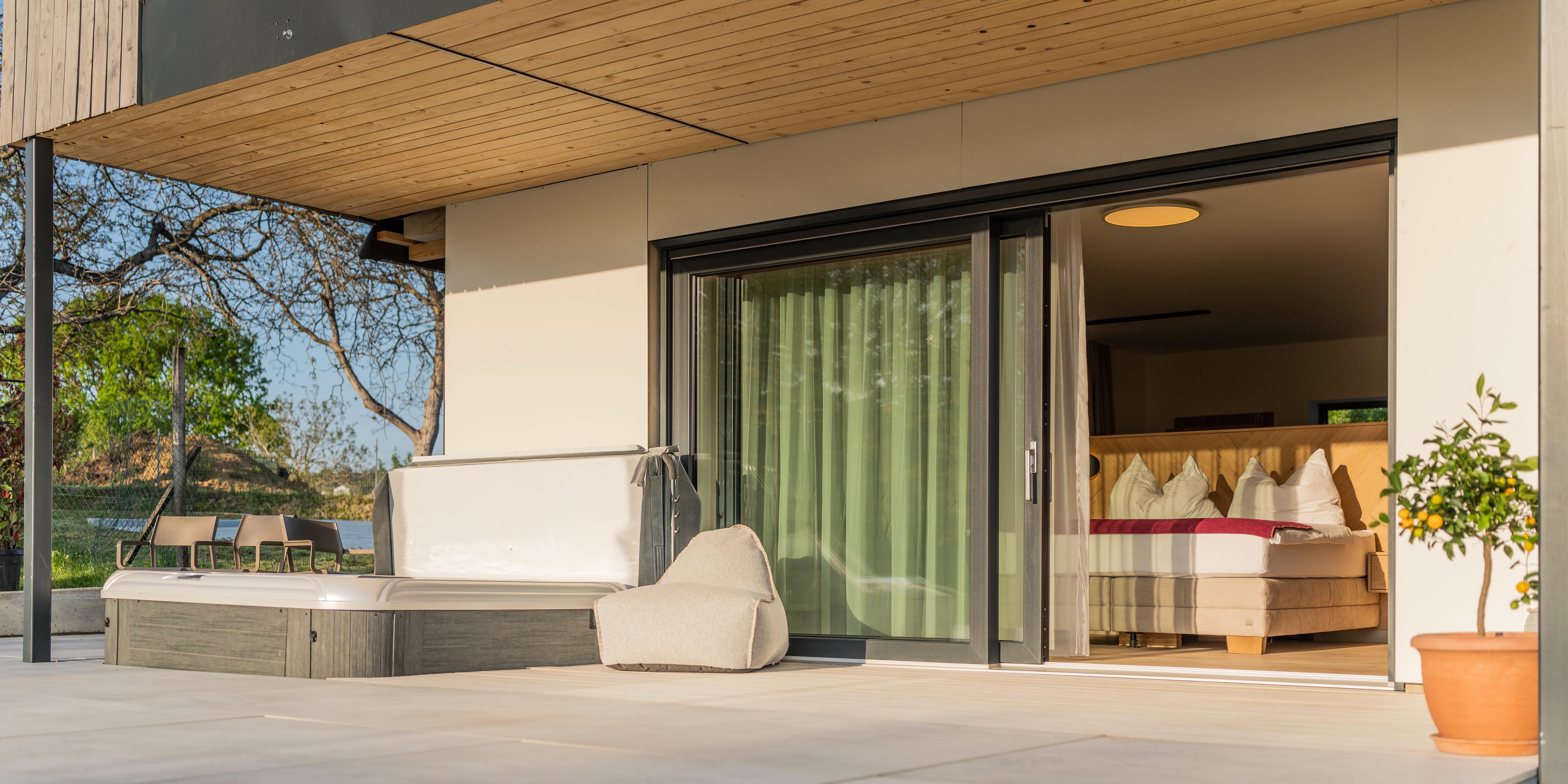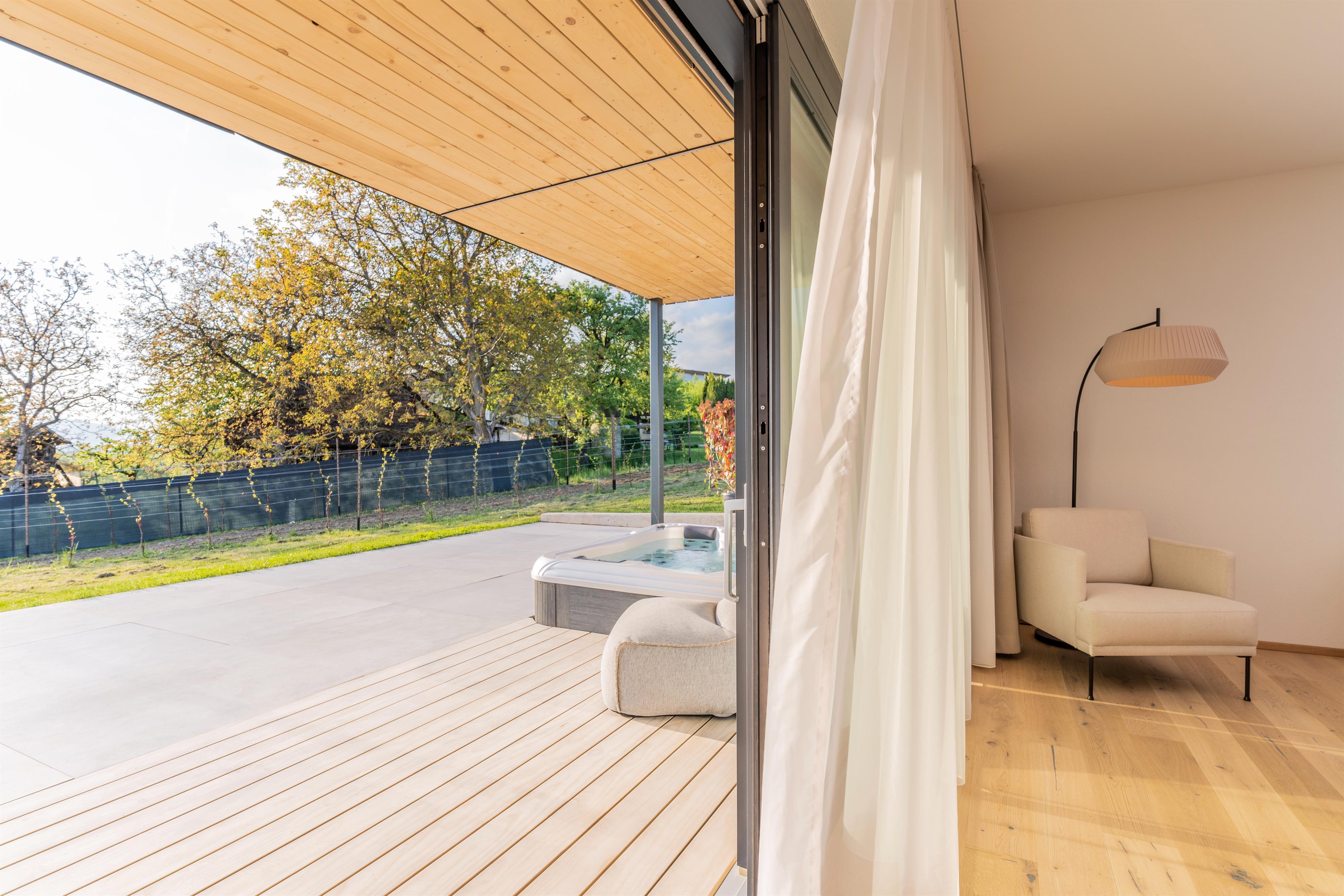 Barrierefreies Apartment, ca. 62 m2 mit Küchenzeile, Kühlschrank, Kaffeemaschine, großzügiges Badezimmer, Fernseher, ausziehbares Sofa, Boxspring-Doppelbett, großzügige Terrasse (ca 36 m2) mit Liegen, Gartenmöbeln und Whirlpool mit Blick in den Weingarten