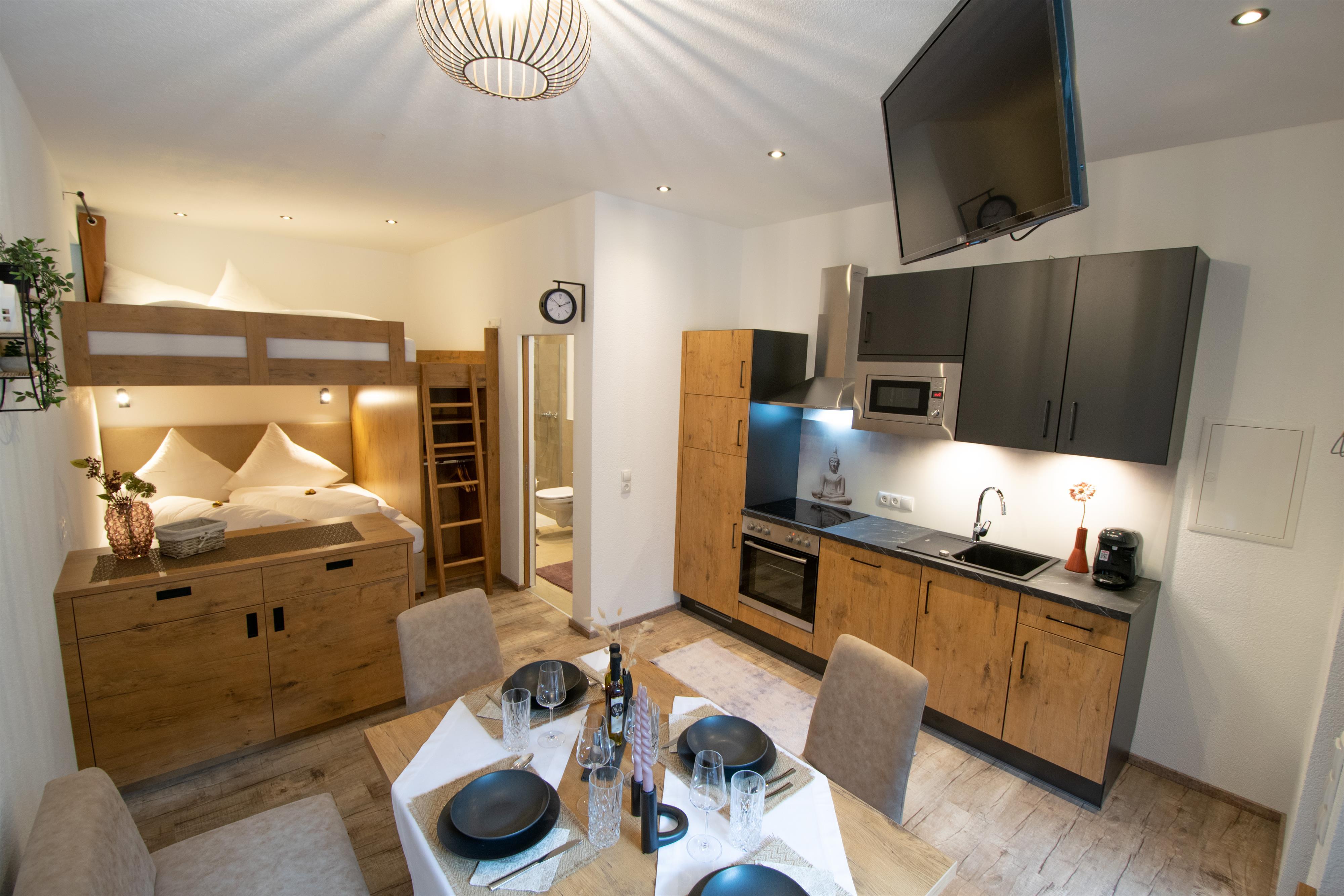 Unser W-Spirit Apartment 1 ist 20 m2 groß und bietet Platz für 4 Personen. Sie Wohnung verfügt über eine Küche, einen Essbereich, ein Doppelbett, ein Doppelhochbett und ein Badezimmer. Außerdem verfügt unsere neue Wohnung über eine 8m große überdachte Terrasse. Kostenloses W-Lan sowie ein Sat-TV sind ebenfalls verfügbar.