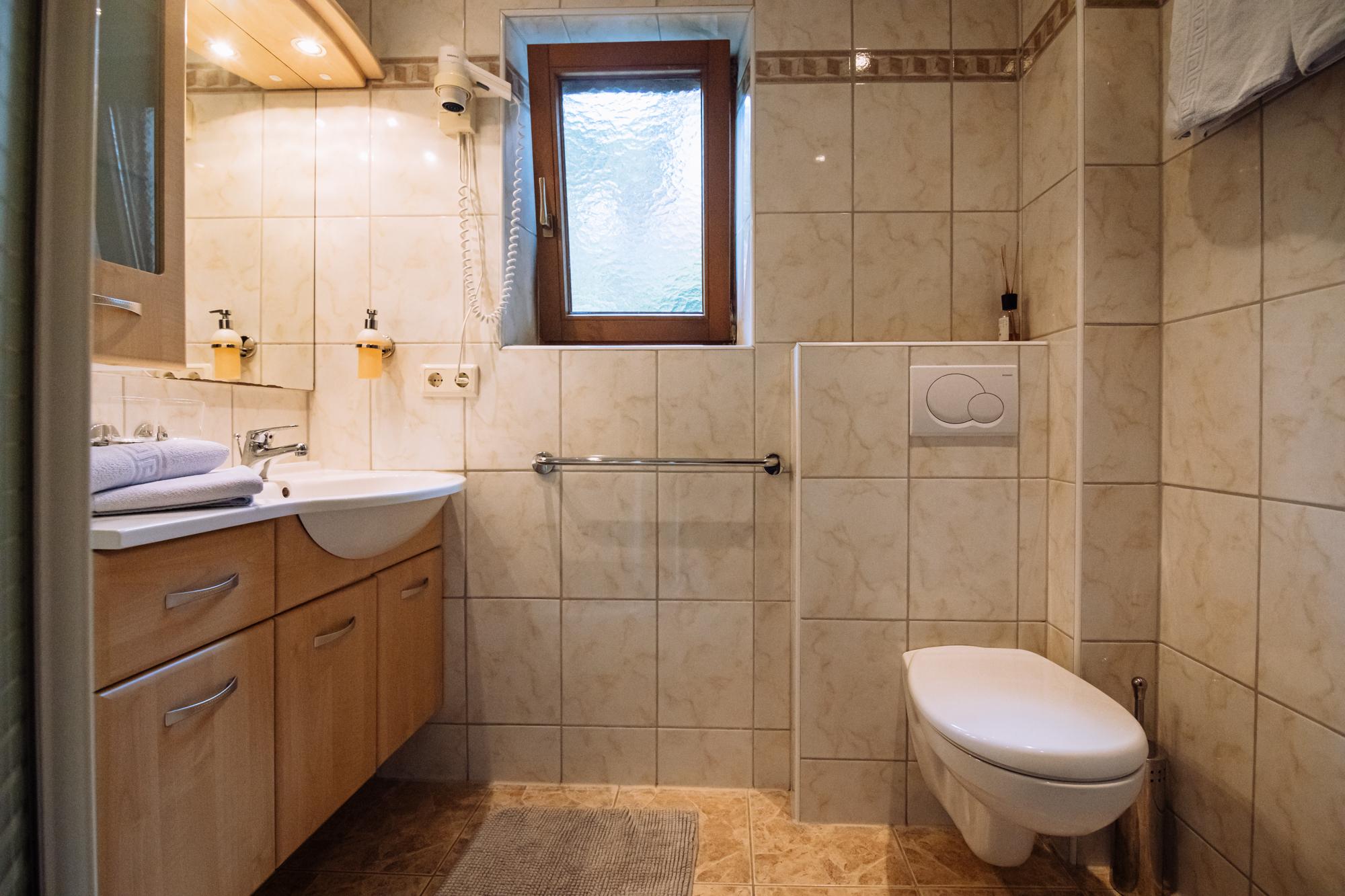Badezimmer mit Dusche und WC, Fön, Handtücher