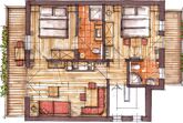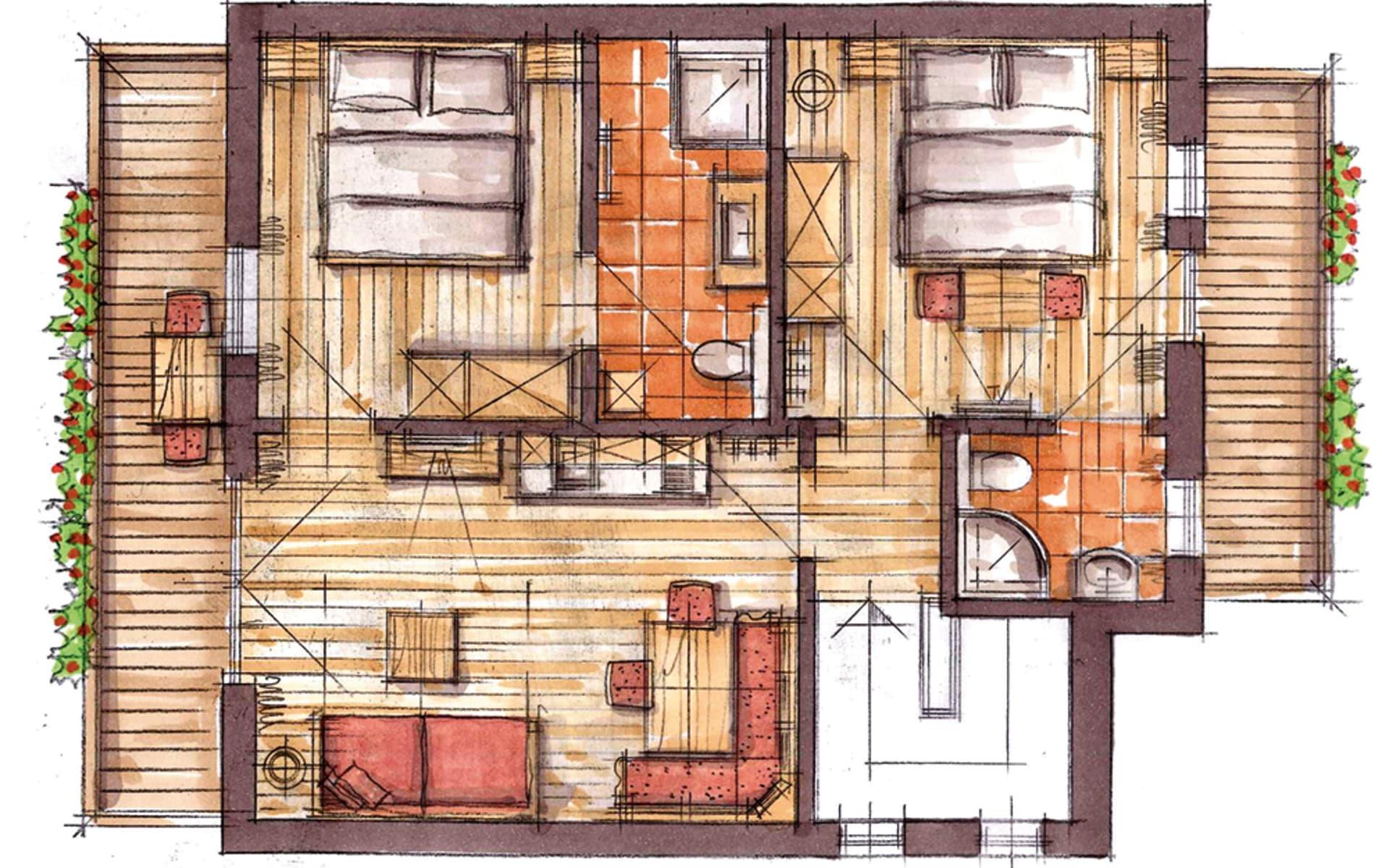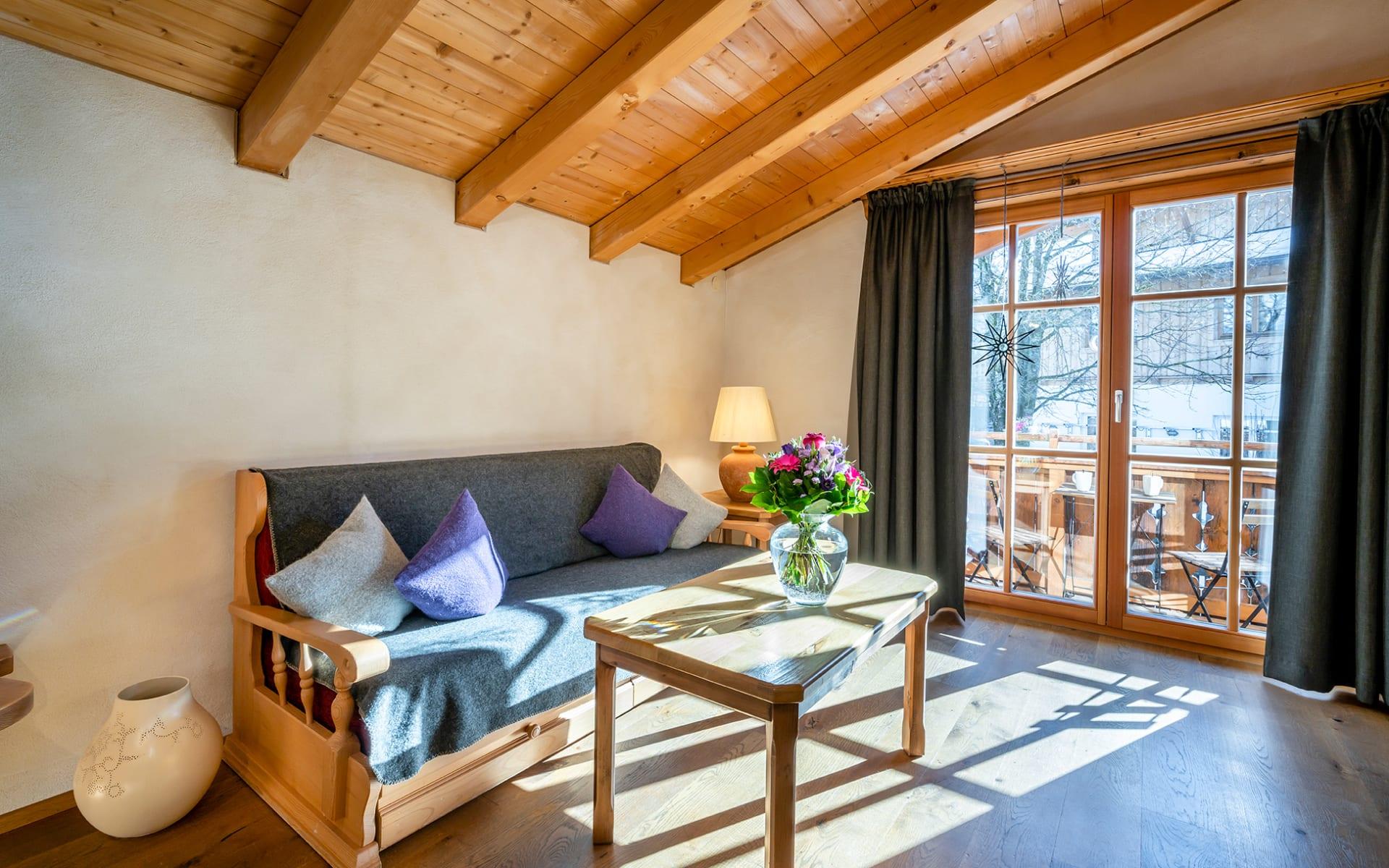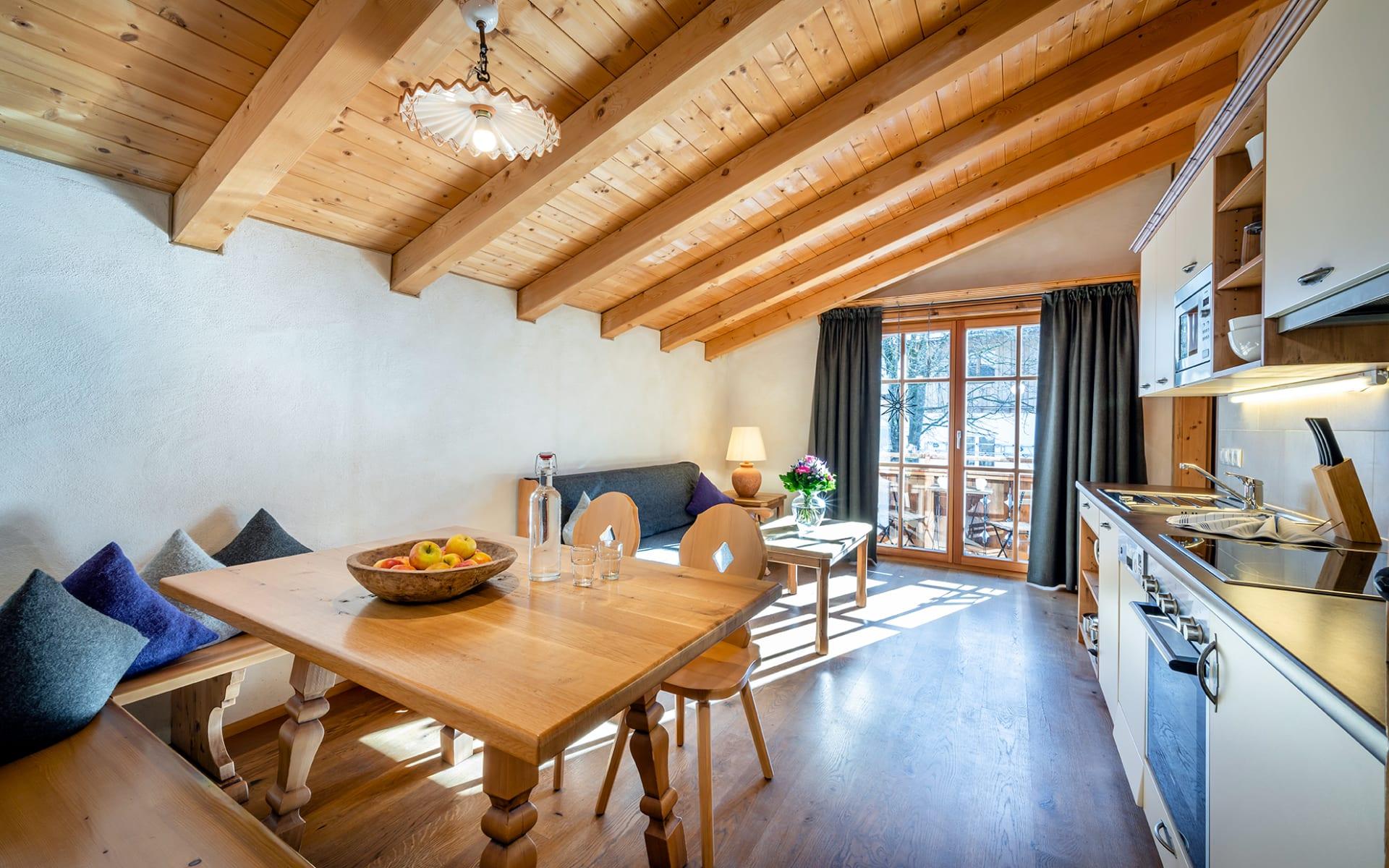 2 Schlafzimmer mit Doppelbetten und jeweils 1x Dusche/WC, 1 Wohnschlafraum (Doppelschlafcouch) mit Küchenzeile, Essecke, Balkon, Geschirrspüler, Mikrowelle, Ceranfeld, Backrohr, Kabel TV, WLAN, Frühstücksbuffet inkl., Almlust Spa & Almhallenbad Nutzung, im Winter Skiraum, im Sommer Almsee und Gartenanlage inklusive.