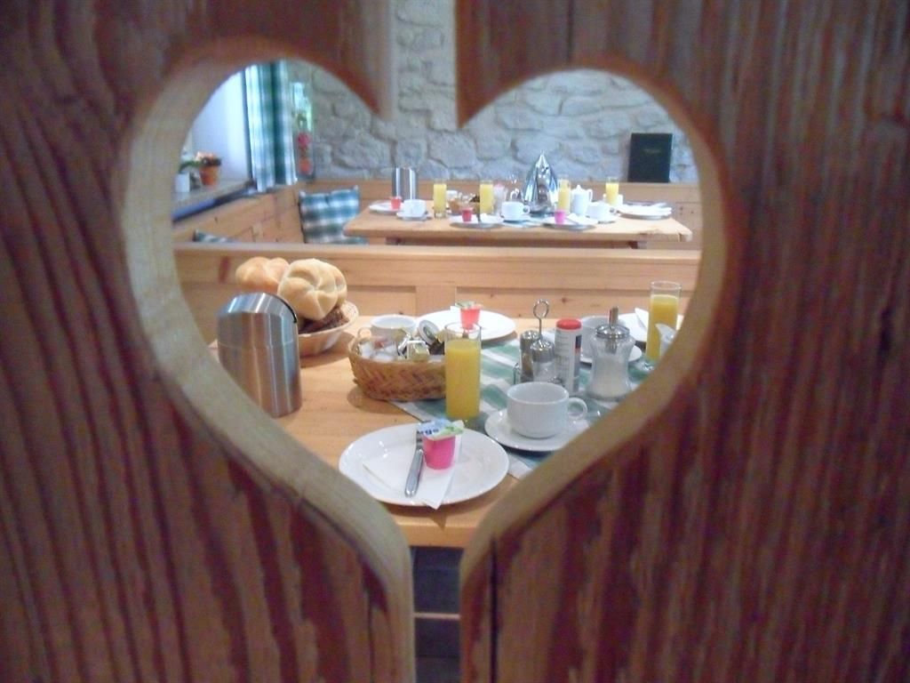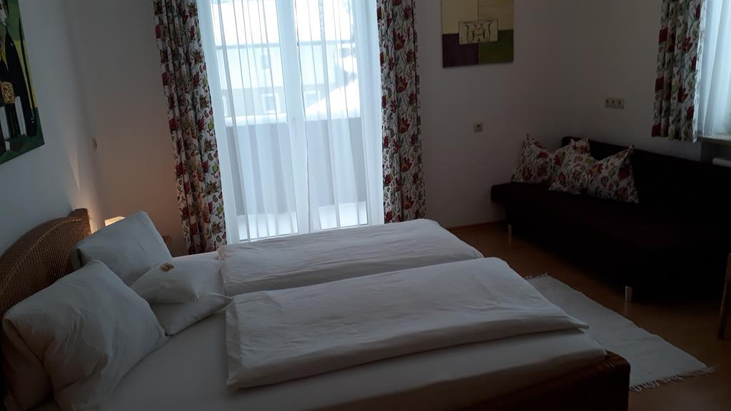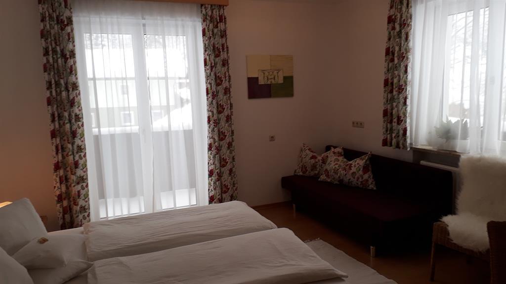 Doppelzimmer ausgestattet mit einem modernen Doppelbett, hellen Landhausmöbeln aus Holz, Lärchenboden mit Bad mit Dusche/WC, Fön, Kabel TV, Tee-Oase W-LAN und Balkon mit herrlichem Bergblick auf das Gamsfeld. Ein Safe ist vorhanden.