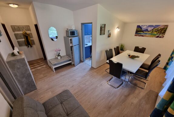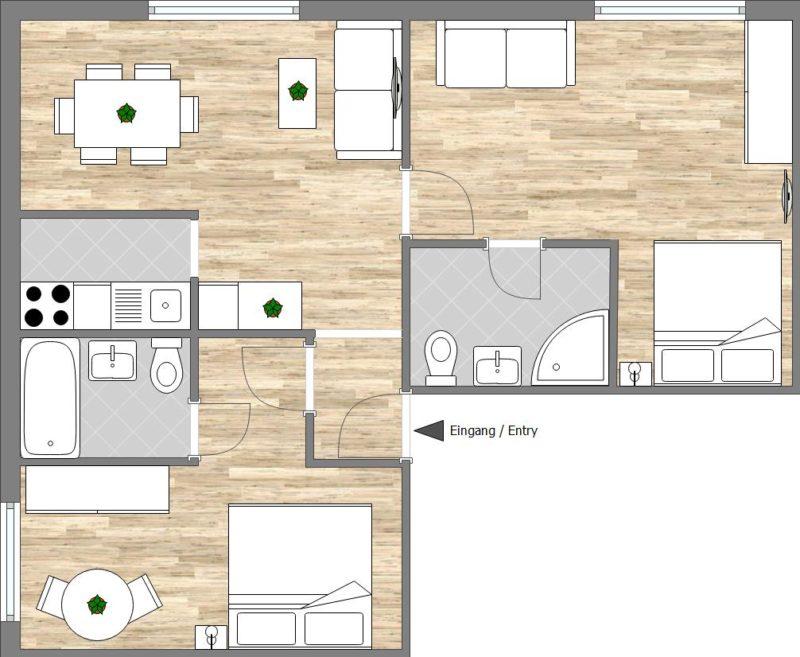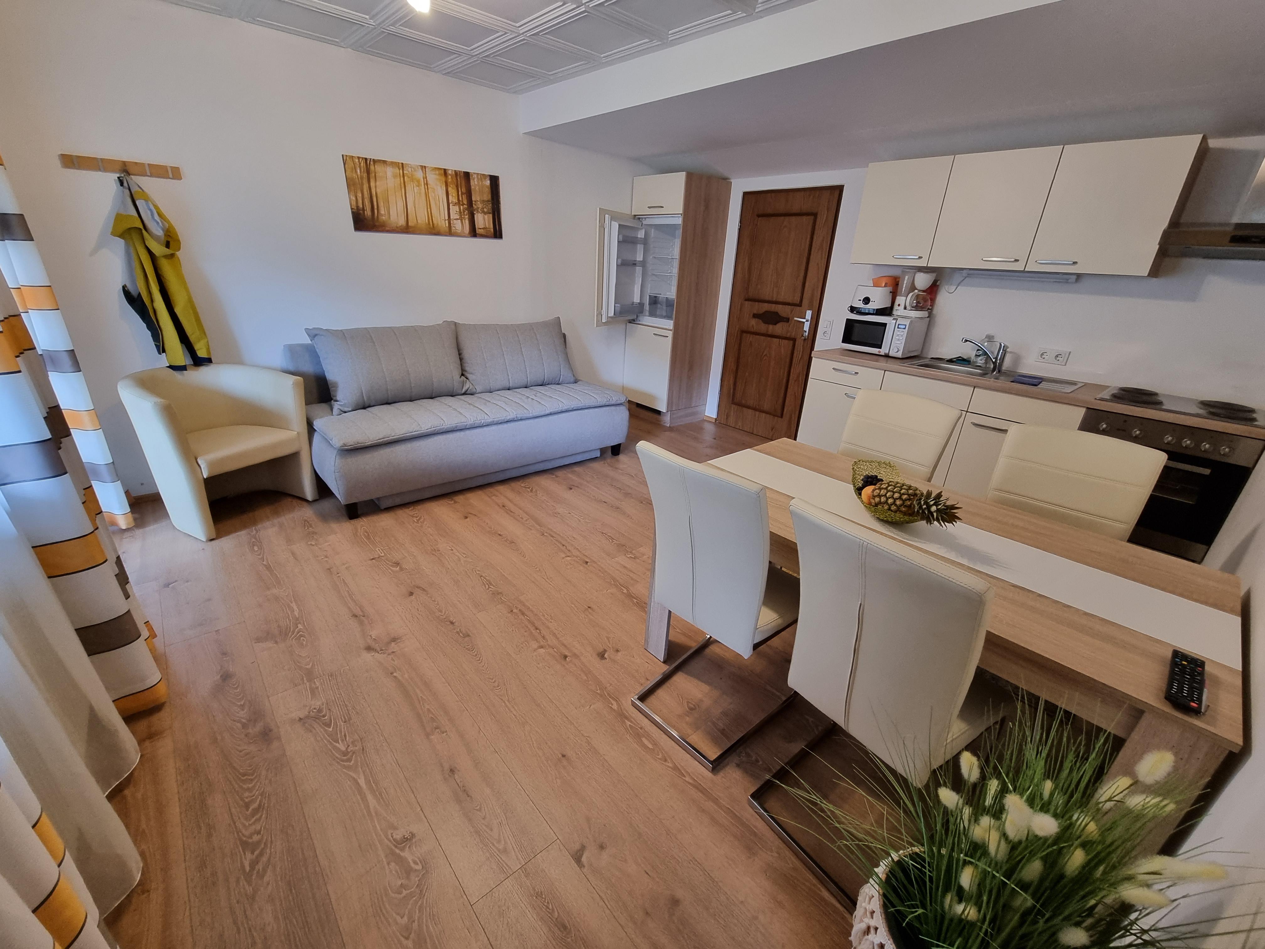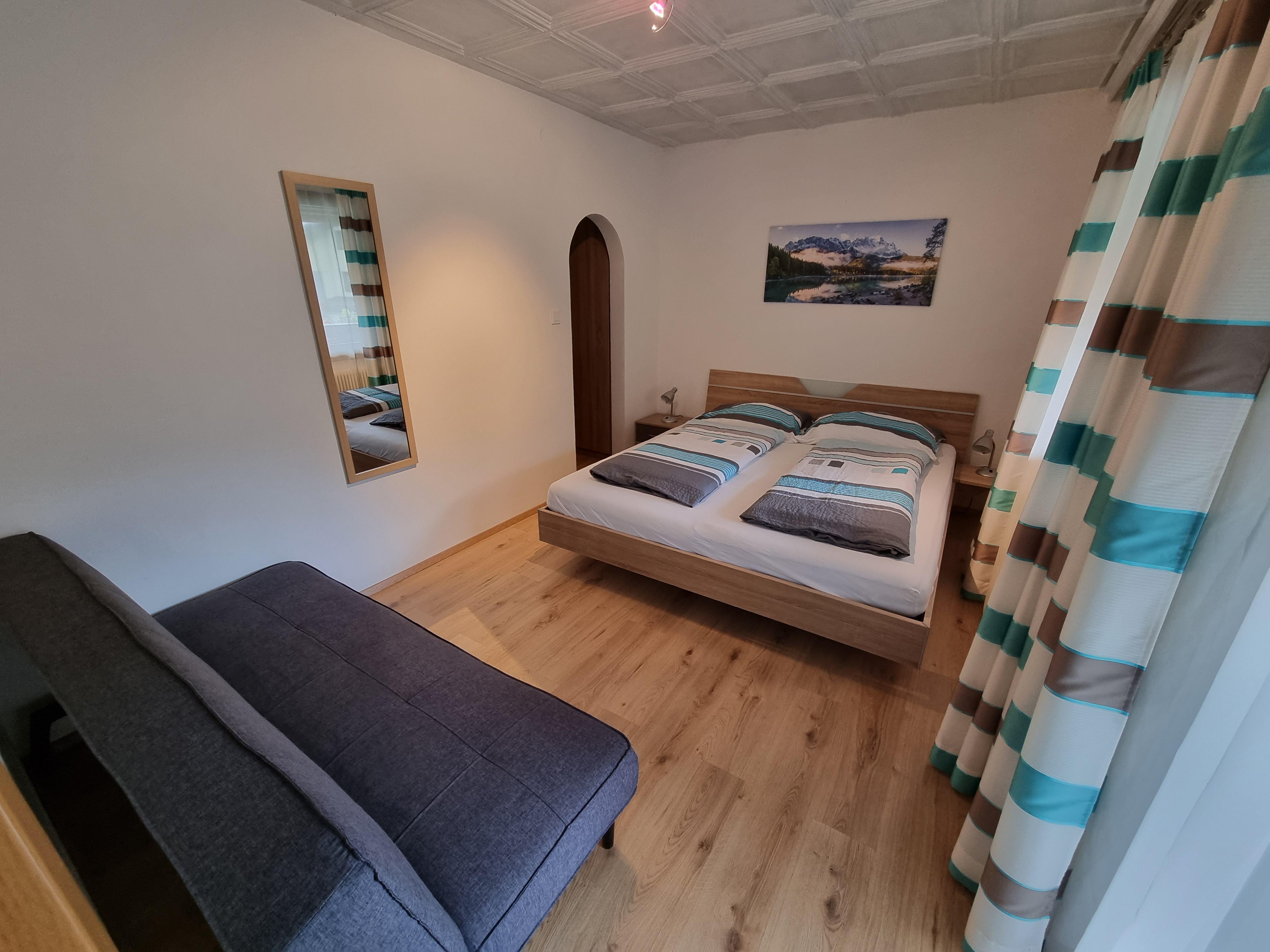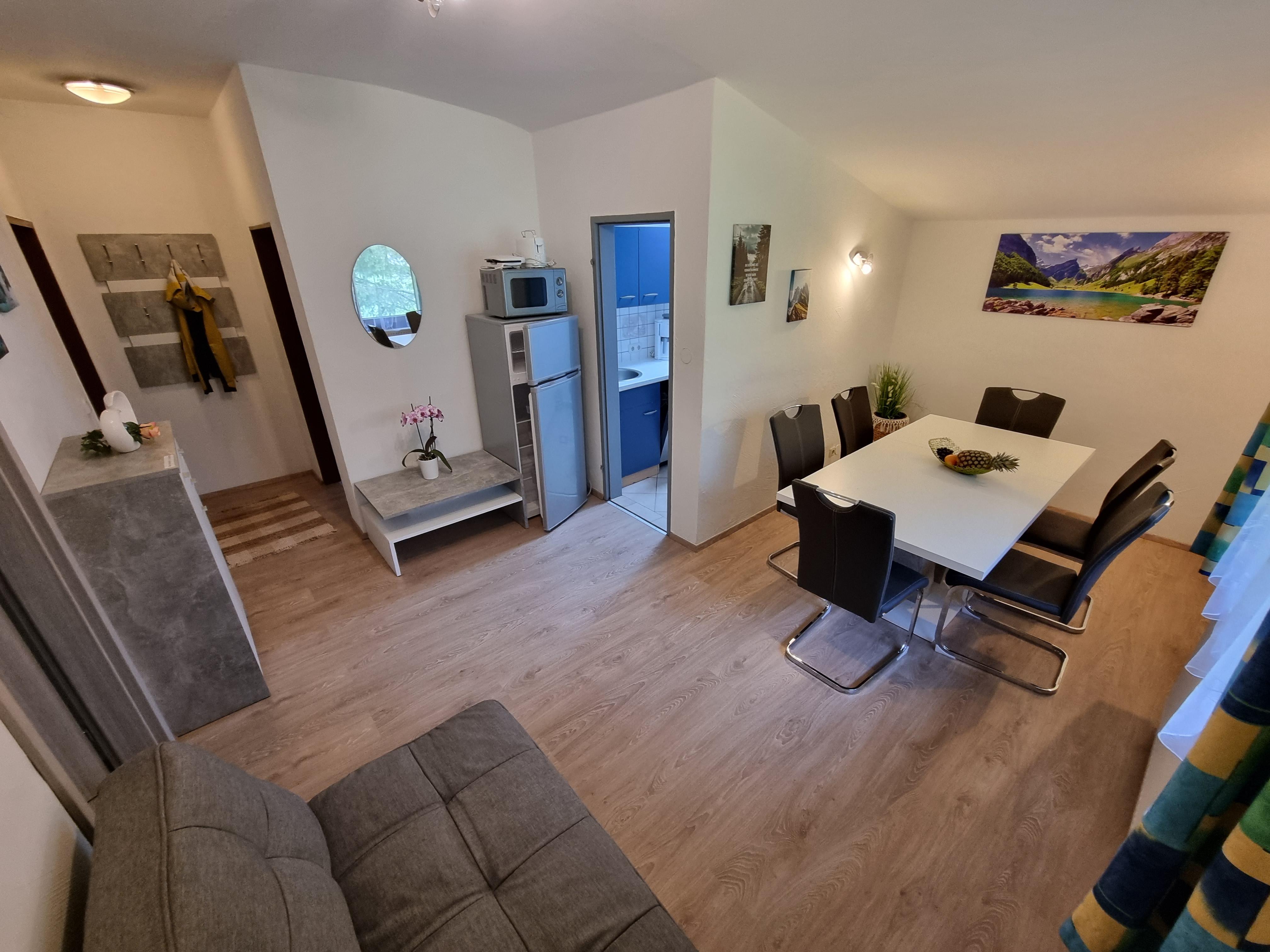 Das gemütliche Appartement ist im 1. Obergeschoss und bietet Platz für bis zu 7 Personen. Es hat eine Grösse von ca. 65 m2 und besteht aus 2 Schlafzimmern mit je einem Doppelbett und eines mit Doppelcouch, einem Wohn- / Essraum mit Schlafsofa sowie einer komplett ausgestatteten Küche (E-Herd, Backofen, Mikrowelle, Kühlschrank mit Tiefkühlfach, Geschirrspüler, Kaffeemaschine, Toaster und Wasserkocher) und 2 Badezimmern.