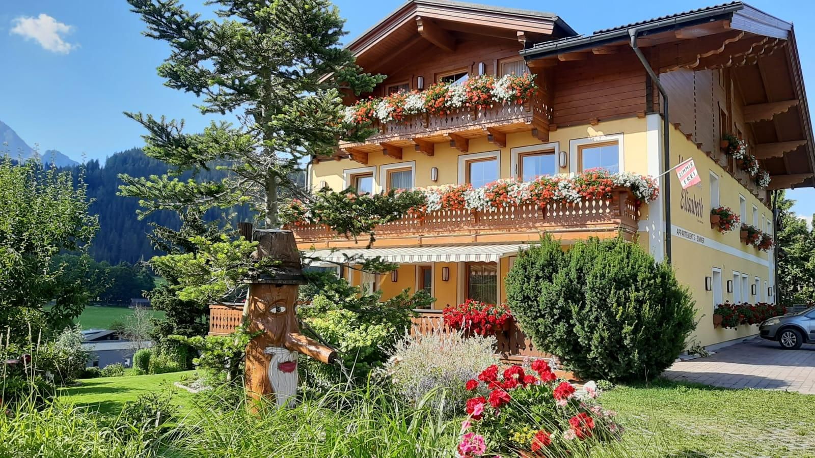 Urlaub soll die schönste Zeit im Jahr werden - wenn Sie Ihren Urlaub inmitten intakter Natur mit Zeit für sich und Ihre Lieben planen und einfach einmal aus dem Alltag raus wollen, dann fühlen Sie sich bei uns sicher wohl! Unser Haus Elisabeth liegt in zentrale, sonniger und ruhiger Lage mit herrlichem Ausblick. Wir sind vom Landesverband mit dem Prädikat 4 Edelweiß ausgezeichnet worden, das heißt für Sie, dass wir Ihnen schöne Zimmer mit Frühstück und 4 komfortable Ferienwohnungen anbieten können, die garantiert vielfältige Kriterien erfüllen, um Ihren Urlaubsaufenthalt so angenehm wie möglich zu gestalten! Ein Frühstücksraum, Nichtraucherraum, Balkon, Sat-TV, Parkplatz sowie freier Internetzugang in allen Ferienwohnungen und im Aufenthaltsraum stehen Ihnen weiters zur Verfügung. Kinder finden auf der großen Liegewiese vor dem Haus und dem nahen Kinderspielplatz genügend Platz zum Toben und Spielen! Zahlreiche lohnende Ausflugsziele, wie Dachstein, Burg Hohenwerfen, Mozartstadt Salzburg uvm können vom Haus Elisabeth aus leicht und bequem erreicht werden, im Winter locken die Loipen direkt vorm Haus oder die Skiverbände Skiregion Dachstein-West und die Salzburger Sportwelt Amadé mit herrlichen Pisten.