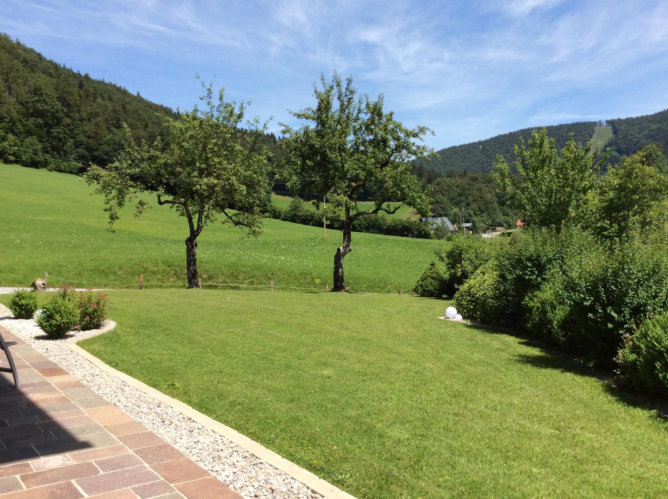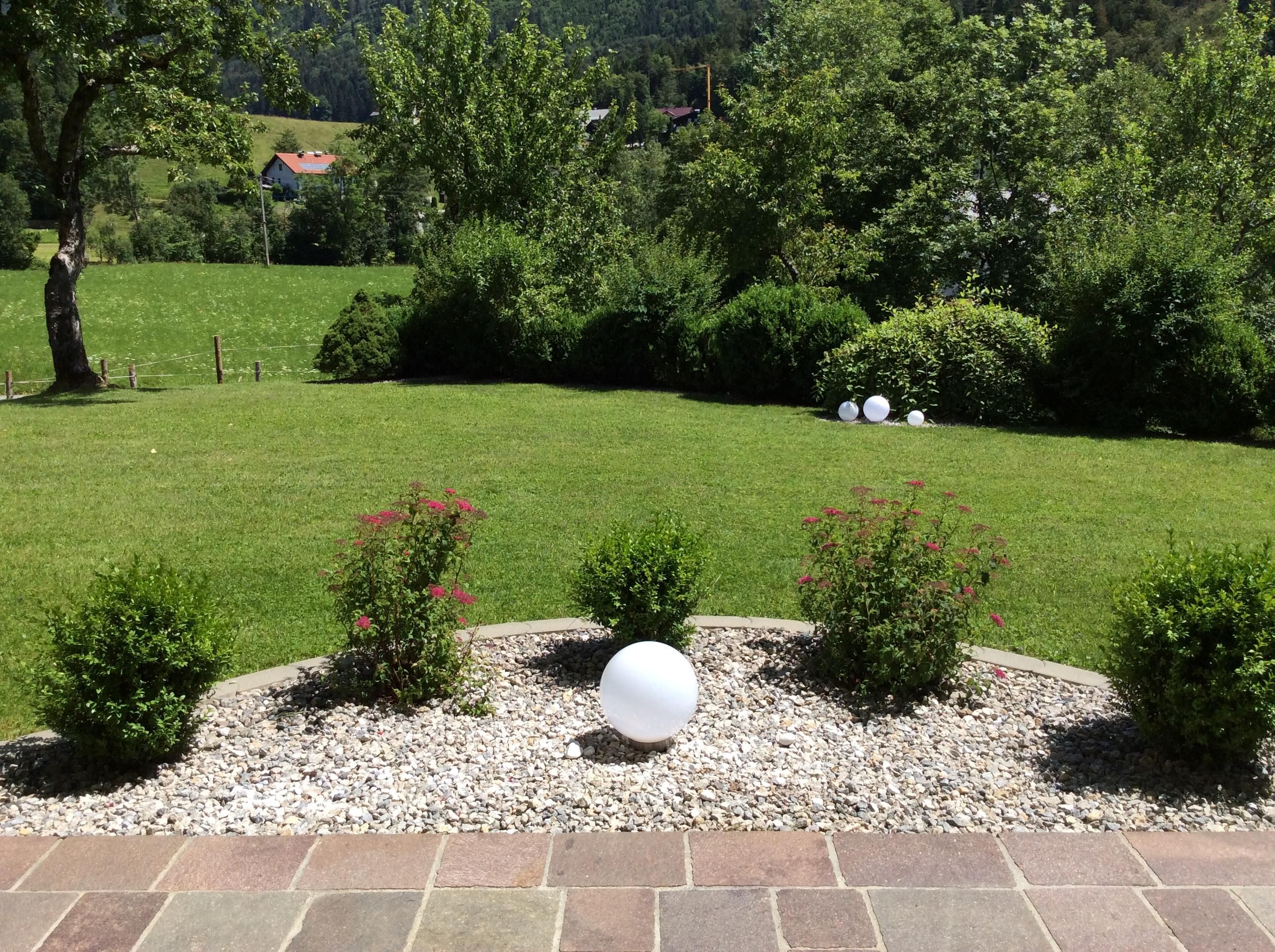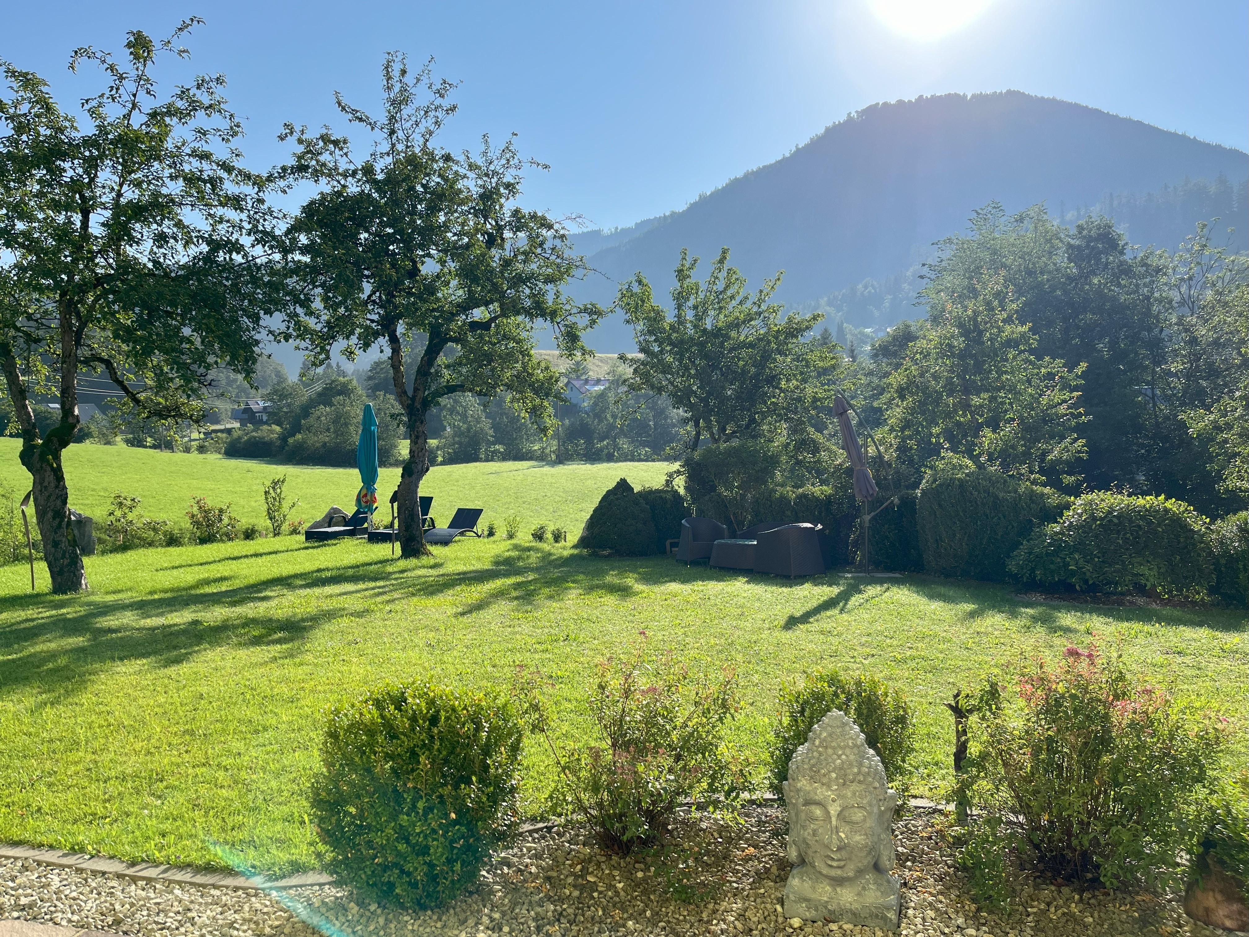 Entspannung pur bietet unser groß angelegter sonniger ruhiger Garten mit Biotop, genießen sie gemütlich im Liegestuhl die frische Luft und die herrliche Bergkulisse.