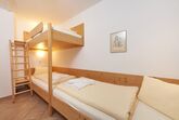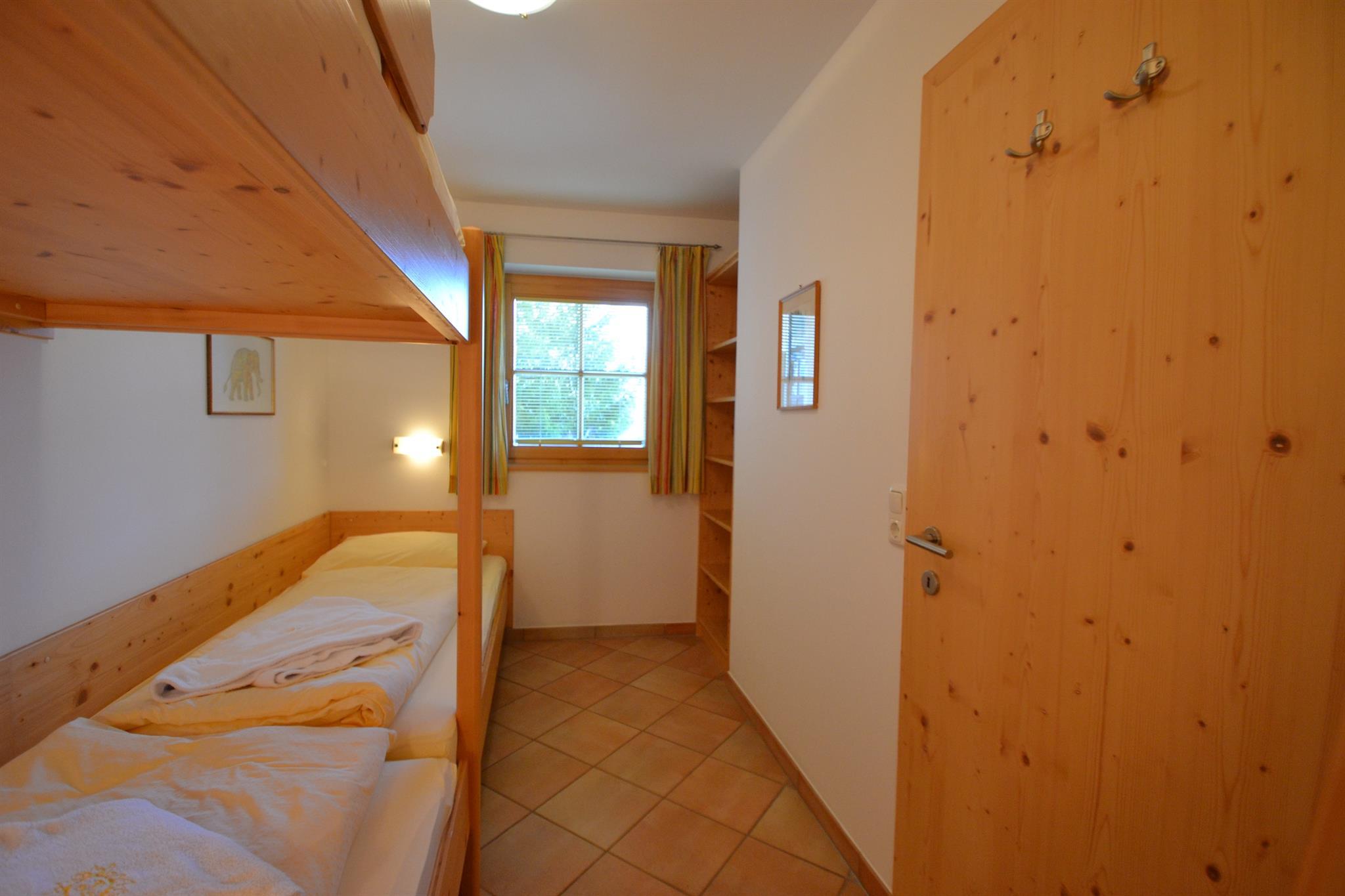 2 getrennte Schlafzimmer: 1 Zimmer mit 2 Einzelbettn und 1 Stockbett und 1 Zimmer mit Doppelbett