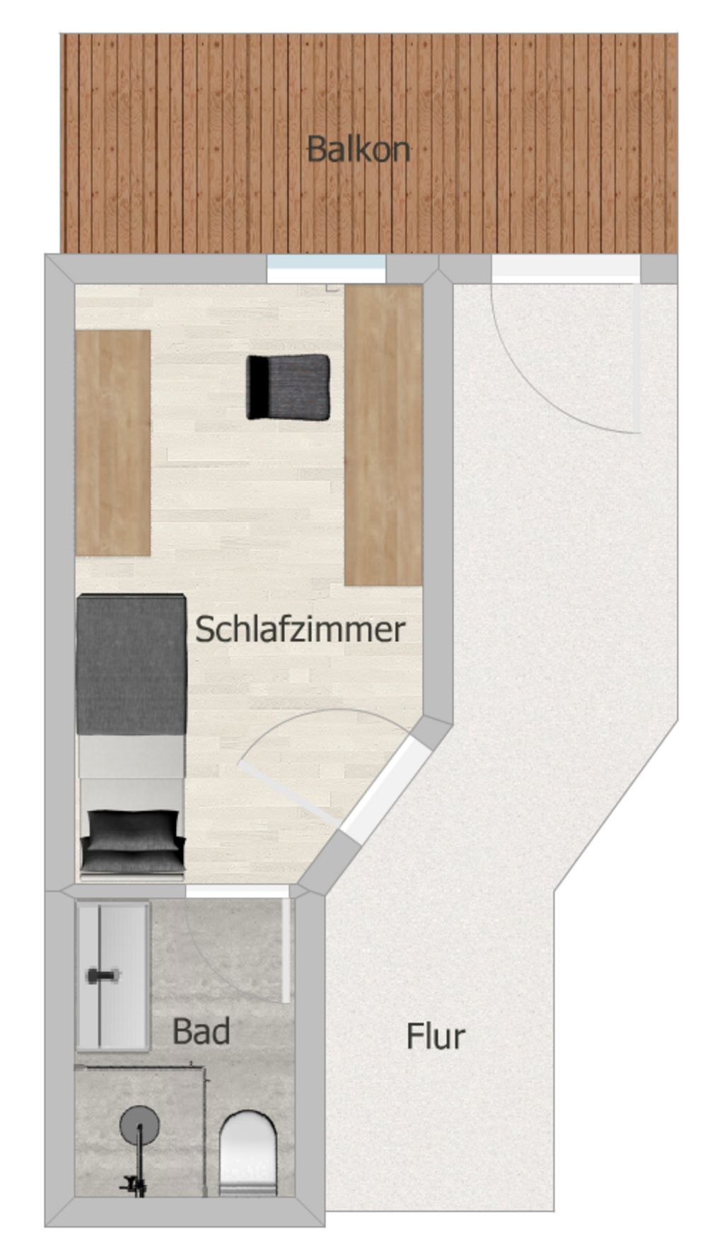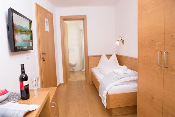 gemütliches Einzelzimmer | geräumiges Bad | qualitätsvolle Ausstattung mit viel Holz | Balkon über Seitengang erreichbar