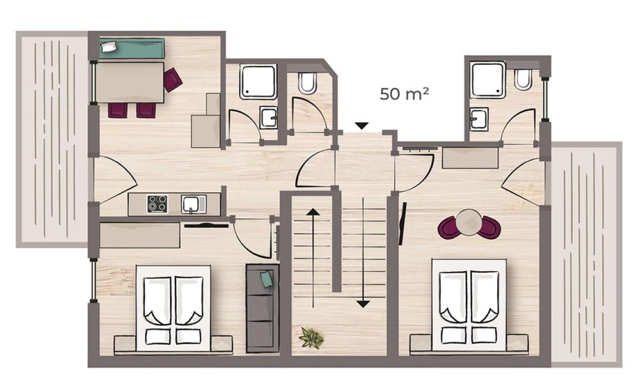 Jedes Zimmer hat sein eigenes Bad. Fön, Handtücher und Bettwäsche sind inkludiert.