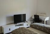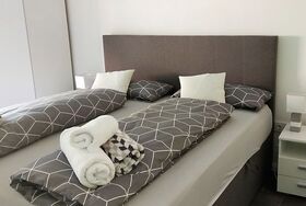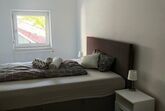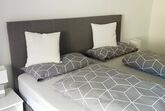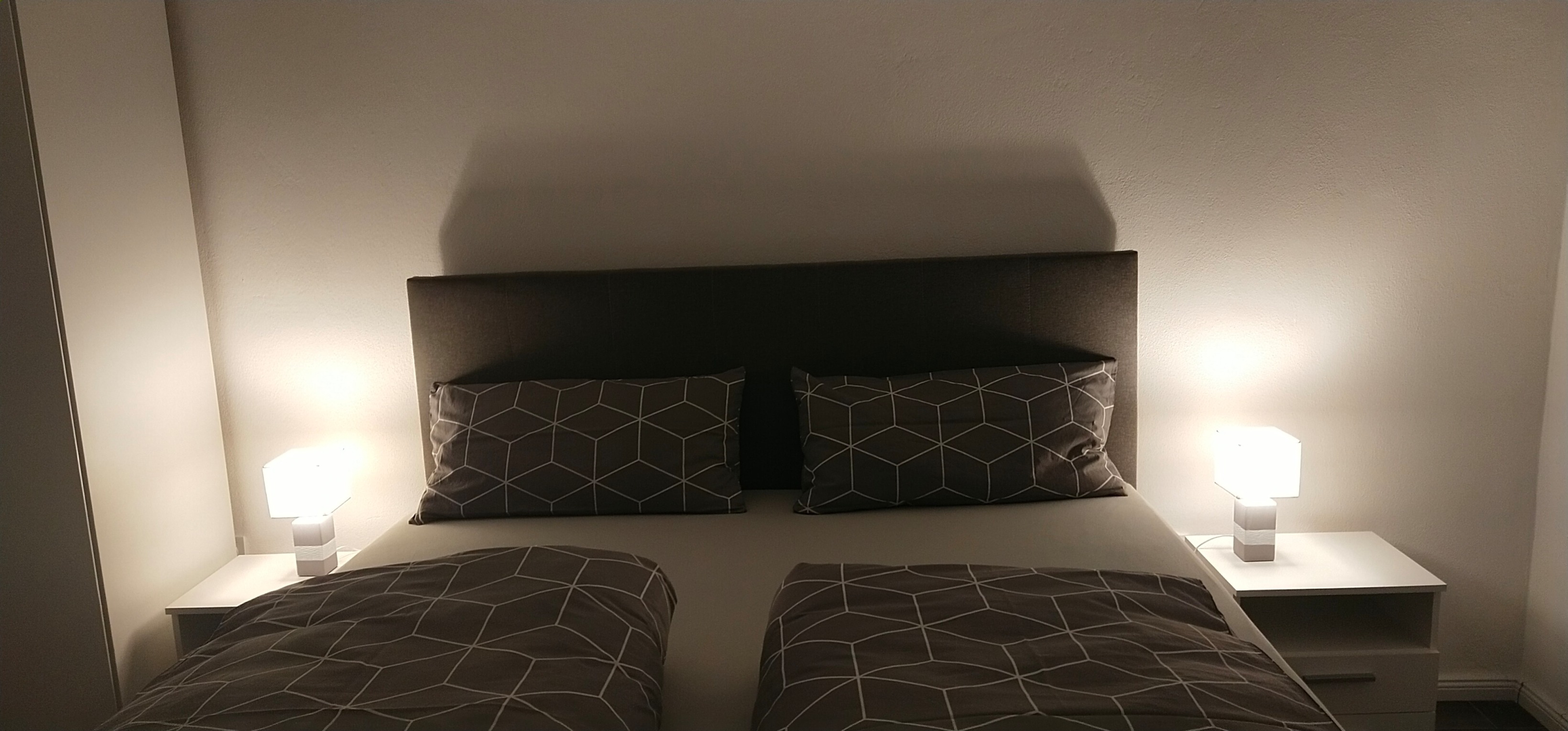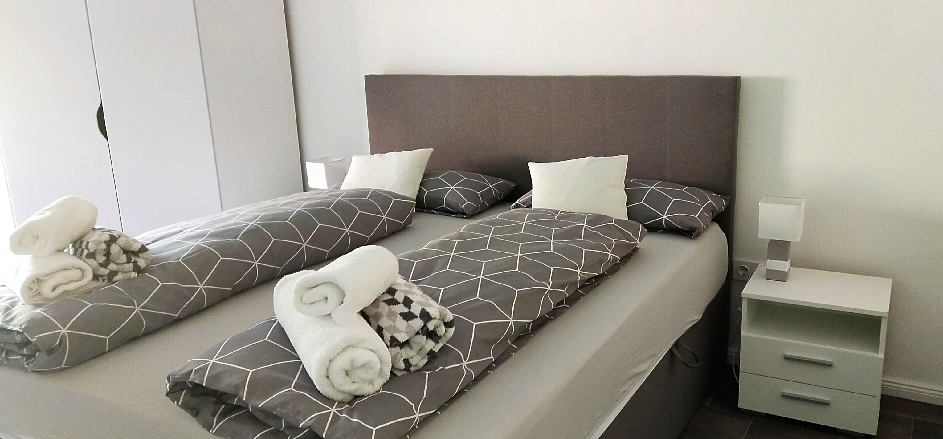 Die 84qm große Ferienwohnung ist in der 1. Etage. Alle Schlafzimmer sind mit einem 180 cm breiten Boxspringbett ausgestattet und sind auf der Gartenseite. Das größere Schlafzimmer verfügt über Smart TV , Schreibtisch und Balkon.