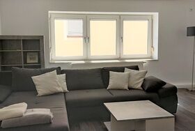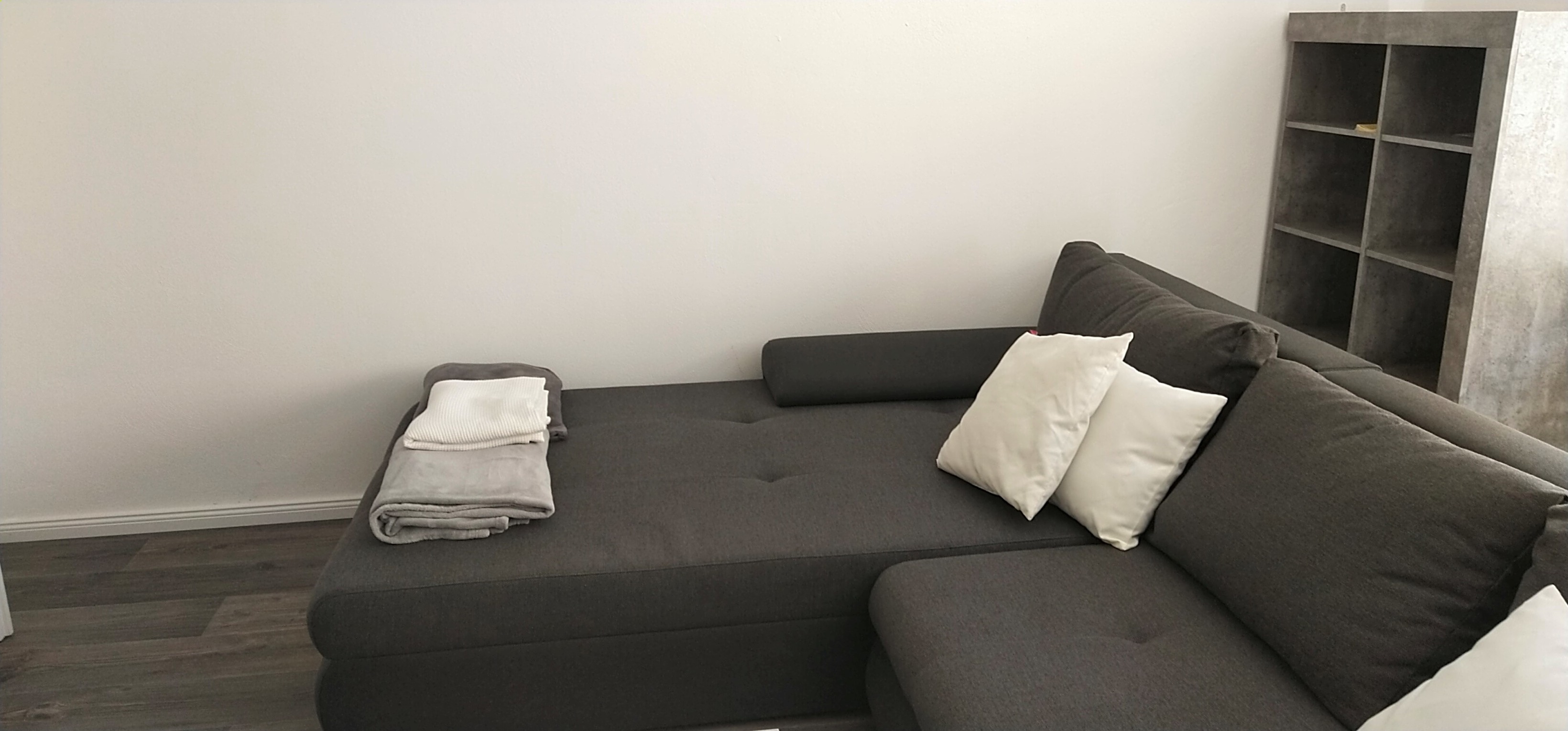 Das Wohnzimmer ist mit einer großen Schlafcouch, Smart TV mit Magenta TV und DAB Radio ausgestattet.