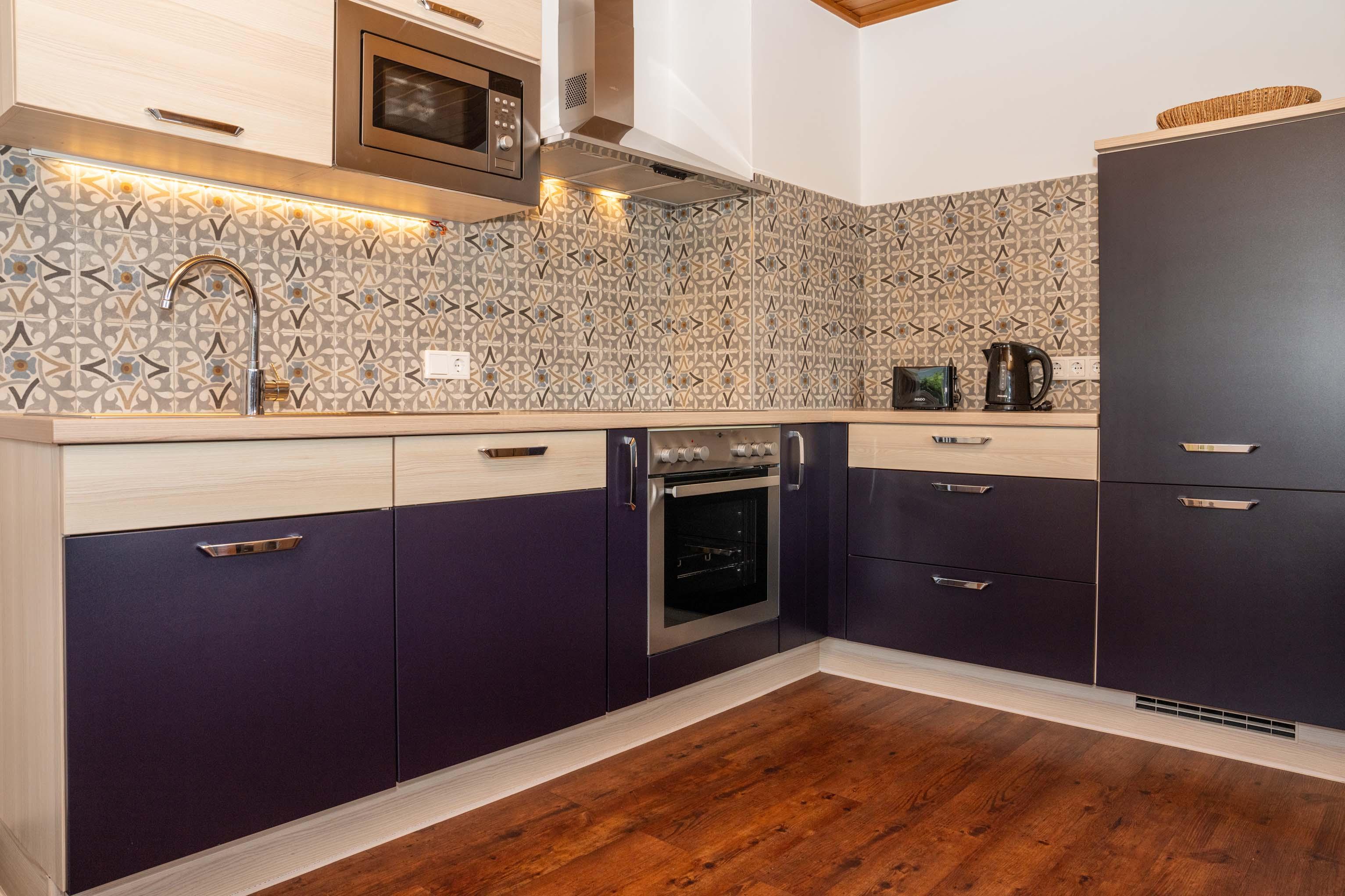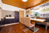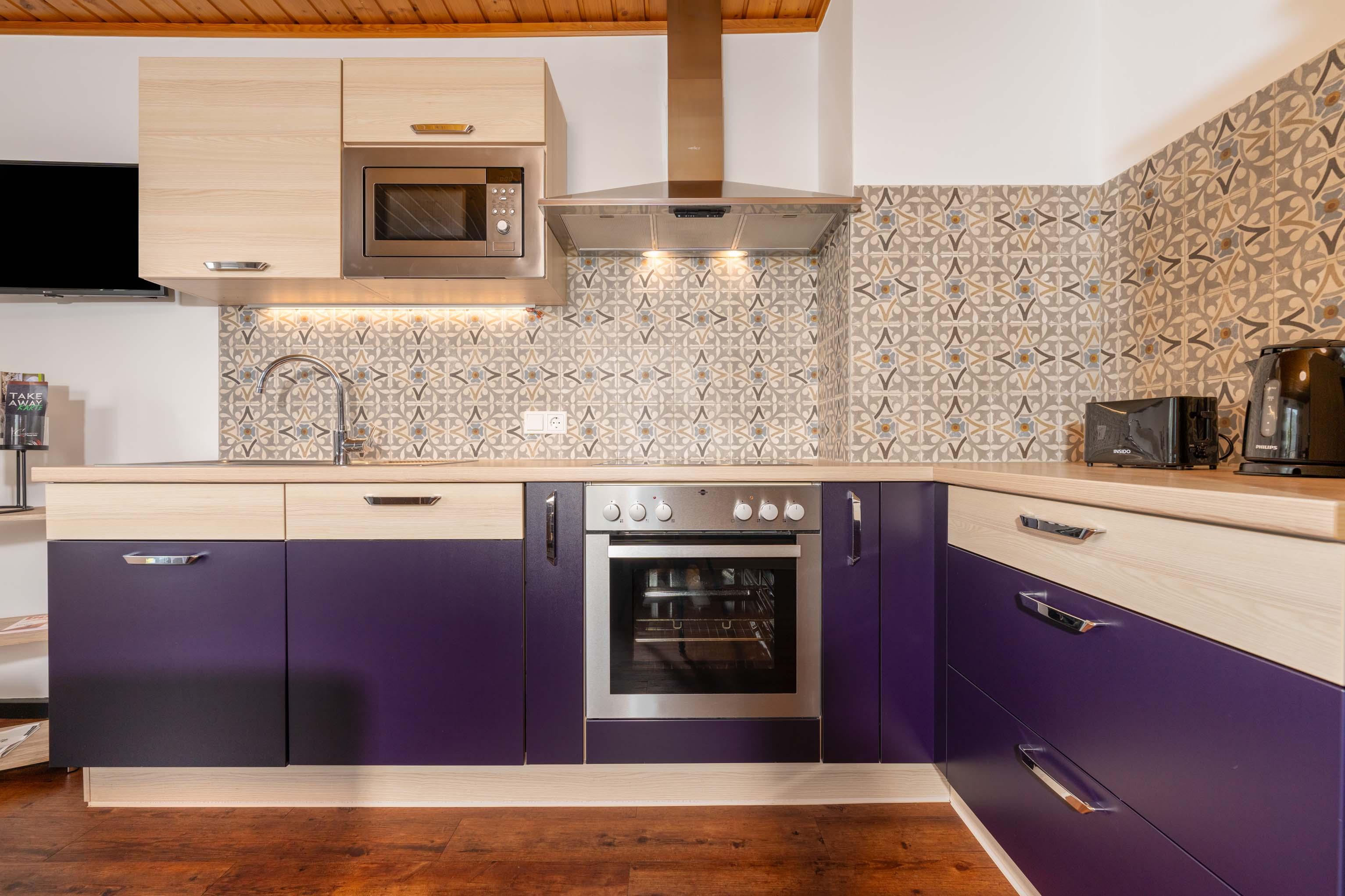 Schlafzimmer mit Doppelbett & TV Wohnzimmer mit zusätzlichem Schlafsofa für 2 Personen, sowie TV Einbauküche mit kompletter Ausstattung (Ceran-Kochfeld, Kühlschrank mit Gefrierfach, Umluft-Backofen, Mikrowelle, Geschirrspülmaschine, Kaffeemaschine, Wasserkocher …) Ausreichend Koch- und Essgeschirr