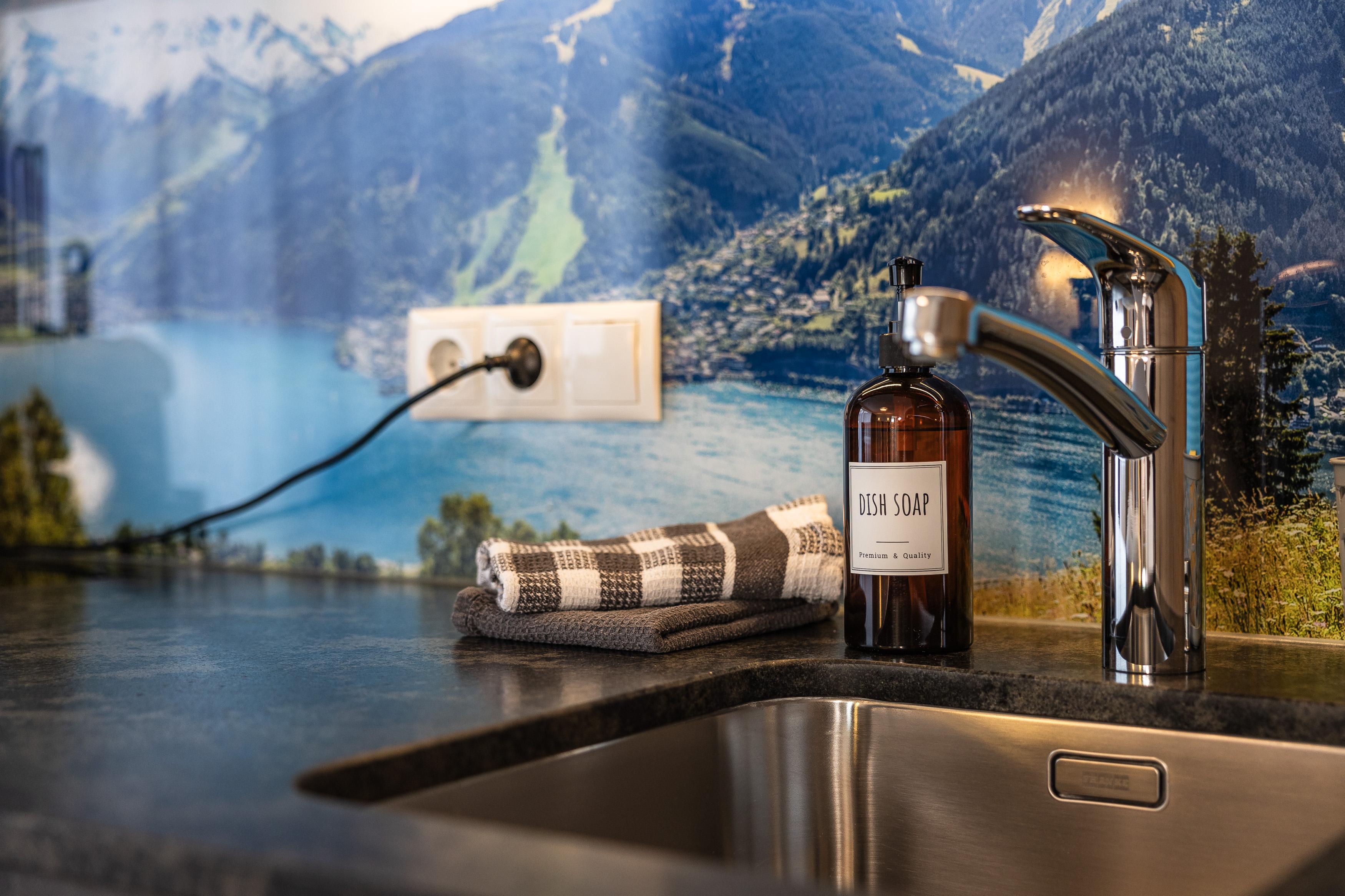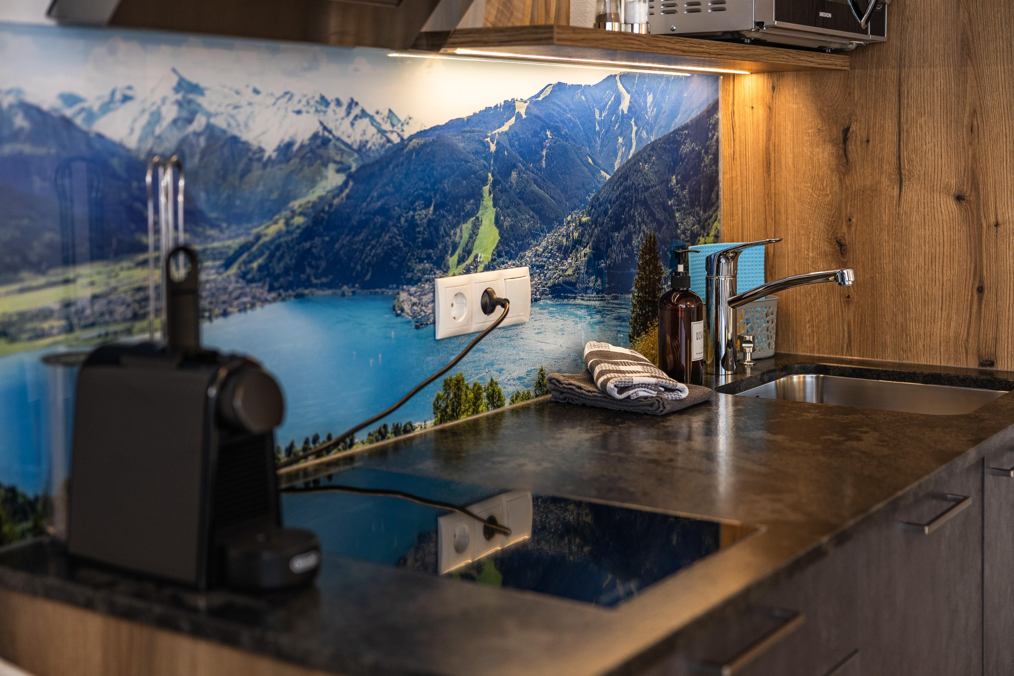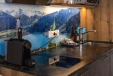 • Hochwertig ausgestattete Küche in jeder Ferienwohnung und Bergblick auf das Kitzsteinhorn
