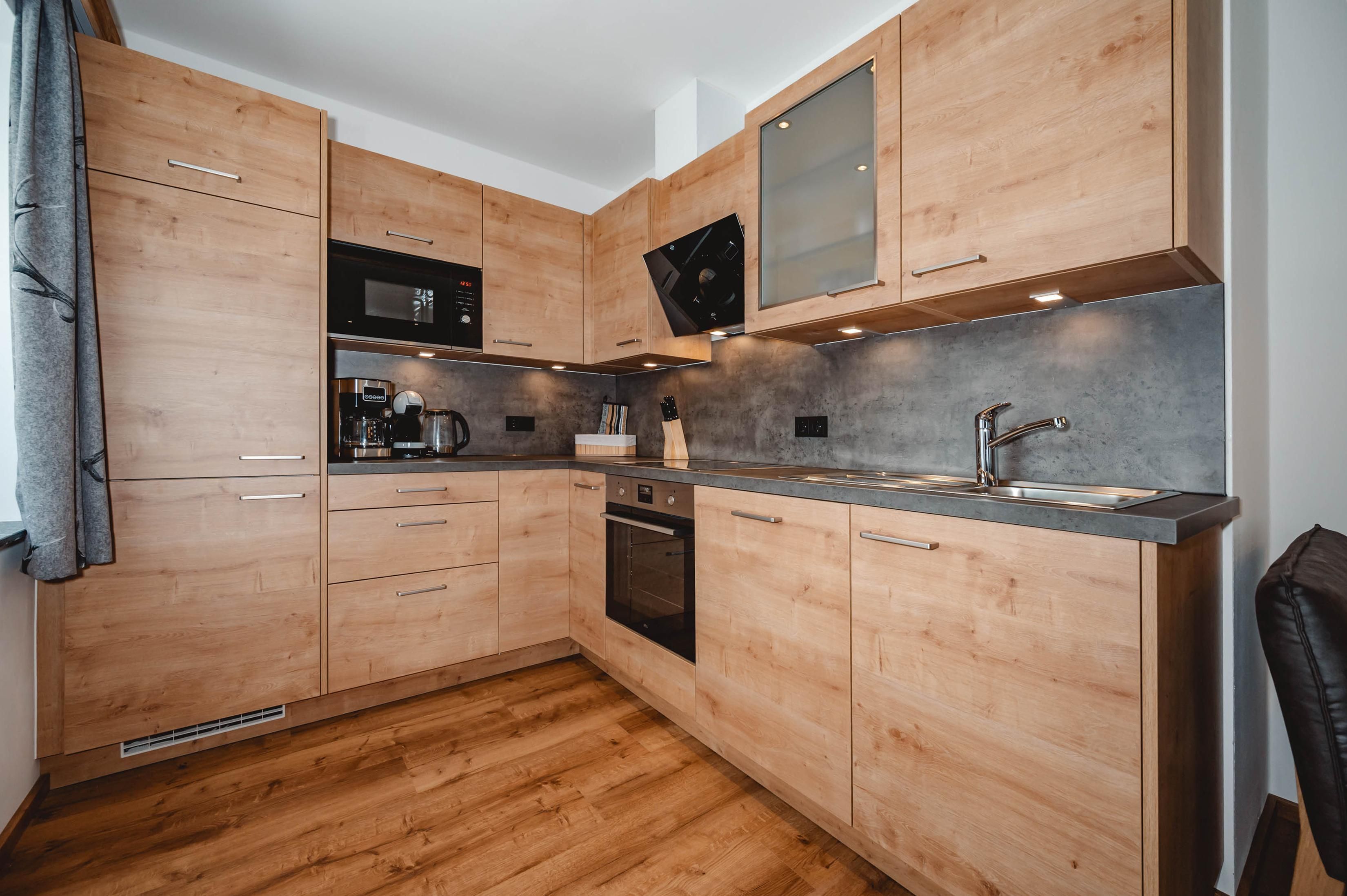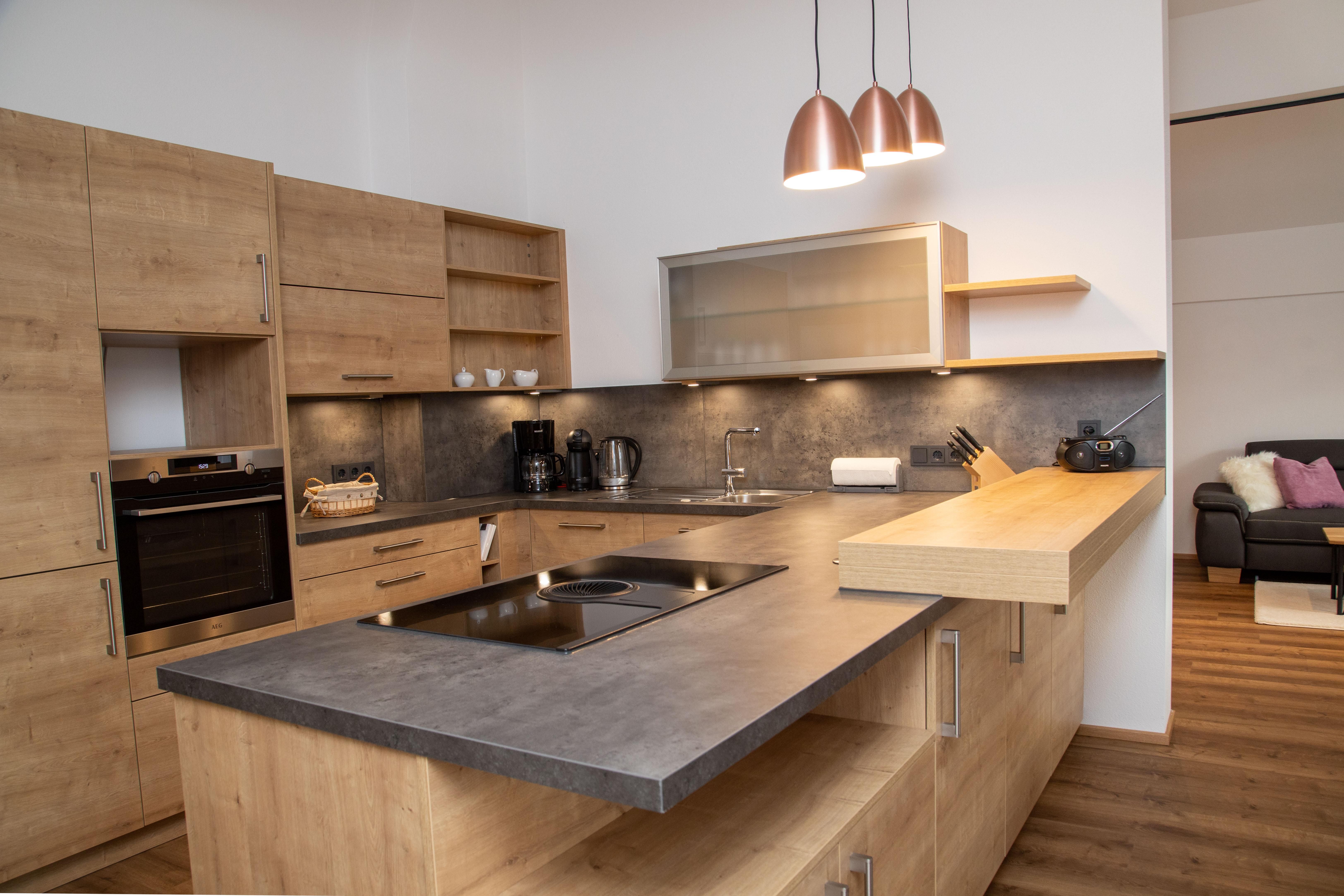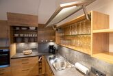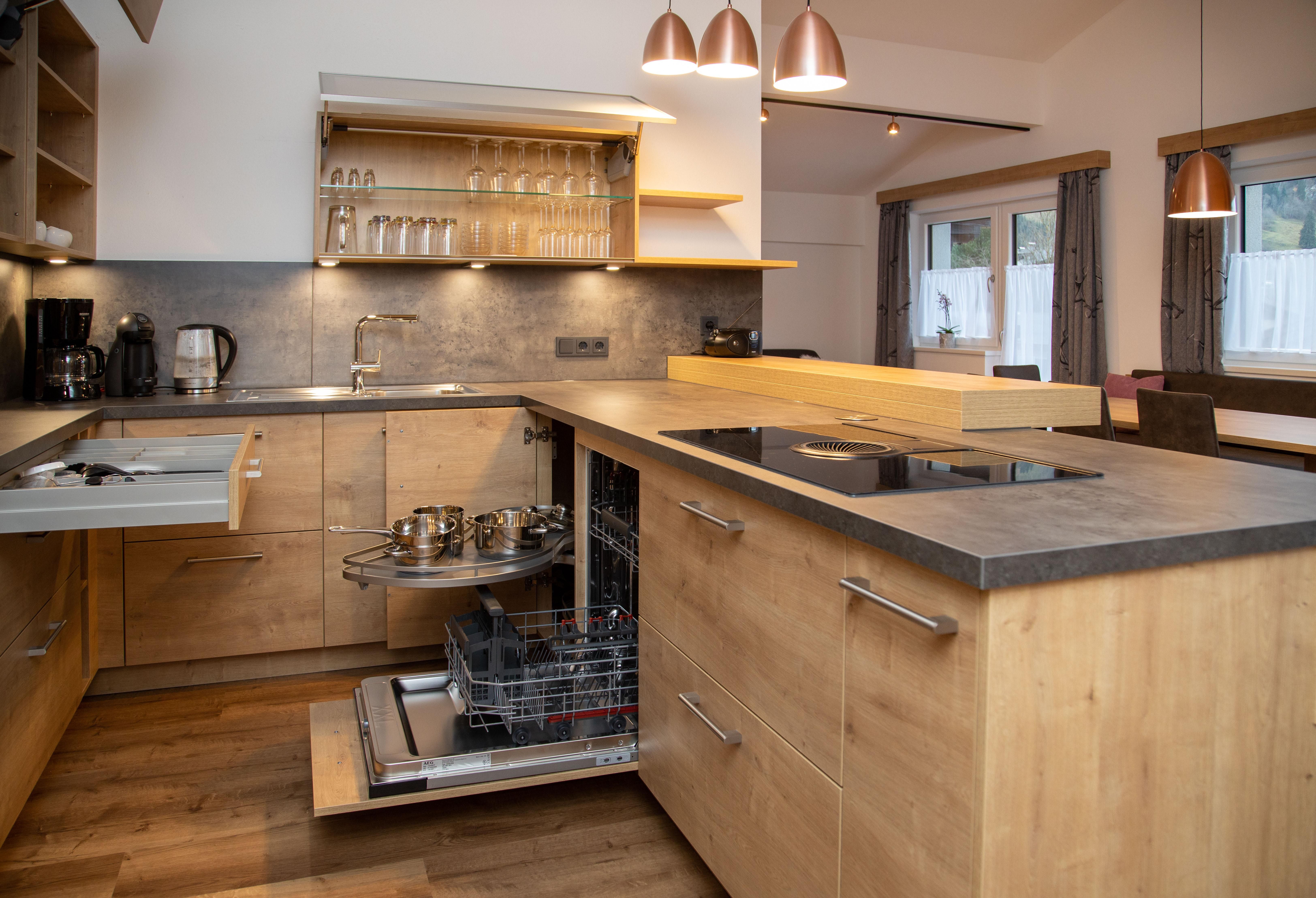 Kühlschrank, Gefrierfach, Elektroherd, Töpfe, Pfannen, Backofen, Mikrowelle, Geschirrspüler, Kaffeemaschine, Wasserkocher, Toaster, Eierkocher, Mixer, Geschirr & Besteck