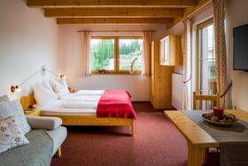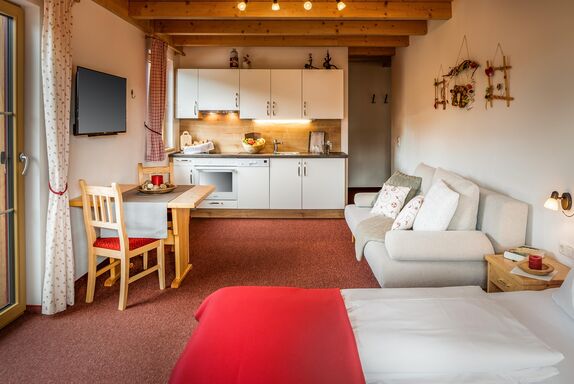 Die Appartements „Enzian“ (ca. 40m2) für 2-3 Personen bestehen aus einer voll ausgestatteten Küche, einem Schlaf- Wohnraum mit einem Doppelbett und Schlafcouch, oder einem abgetrennten Schlafzimmer mit Doppelbett und einer Schlafcouch im Wohnraum, Badezimmer mit Dusche/WC.