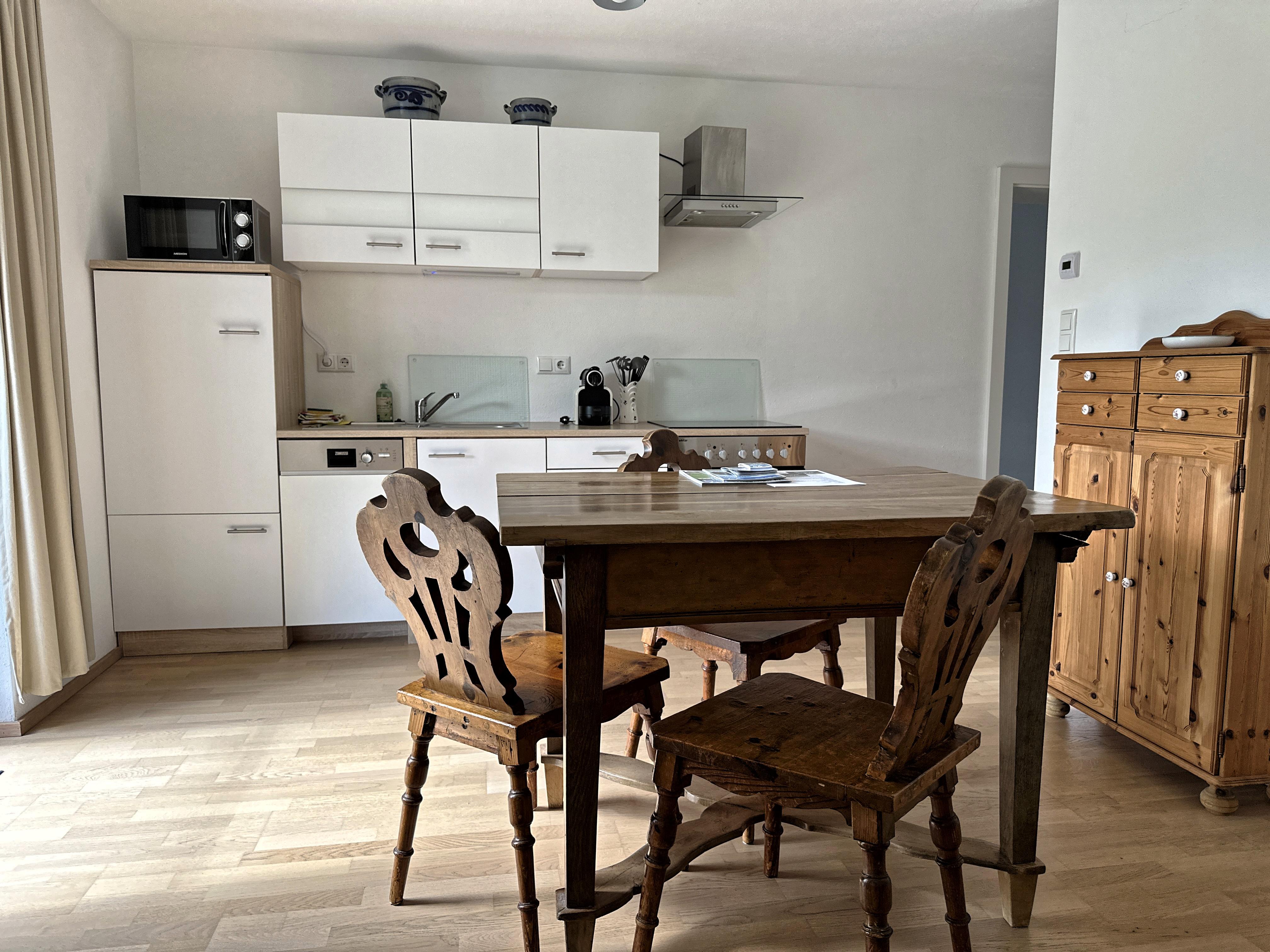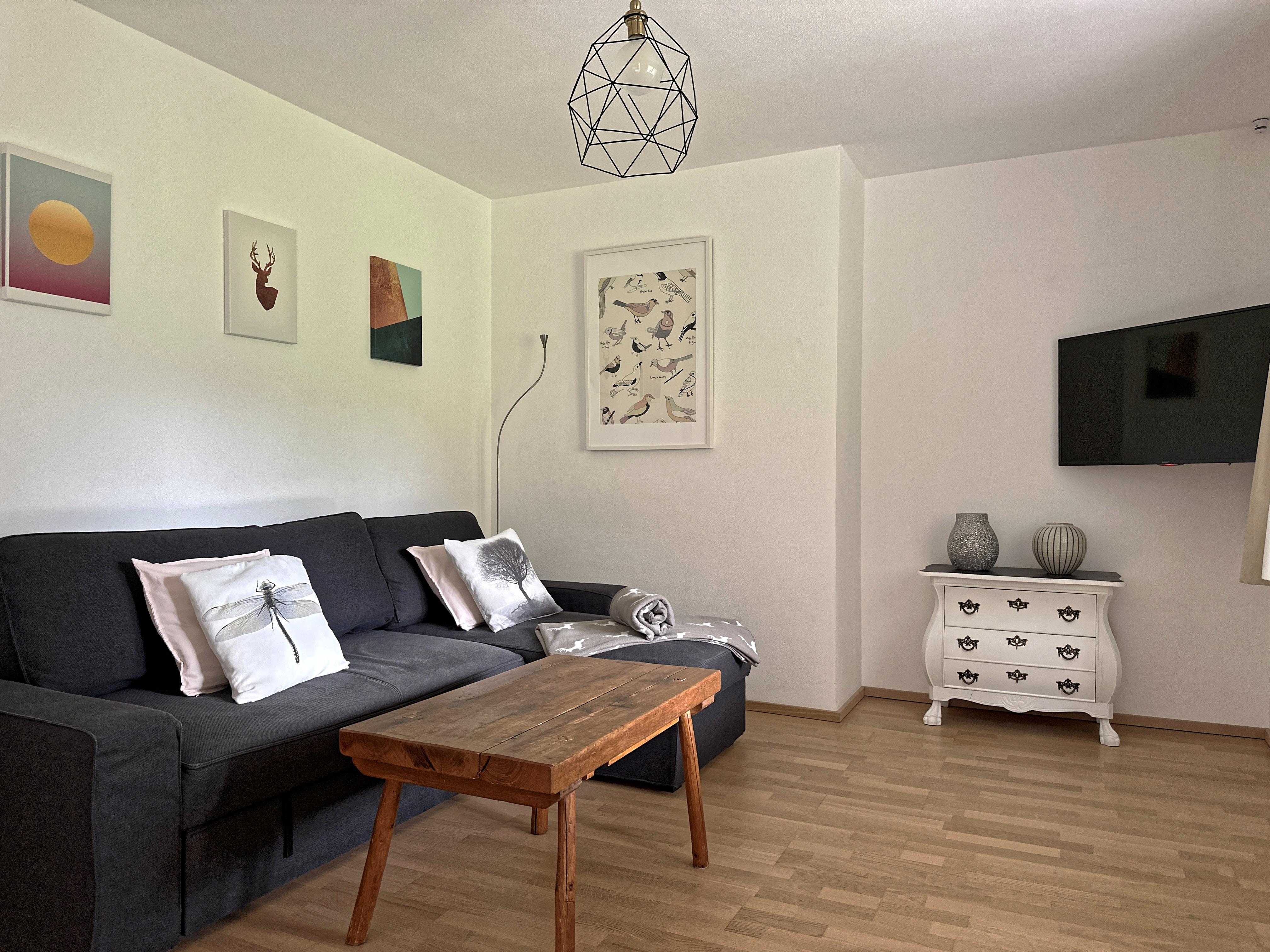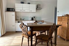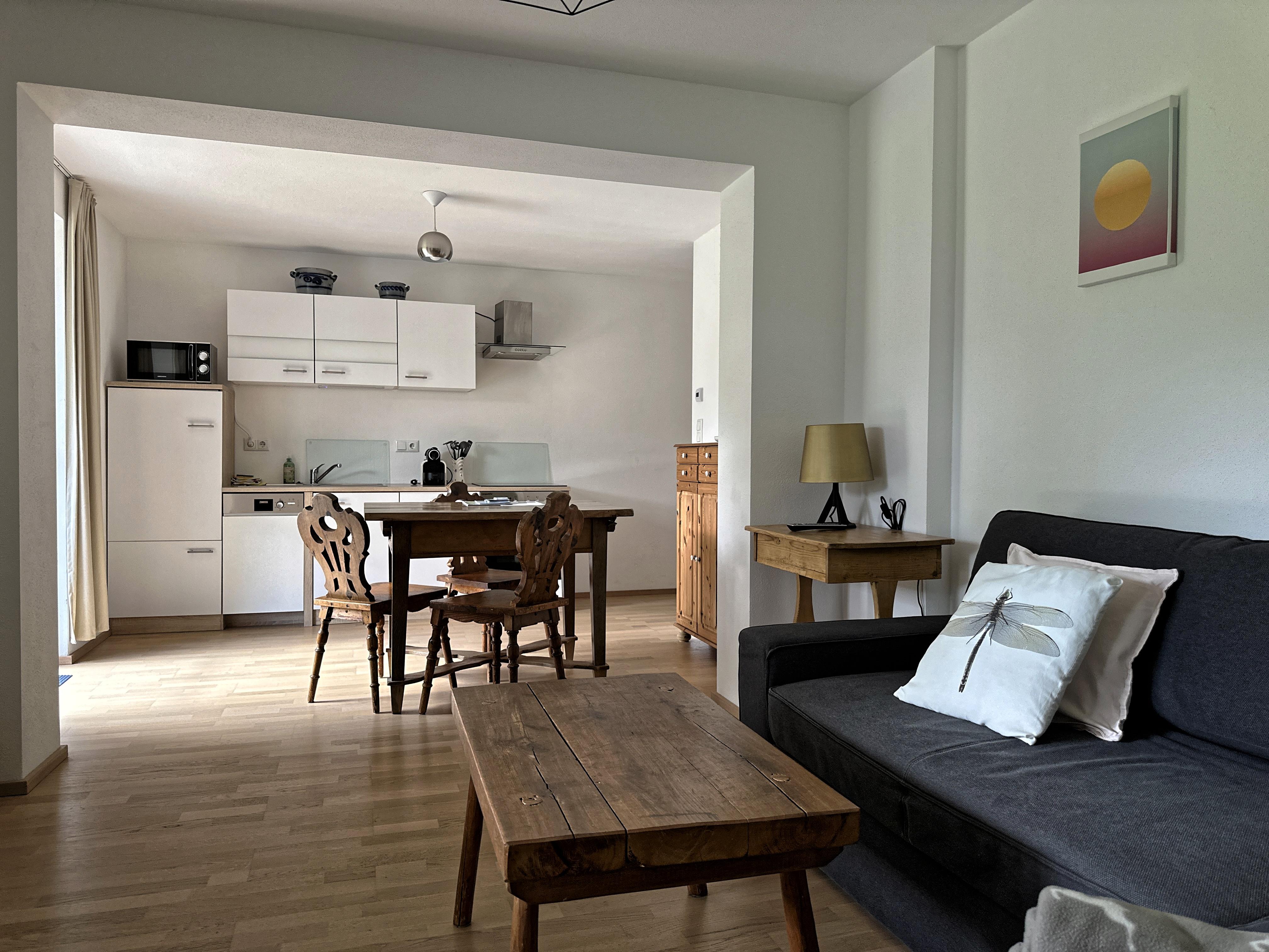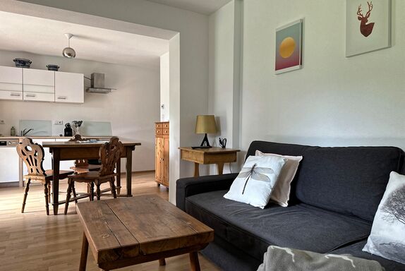 Die Ferienwohnung Talblick befindet sich im Erdgeschoss und verfügt über einen eigenen Eingang, welcher in einen großen Vorraum mit Bücherschrank, Waschmaschine und Wäscheständer und Schuhtrockner ausgestattet ist. Vom Vorraum aus erreicht man den Wohnraum mit Küchenzeile, Esstisch und gemütlicher Wohnzimmerecke. Vom Wohnzimmer aus geht eine Terrassentür auf die überdachte, westseitige Terrasse mit direktem Zugang zu einer pivaten Rasenfläche. Die Wohnung verfügt des weiteren über ein abgeschlossenes Badezimmer und ein Schlafzimmer.