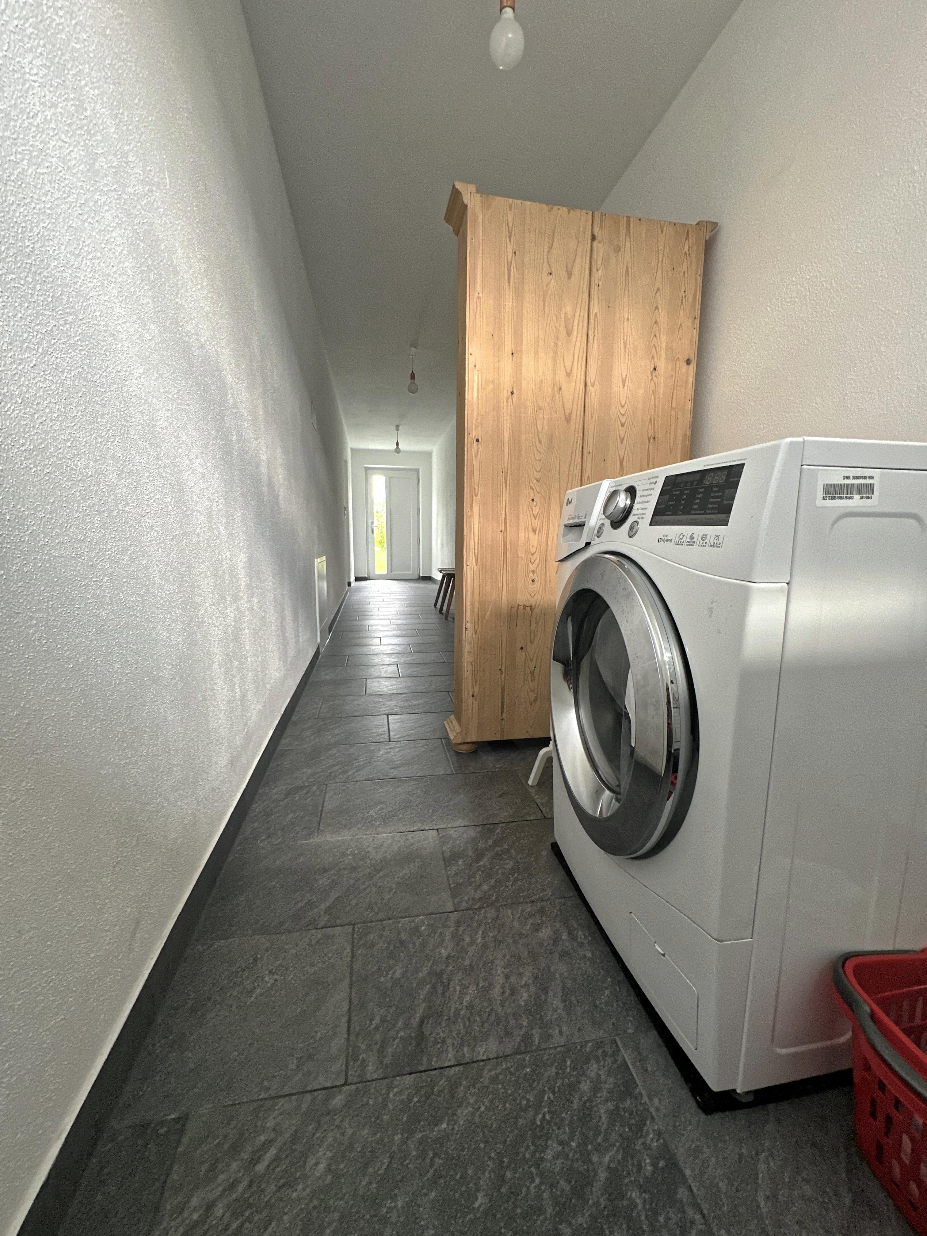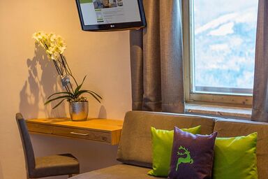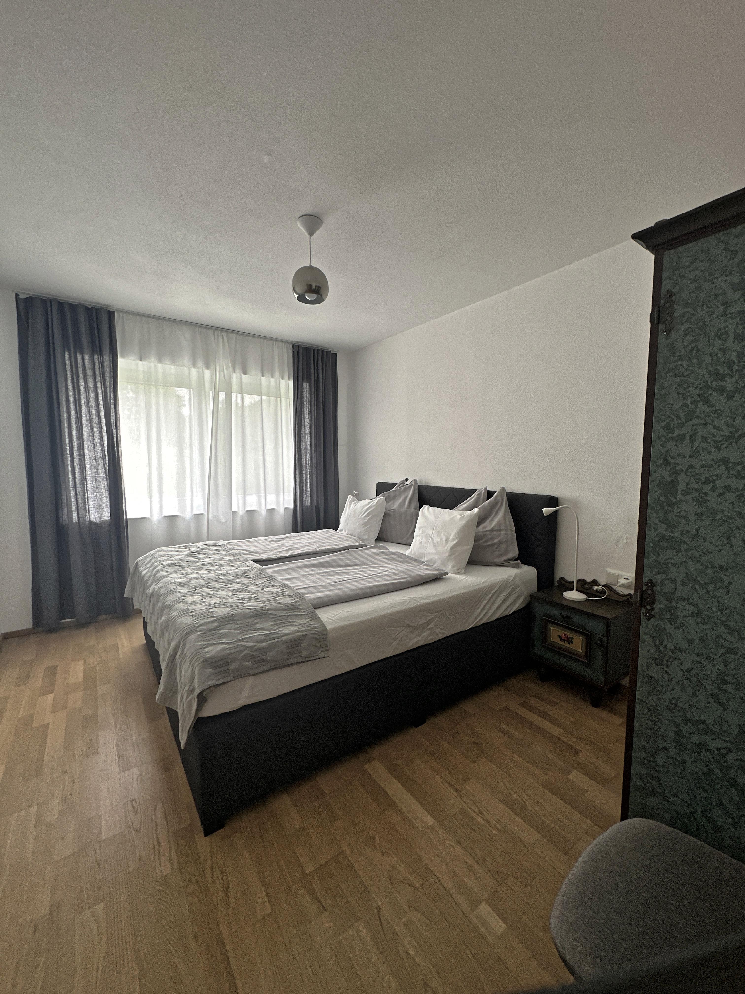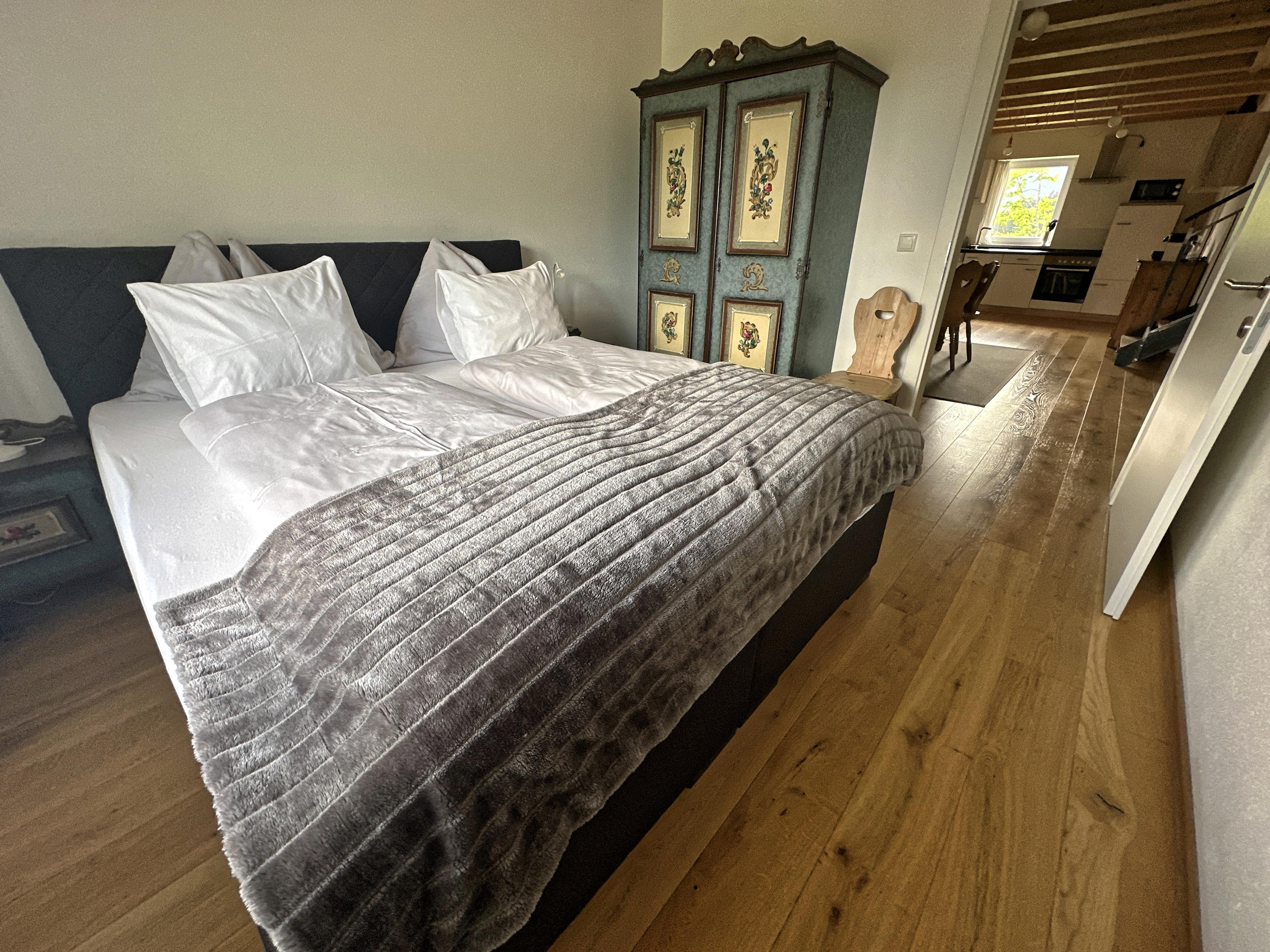 Die Ferienwohnung Talblick befindet sich im Erdgeschoss und verfügt über einen eigenen Eingang, welcher in einen großen Vorraum mit Bücherschrank, Waschmaschine und Wäscheständer und Schuhtrockner ausgestattet ist. Vom Vorraum aus erreicht man den Wohnraum mit Küchenzeile, Esstisch und gemütlicher Wohnzimmerecke. Vom Wohnzimmer aus geht eine Terrassentür auf die überdachte, westseitige Terrasse mit direktem Zugang zu einer pivaten Rasenfläche. Die Wohnung verfügt des weiteren über ein abgeschlossenes Badezimmer und ein Schlafzimmer.