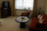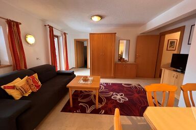 Das Wohnzimmer ist mit einem Schrank, Wohnlandschaft, Tisch und Fernseher (Kabel-TV) eingerichtet. Vom Wohnzimmer aus geht man auf den Balkon mit einer schönen Aussicht ins Felbertal und den Hohen Tauern.