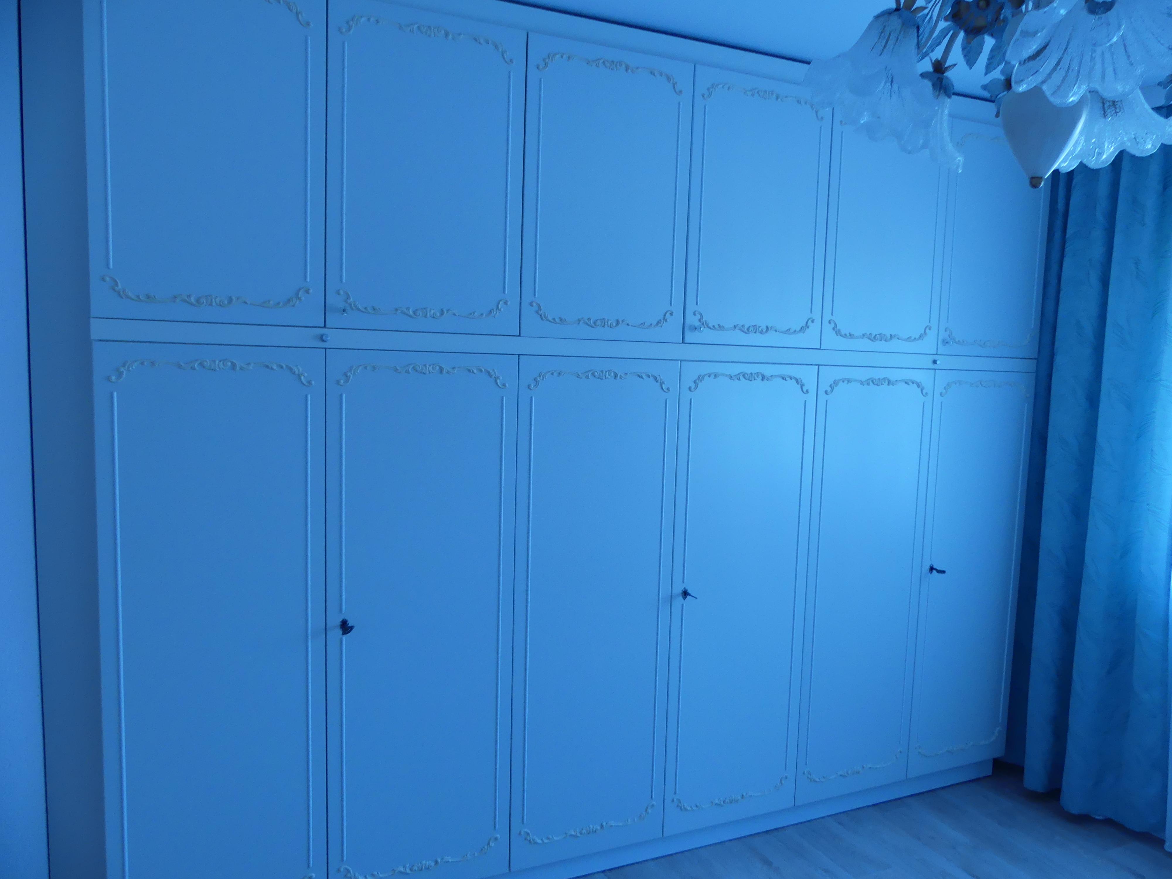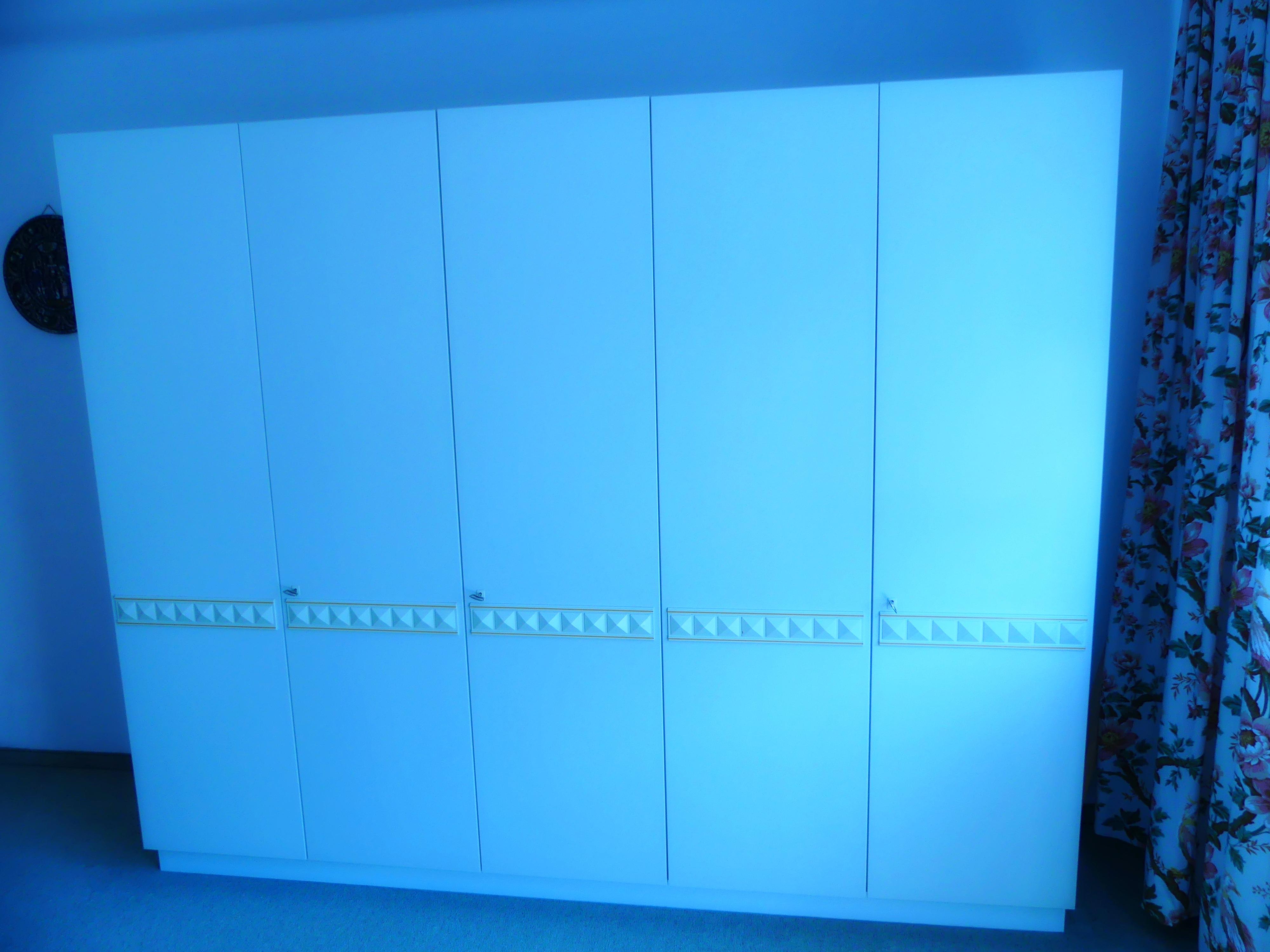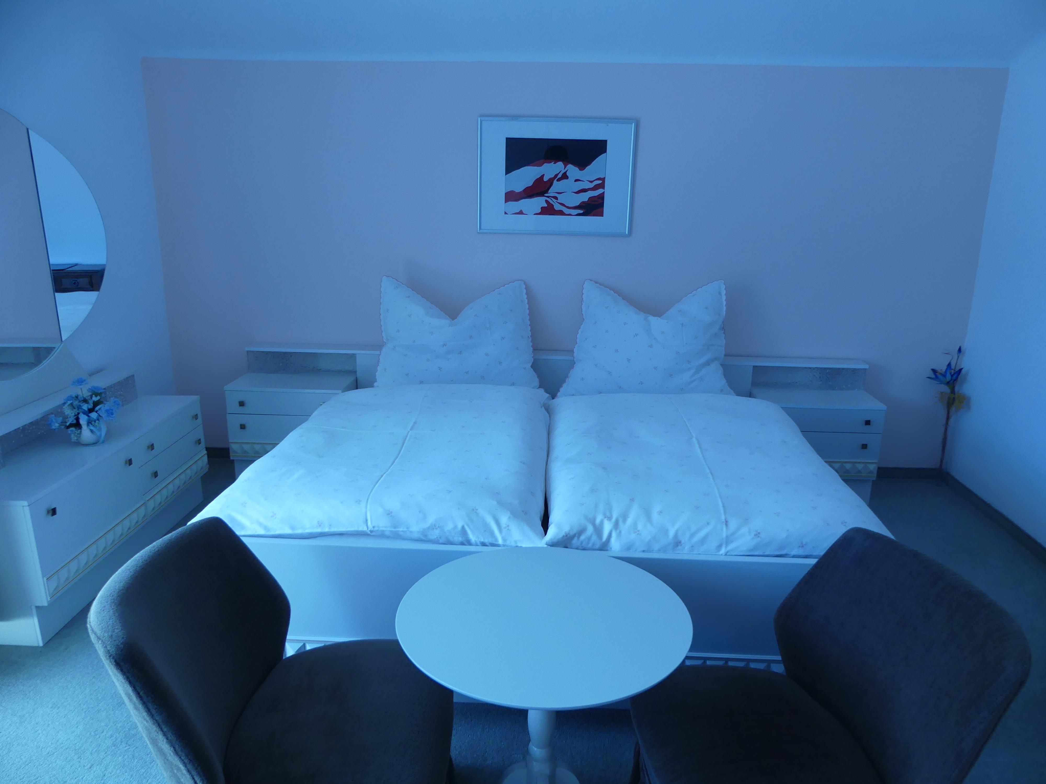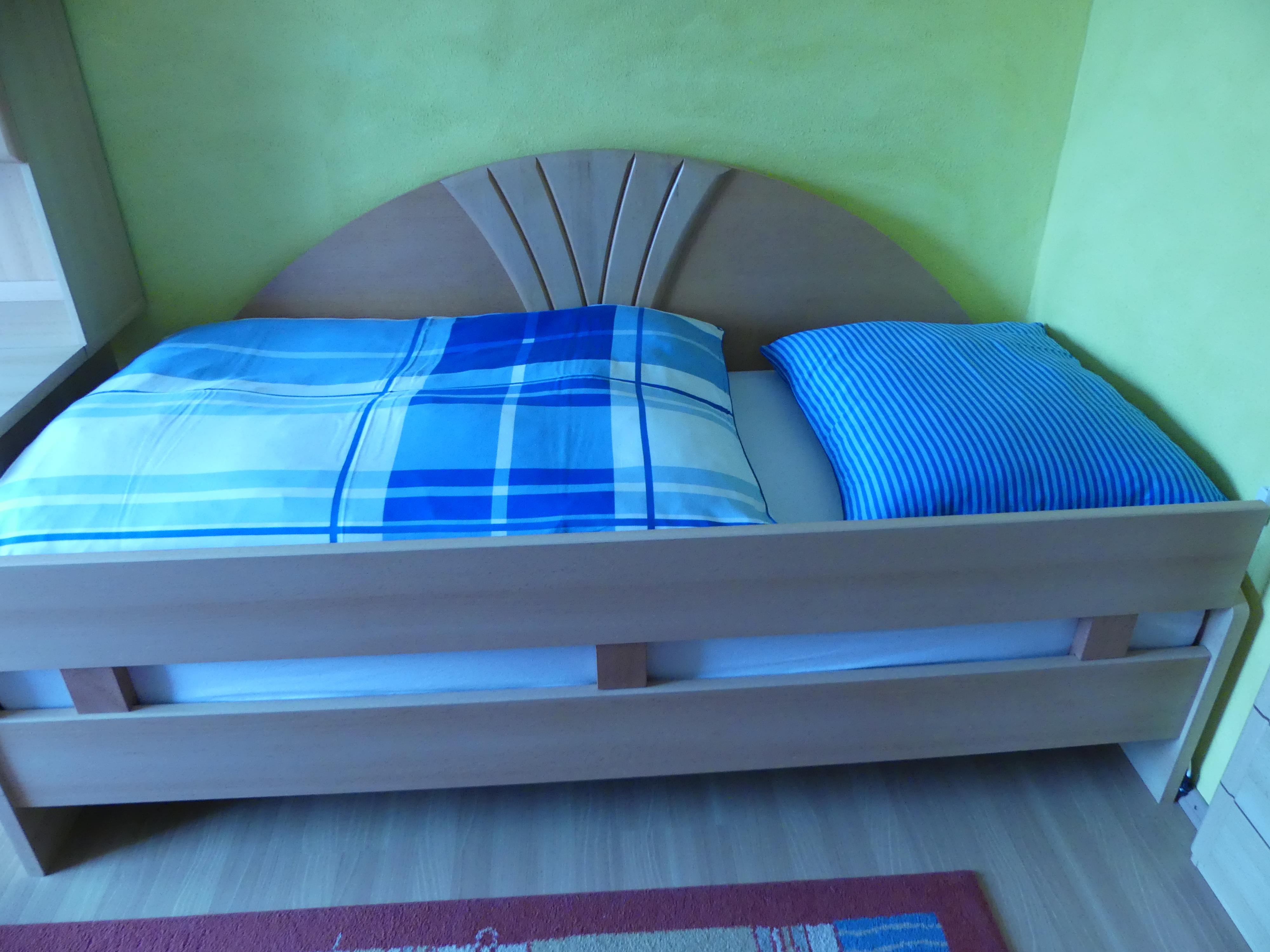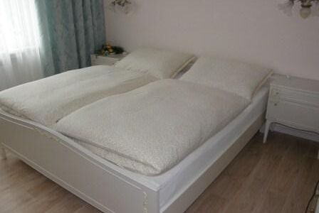Im Schlafzimmer befindet sich ein 6-teiliger Einbaukasten, Doppelbett, zwei Nachtkästen und eine Kommode mit Spiegel.