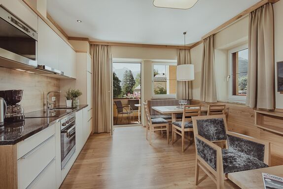 Versuchen Sie sich in der vollausgestatteten Küche an Gerichten aus der Region und genießen Sie die abendliche Sonne bei einem guten Glas Wein auf dem Balkon, mit atemberaubender Aussicht auf die Gasteiner Bergwelt. In den getrennten Schlafzimmern finden Sie, genau wie im offenen Ess- und Wohnbereich, einen Flatscreen vor.