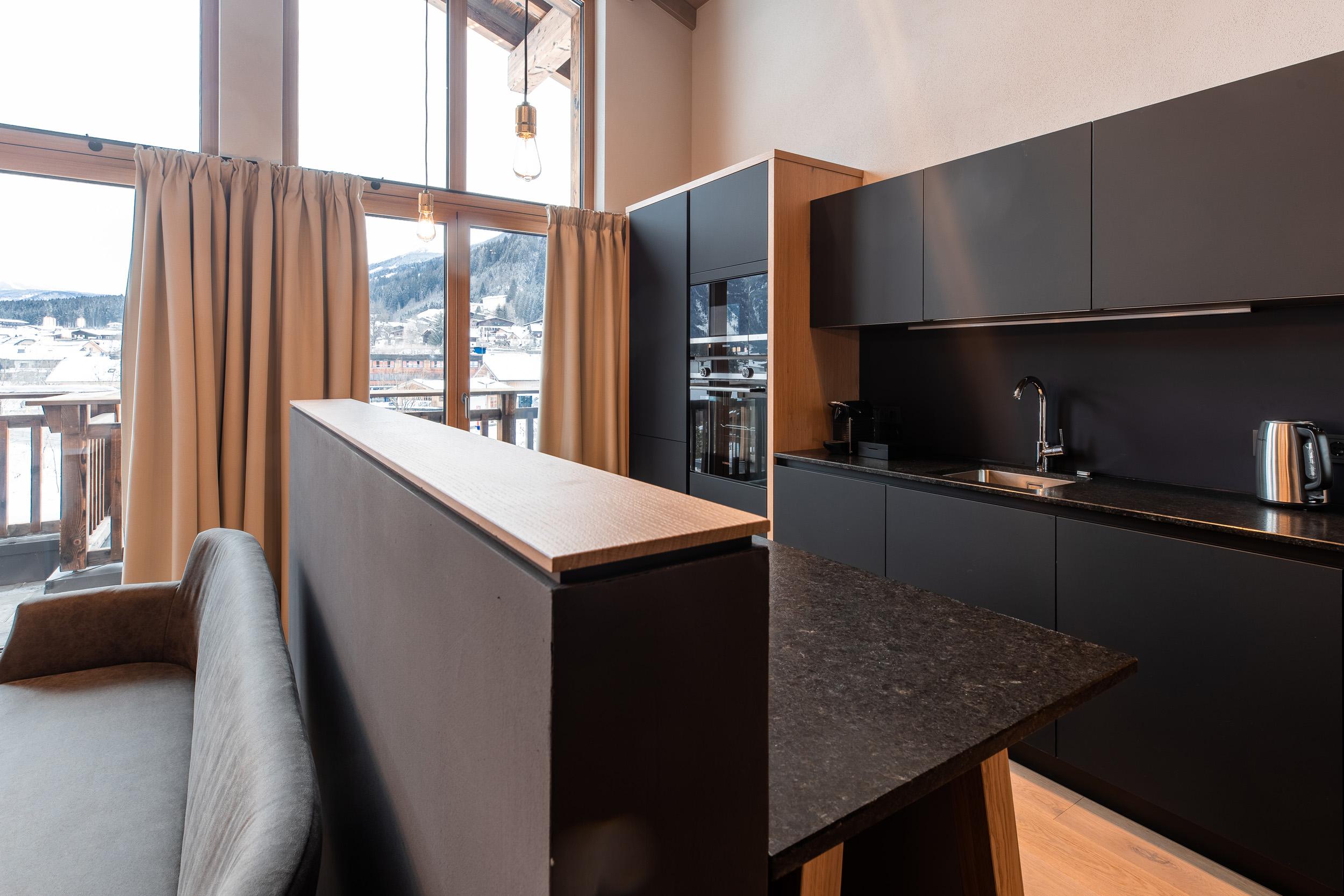 Alle Apartments und Penthouses der Wildkogel Resorts sind mit modernen Möbeln und traditionellen Materialien eingerichtet und verfügen über einen geräumigen Wohnbereich mit einem Flachbild-Sat-TV. Ihre Mahlzeiten können Sie in Ihrer modernen offenen Küchenzeile mit einem Essbereich zubereiten und genießen.