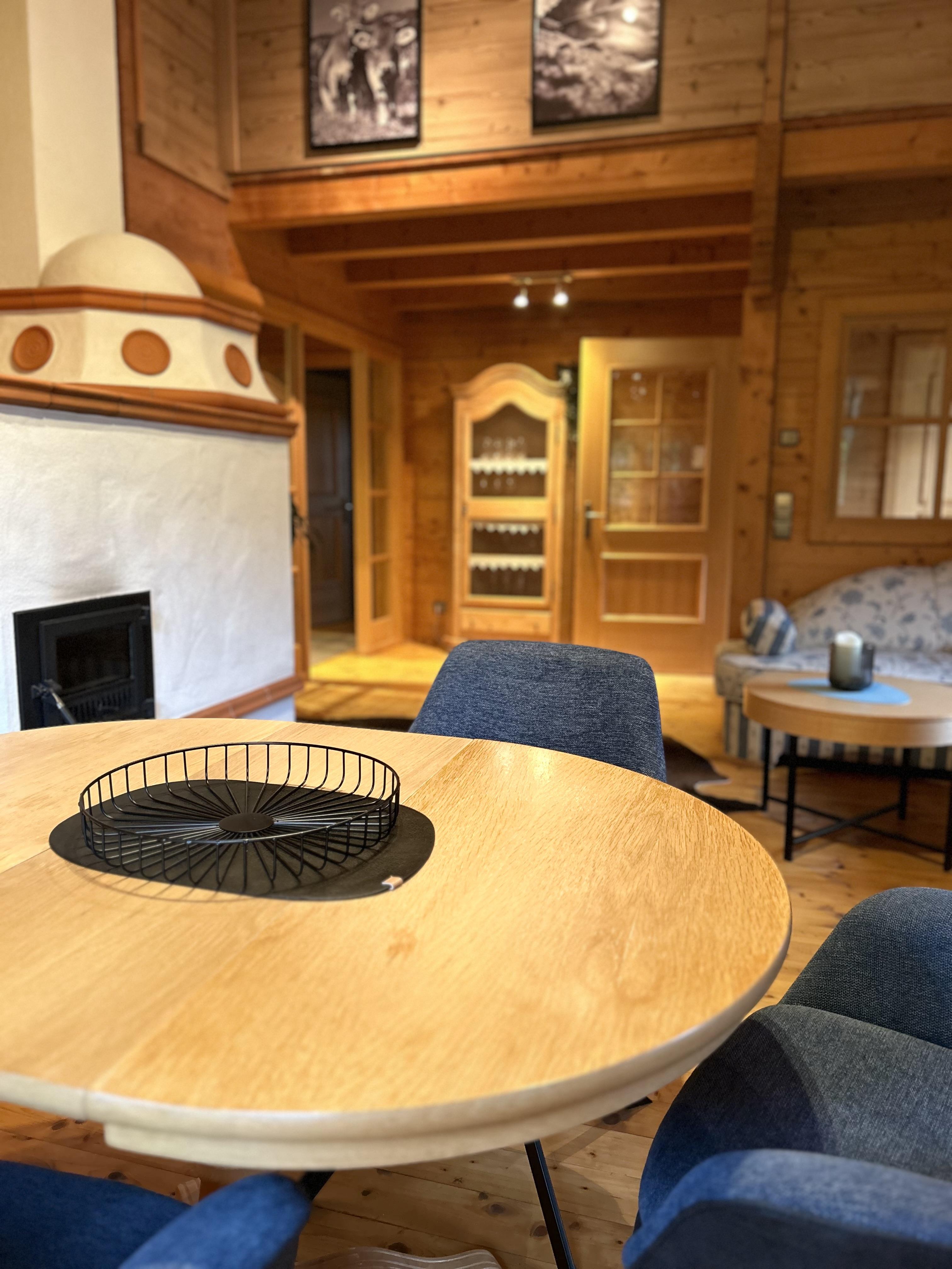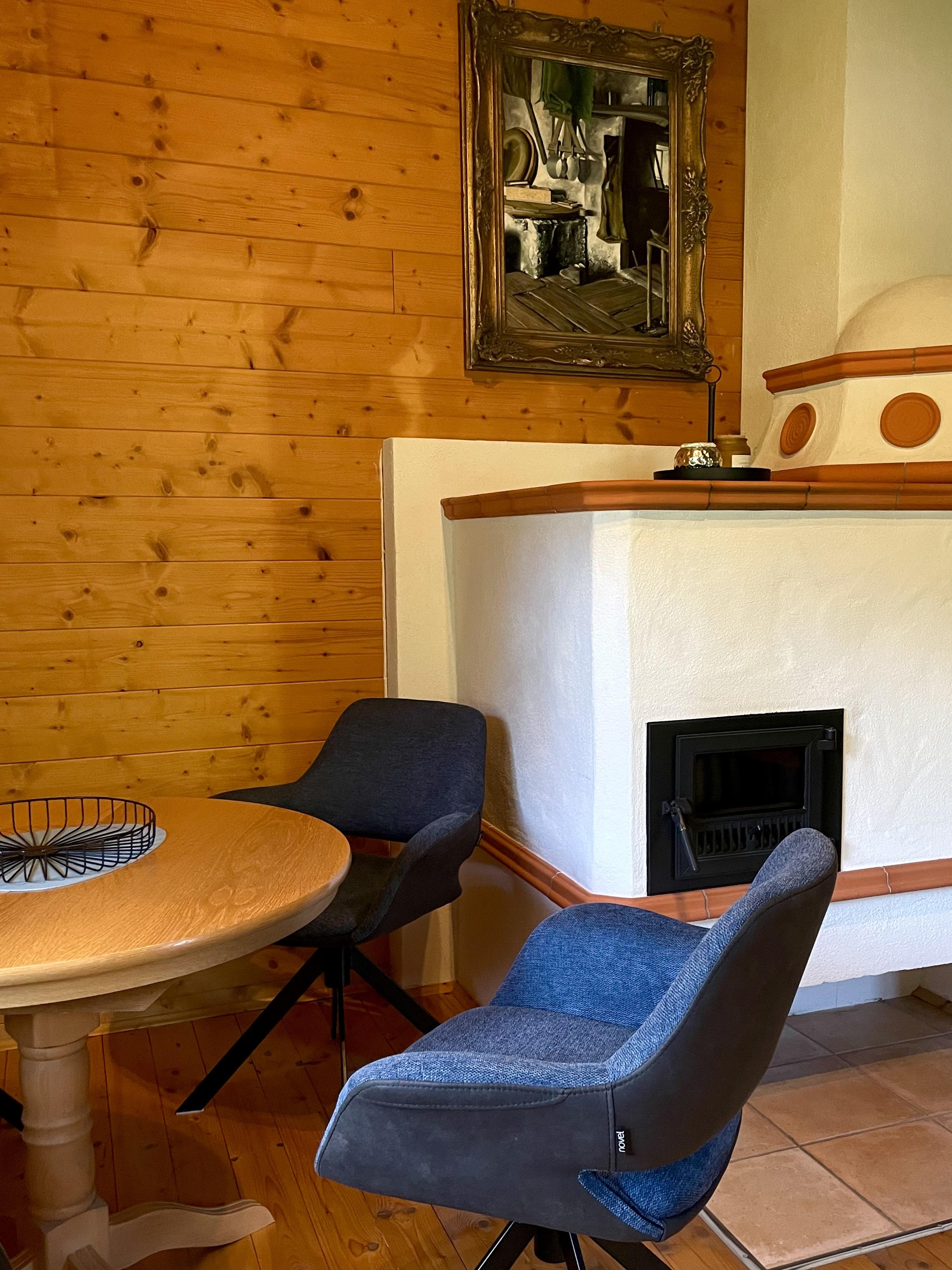 Großer Wohnbereich mit Couch, Sitzgelegenheit und als Highlight einen Kachelofen