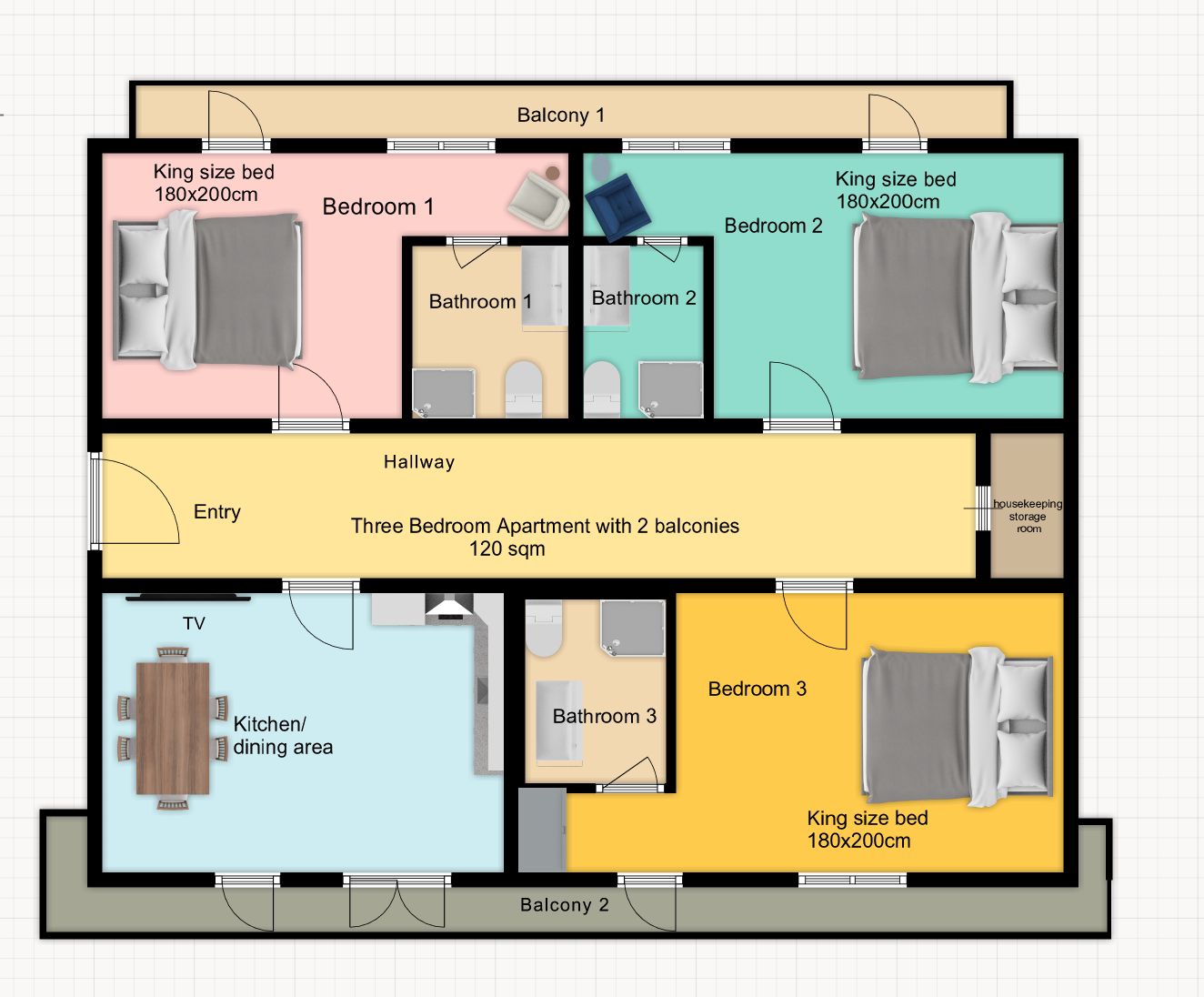 Die Wohnung Nr. 4 befindet sich im 2. Stock, ca. 120 m ², und besteht aus drei separaten Schlafzimmern, drei Duschbädern, einer Küche/einem Essbereich und einem großen Balkon. Alle Zimmer sind zum Hinterhof ausgerichtet. In jedem Schlafzimmer befindet sich ein Kingsize-Boxspringbett (180 x 200 cm).
