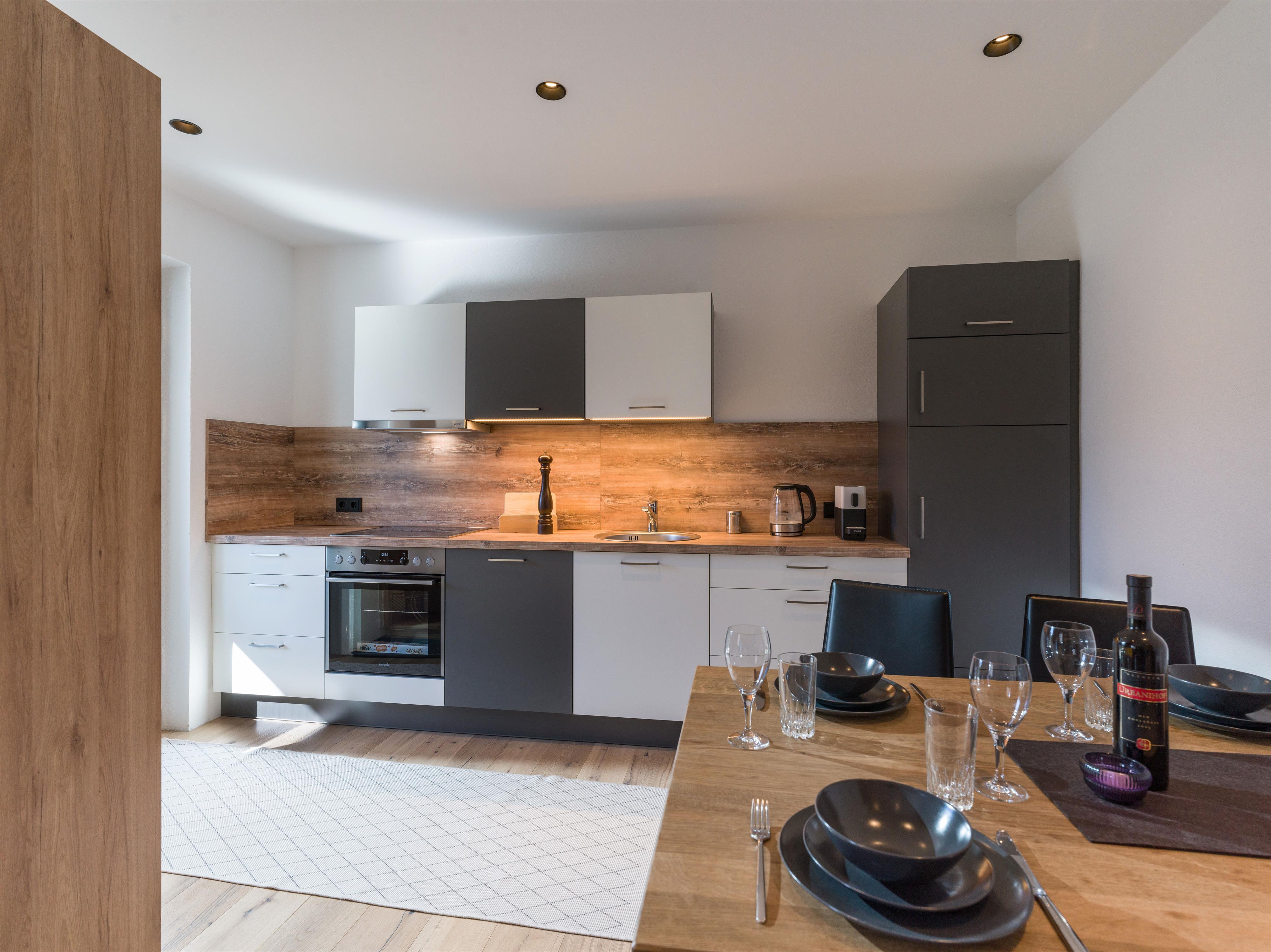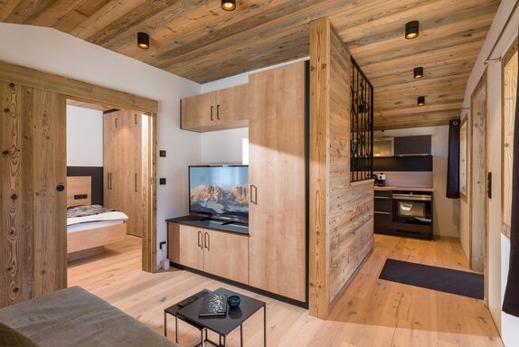 Unser Apartment mit ca. 42 m² ist ideal für 2 Personen. Das Apartment verfügt über eine Wohnküche mit Ausziehcouch für bis zu 2 Kinder (140 cm), einem Schlafzimmer und ein Badezimmer mit Dusche/WC, einer Panoramaterrasse und einer Infrarotkabine.