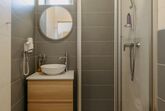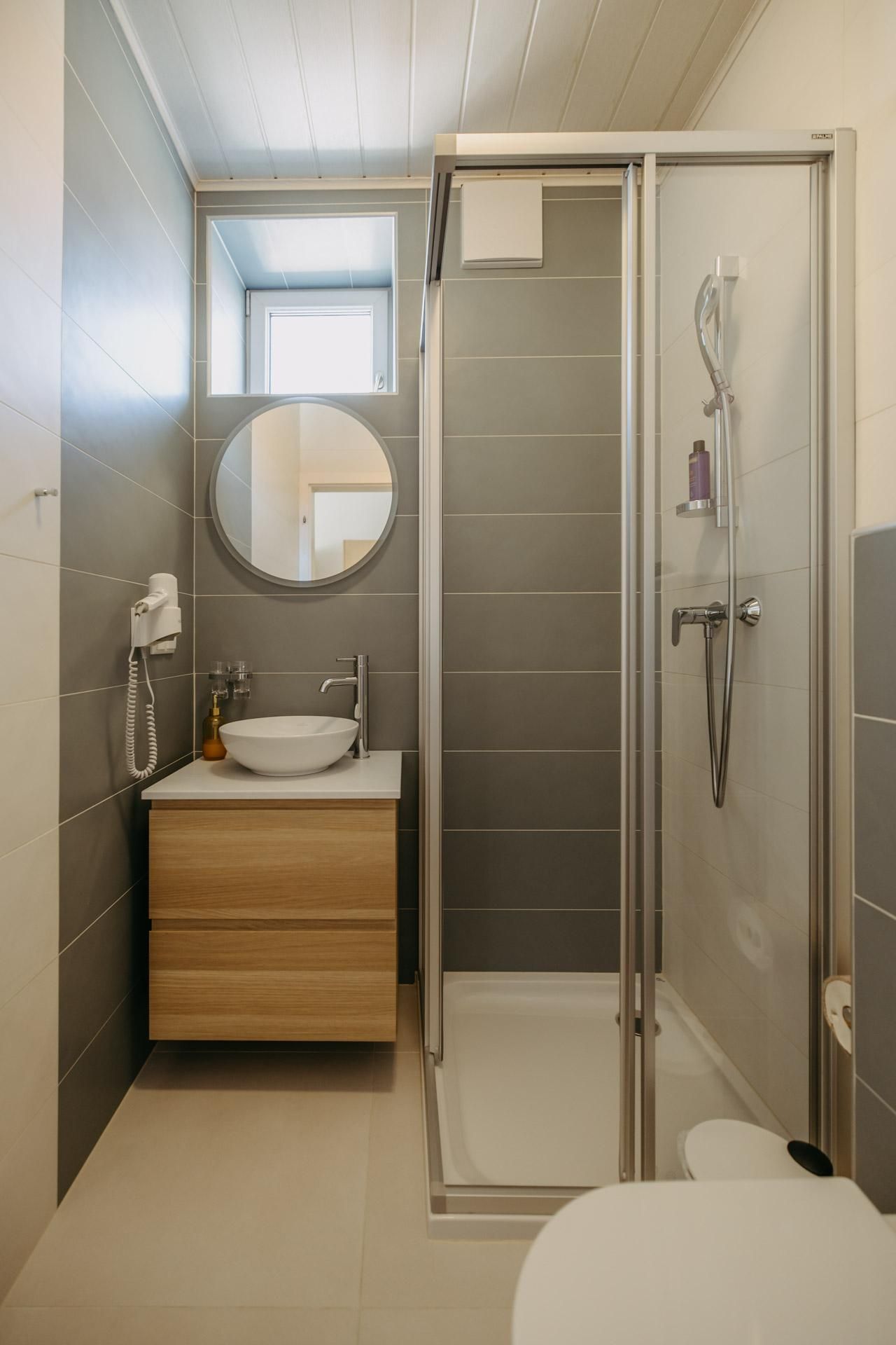 Das Badezimmer verfügt über einen Haarföhn, einem beheizbaren Spiegel mit LED Beleuchtung, genügend Stauraum für Ihre Waschutensilien, einer modernen Dusche und WC.