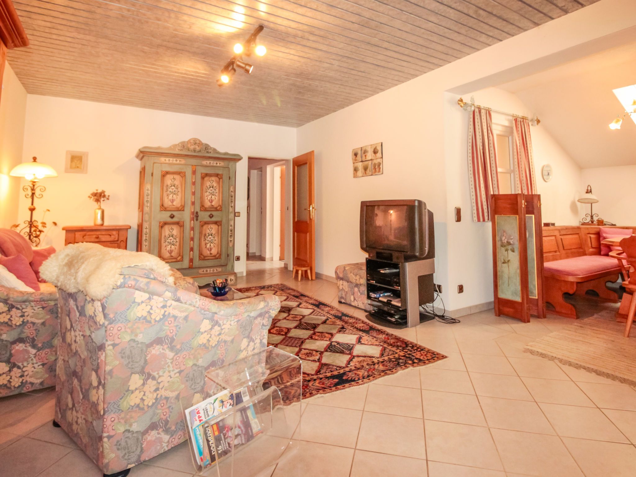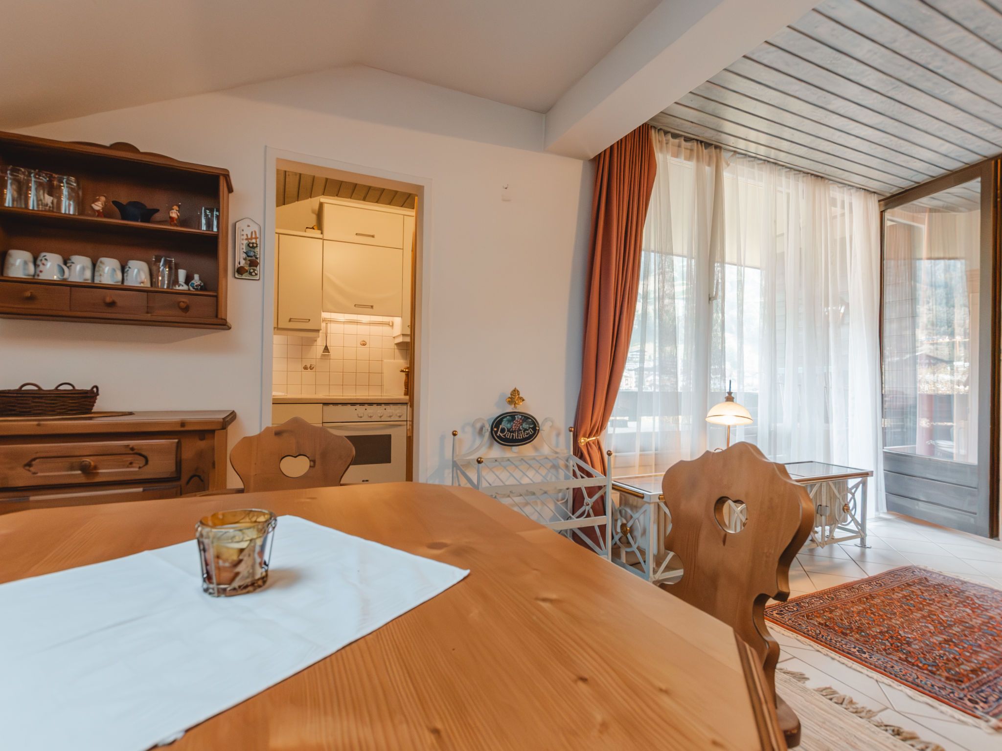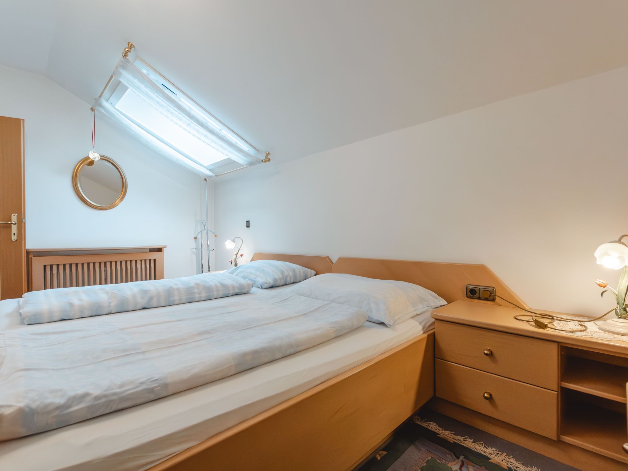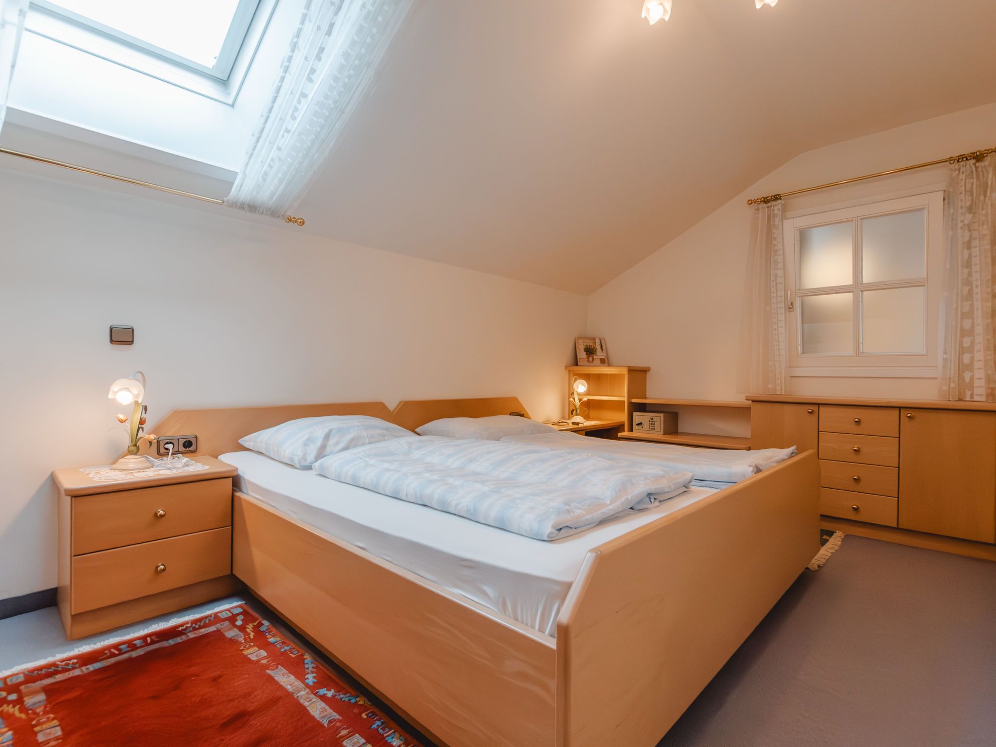 Alex Top 68, 2-Zimmer-Wohnung 75 m2, im Obergeschoss. Geräumig und hell, komfortabel und gemütlich eingerichtet: Eingang. Wohn-/Esszimmer mit 1 Doppeldiwanbett, Essecke, Kabel-TV und Radio. Ausgang zum Balkon. 1 abgeschrägtes Doppelzimmer mit Dachfenster. Kleine Küche (Backofen, Geschirrspüler, 4 Glaskeramikplatten, Toaster, Wasserkocher, elektrische Kaffeemaschine). Bad/WC. Grosser Balkon. Balkonmöbel. Schöne Sicht auf die Berge. Zur Verfügung: Waschmaschine. Garage. Bitte beachten: geeignet für Familien. Rauchmelder. 50402-000709-2020