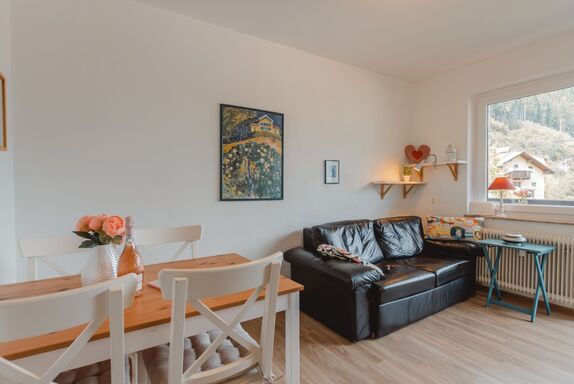 Smilla, 2-Zimmer-Wohnung 42 m2 im 1. Stock. Hell, vollständig renoviert, sehr schön und geschmackvoll eingerichtet: Eingang. Wohn-/Esszimmer mit 1 Diwanbett und Esstisch. Ausgang zum Balkon. 1 Doppelzimmer mit 1 Doppelbett und Sat-TV (Flachbildschirm). Kleine Küche (Backofen, Geschirrspüler, 4 Glaskeramikplatten, Toaster, Wasserkocher, elektrische Kaffeemaschine). Bad/WC. Parkettboden. Grosser Balkon. Balkonmöbel. Sehr schöne Sicht auf die Berge und das Tal. Bitte beachten: geeignet für Familien. Rauchmelder. 50403-000278-2020