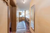 Küche- Essraum: Vorraum mit Esstisch und Stühlen, Garderobe, Kochfeld, Schränke, Kühlschrank mit kleinem Gefrierfach, Filter Kaffemaschine, Wasserkocher und Geschirr
