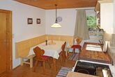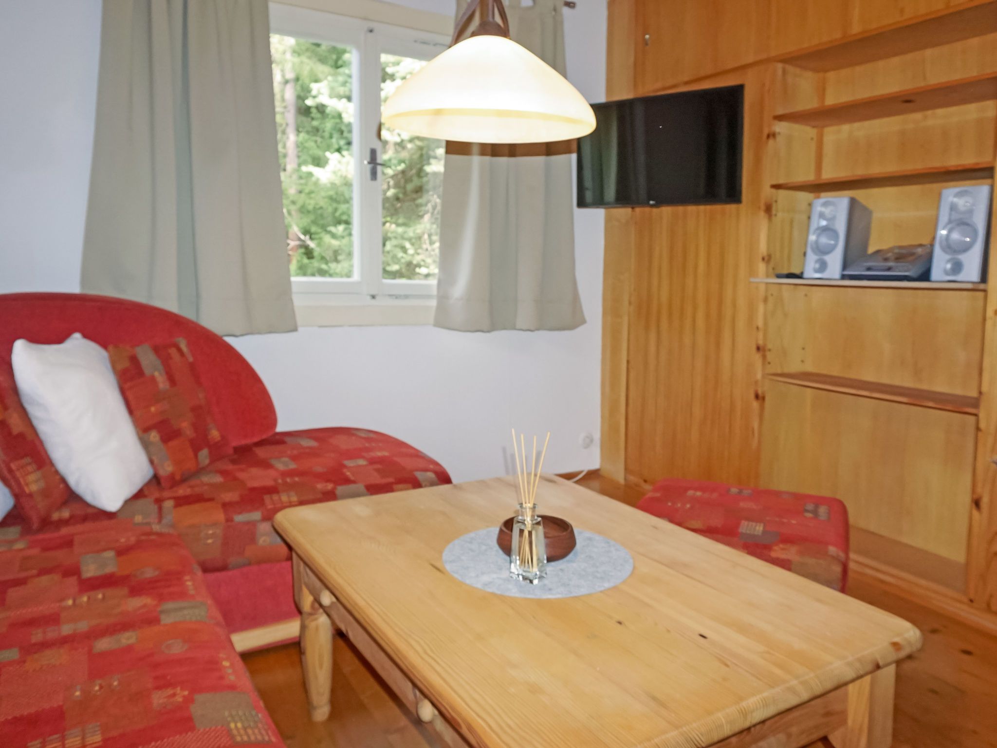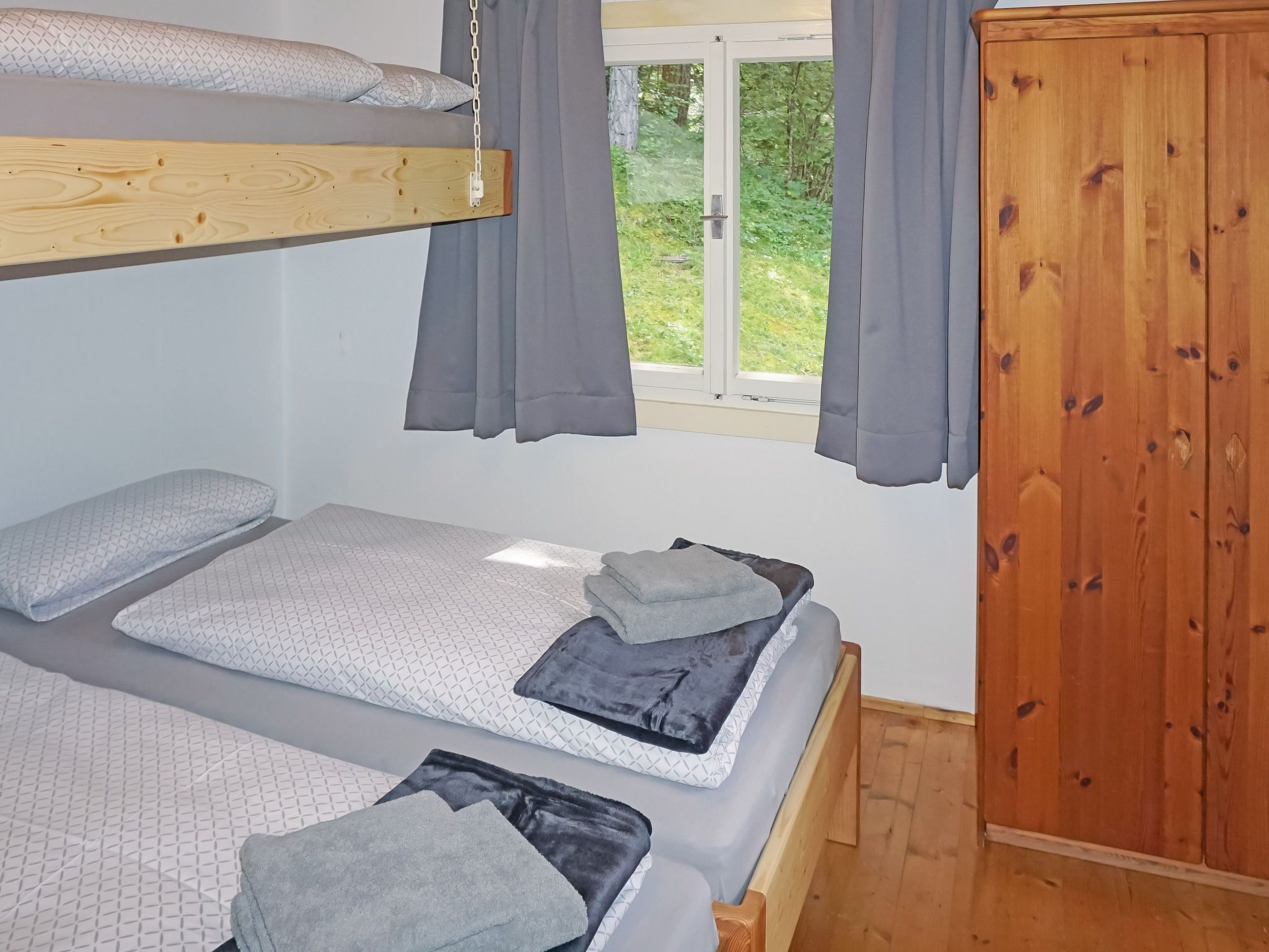 3-Zimmer-Haus 80 m2. Rustikal und mit viel Holz eingerichtet: Eingang. 1 Zimmer mit 2 Betten. 1 Zimmer mit 1 x 1 Etagenbetten, 1 Doppelbett. Grosse Wohnküche (Backofen, 4 Glaskeramikplatten, Toaster, Wasserkocher, Mikrowelle, elektrische Kaffeemaschine, Kapseln für die Kaffeemaschine (Erstausstattung) gratis) mit 1 Doppeldiwanbett (1 x 150 cm, Länge 180 cm), Essecke und TV (Flachbildschirm), Stereoanlage und E-Heizung. Dusche, sep. WC. E-Heizung. Holzdielenboden. Grosse Terrasse, Ostlage. Terrassenmöbel. Bitte beachten: Nichtraucher-Haus. Rauchmelder, Feuerlöscher. Achtung: TV und WiFi muss extra vor Ort bezahlt werden (Netflix). Haus geeignet für 4 Erwachsene und 3 Kinder (Bettengröße)!