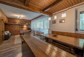 Wohn-und Essraum: großer Esstisch mit Eckbank, ausziehbare Couch und TV;