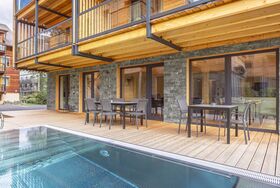 3a mit Sauna & Pool, 5-Zimmer-Wohnung 112 m2, im Erdgeschoss. Geräumig und hell, geschmackvoll eingerichtet: Wohn-/Schlafzimmer mit Essecke und Sat-TV (Flachbildschirm). 1 Doppelzimmer mit Dusche/WC. 1 Zimmer mit 1 x 2 Etagenbetten, 1 Doppelbett. 2 Doppelzimmer. Offene Küche (Backofen, Geschirrspüler, 4 Glaskeramikplatten, Mikrowelle, Grill, elektrische Kaffeemaschine). 2 Duschen/WC, sep. WC, Sauna. Grosse Terrasse 70 m2. Terrassenmöbel. Schöne Sicht auf die Skipiste und die Landschaft. Zur Verfügung: Internet (Wireless LAN, gratis). Bitte beachten: Nichtraucher-Unterkunft. Beim Mietobjekt handelt es sich um ein Typenhaus bzw. Um eine Typenwohnung. Das Appartement verfügt über einen privaten, beheizten Pool auf der Terrasse.
